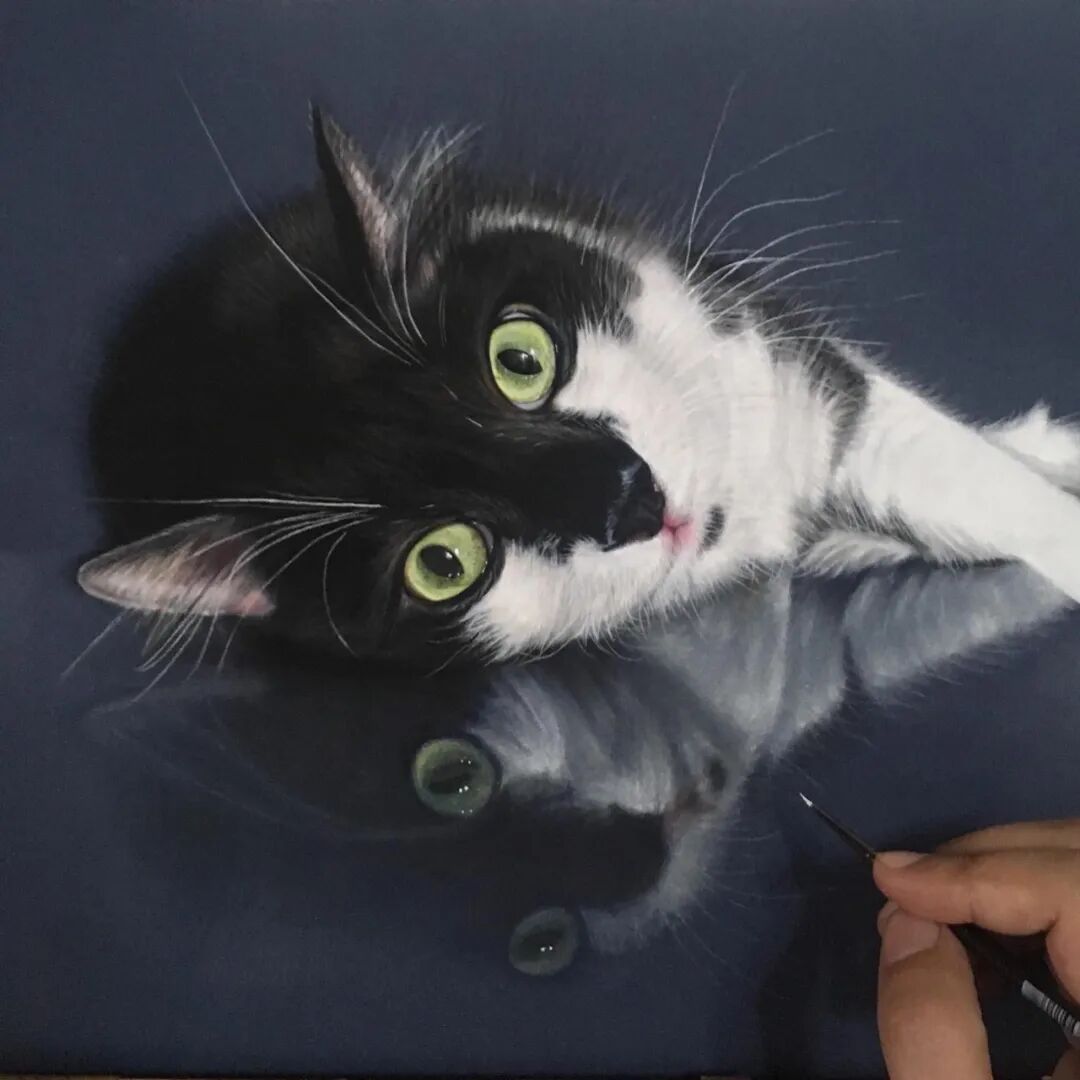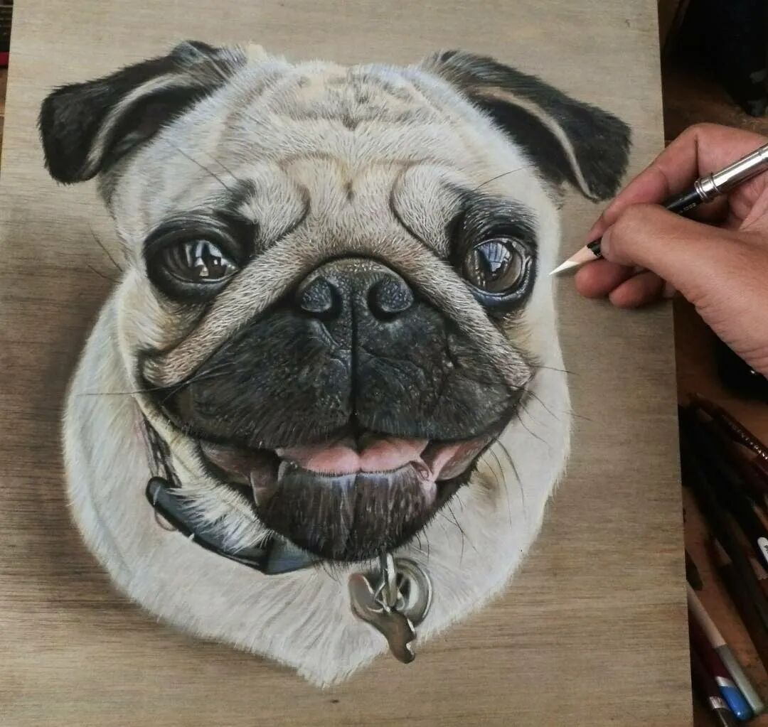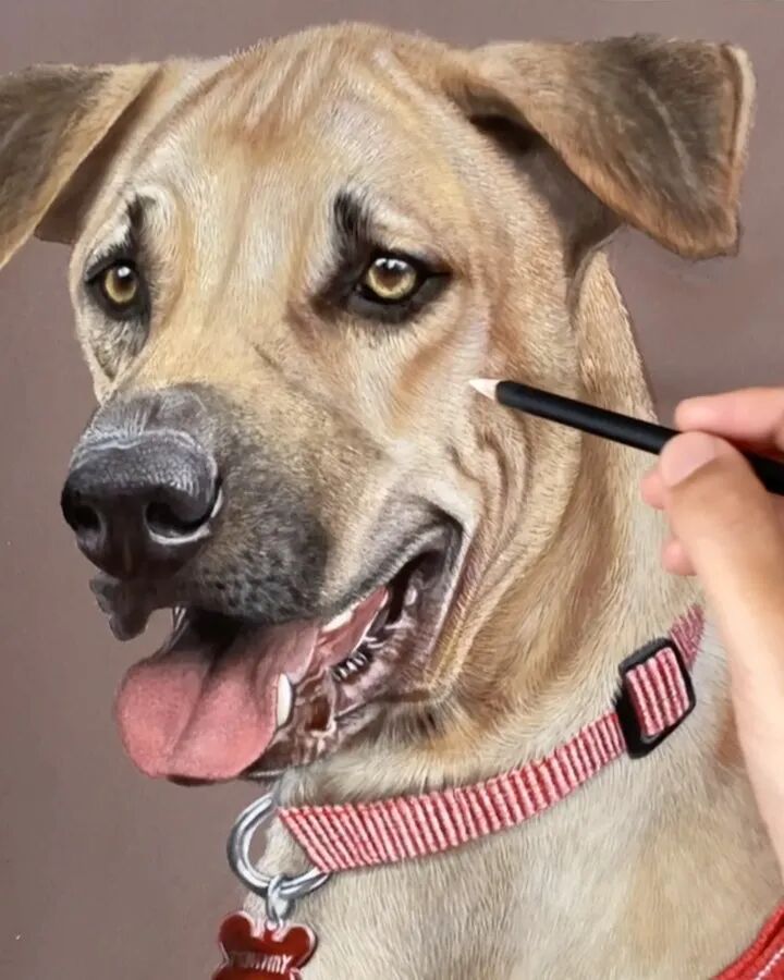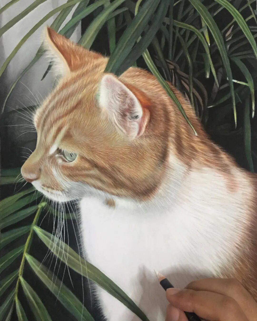 更有甚者,还会为自己家里的特殊成员,定制写实肖像画,比如宠物猫,或者宠物狗。今天小绛要介绍给大家的这位超写实绘画,来自新加坡的自学成才的艺术家伊万·胡,就非常擅长绘制宠物写实肖像画,他使用彩色铅笔、丙烯颜料与墨水等多种材料,在木板上绘制逼真的动物肖像,多种媒体的结合,也让画作有着更丰富的细节和层次。