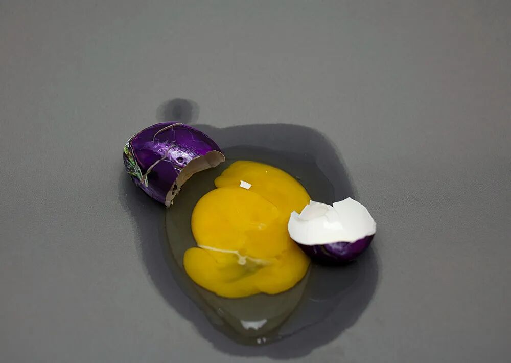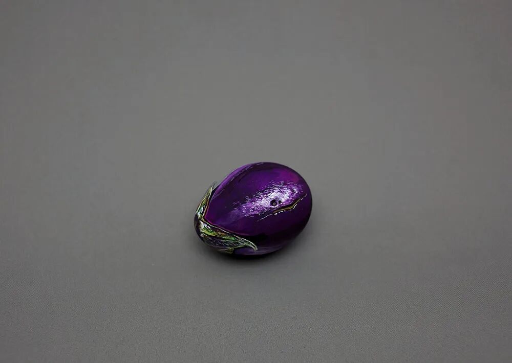 打眼看过去,艺术家画的是一颗有着油亮外皮的桔子,切开看到里面后才发现实际是一个西红柿;还有,外表看起来是一个紫茄子,让人想不到的是,竟然可以把皮磕开,原来它的“本性”是一枚有着坚硬外壳的鸡蛋......诸如此类的“伪装”食物作品,町光绘制了一整个系列。