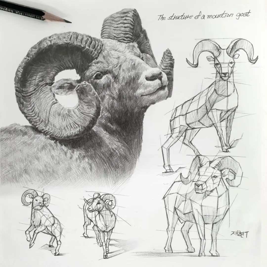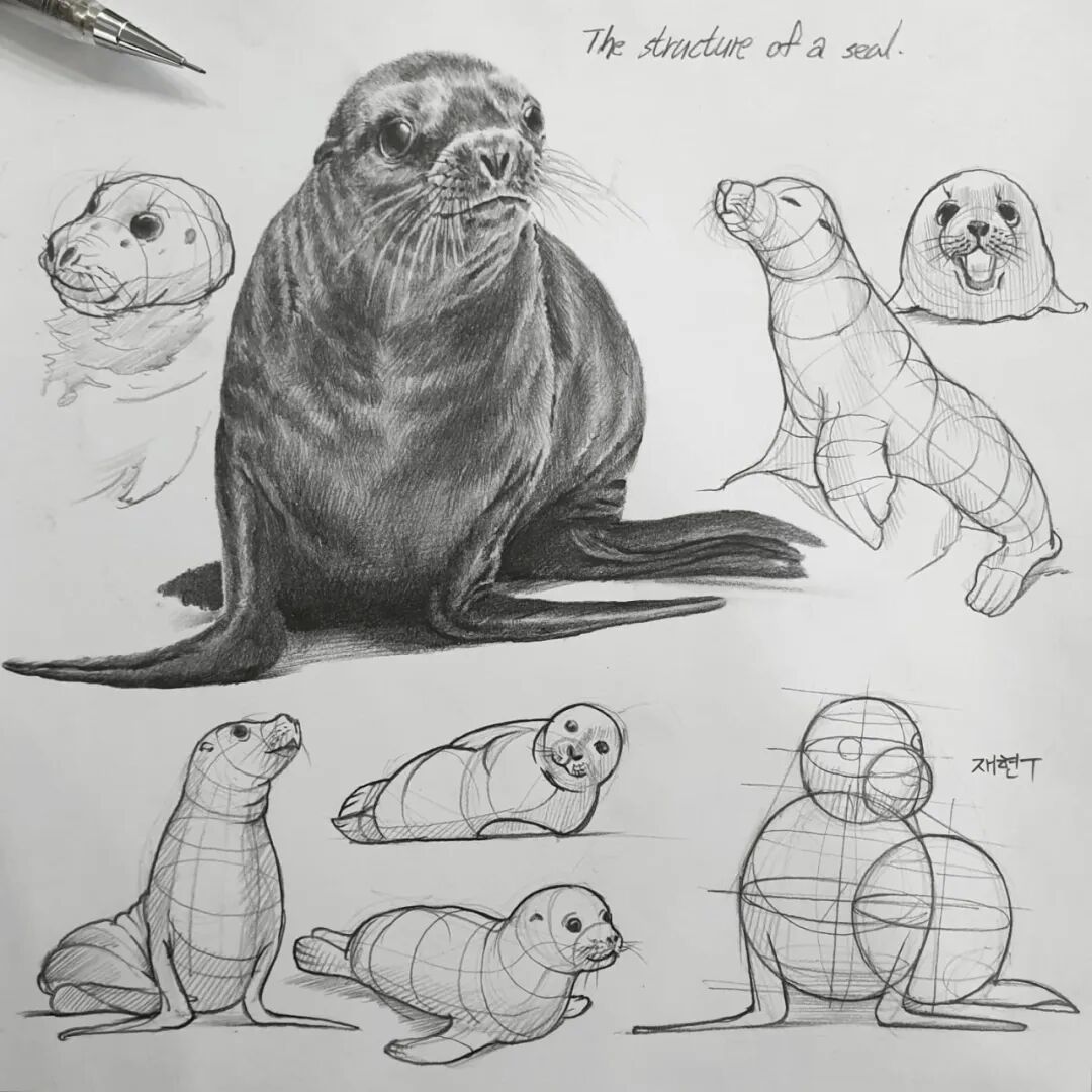 在我们欣赏完安宰贤的绘画作品后,你就会发现,其实动物素描一点都不难画,从结构上进行拆分,每一种动物都是由几个圆形和几何形状组成,将几何形状组织好,动物大概的形体也就呈现出来了,剩下的就交给耐心和时间将它们完善出来。