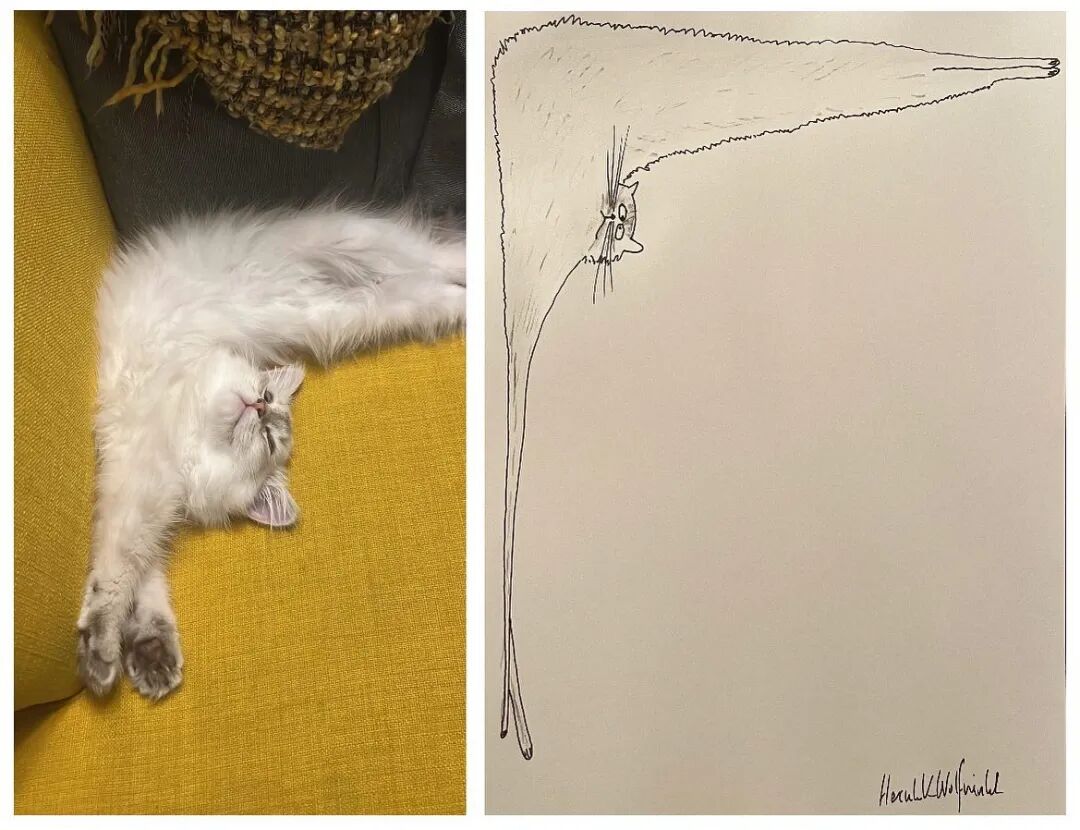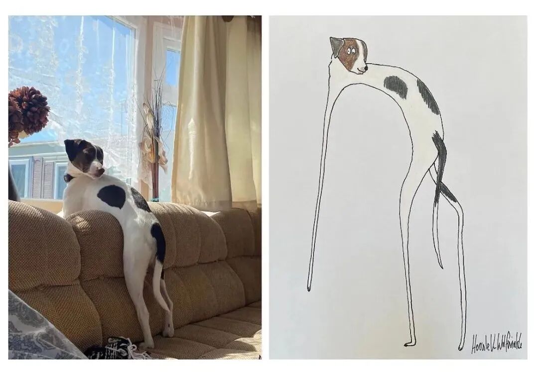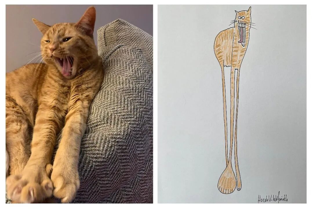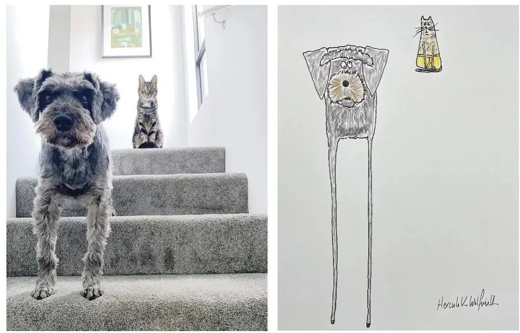 从菲尔·赫克斯的涂鸦作品上,我们没有办法判断,他究竟会不会画画,要是说他会画画吧,他的涂鸦作品造型极其不准确,猫的身体和狗的四肢都十分夸张。要是说他不会画画吧,他又能准确抓住每一只宠物的特征,并一直保持和延续这种绘画方式,进而通过这些作品给人带来快乐,这个能力就连一些专业的艺术家都不具备。