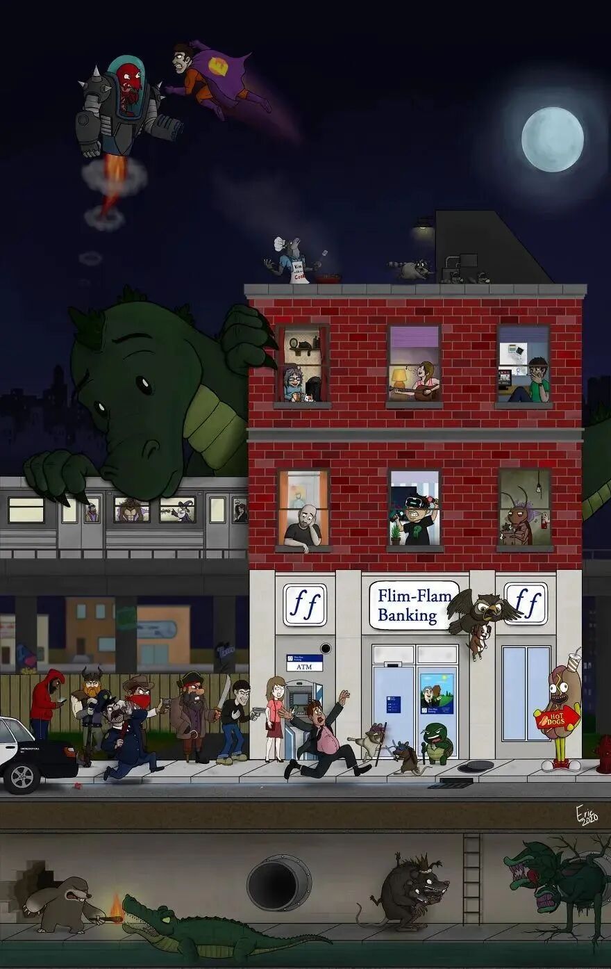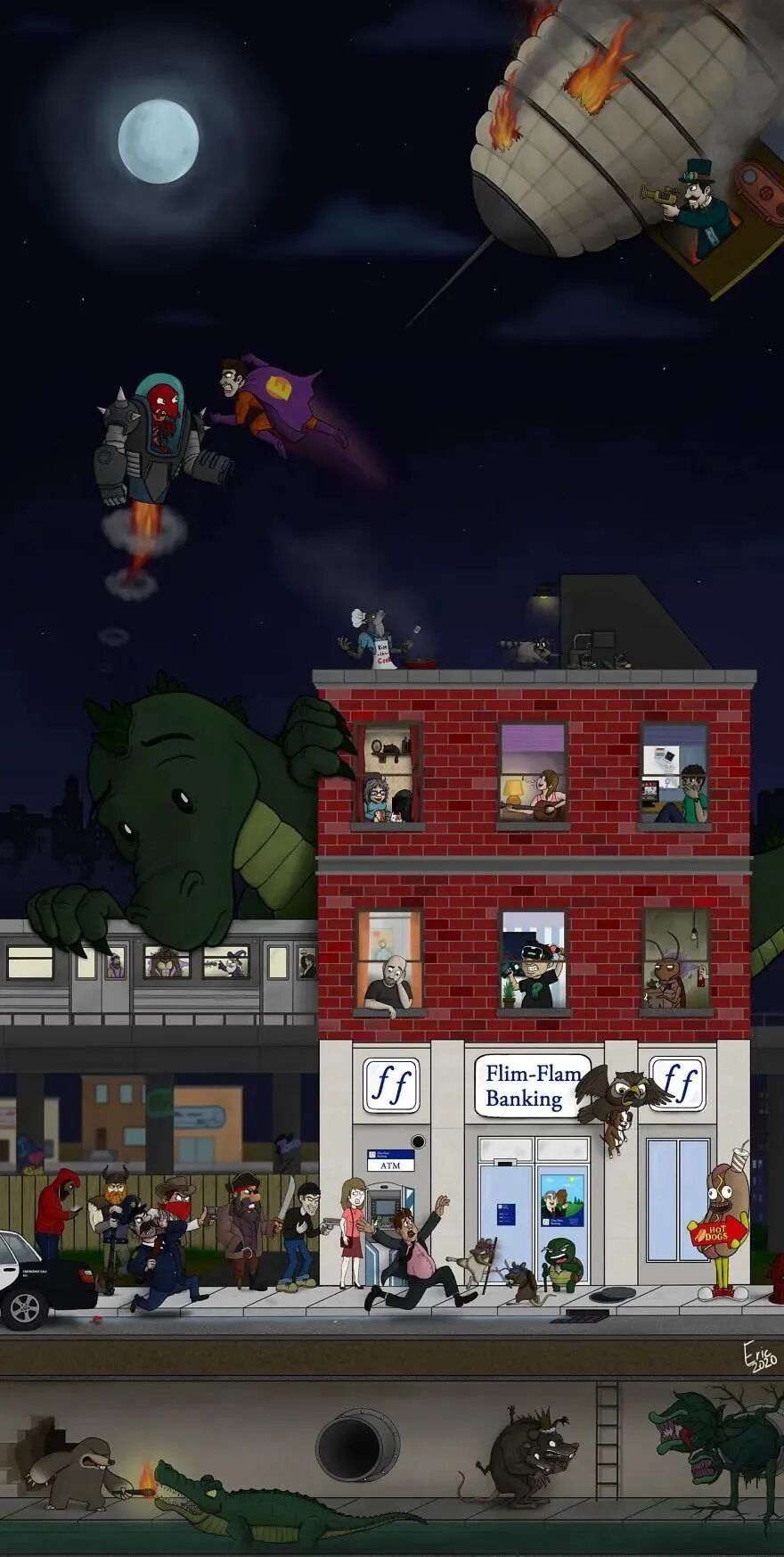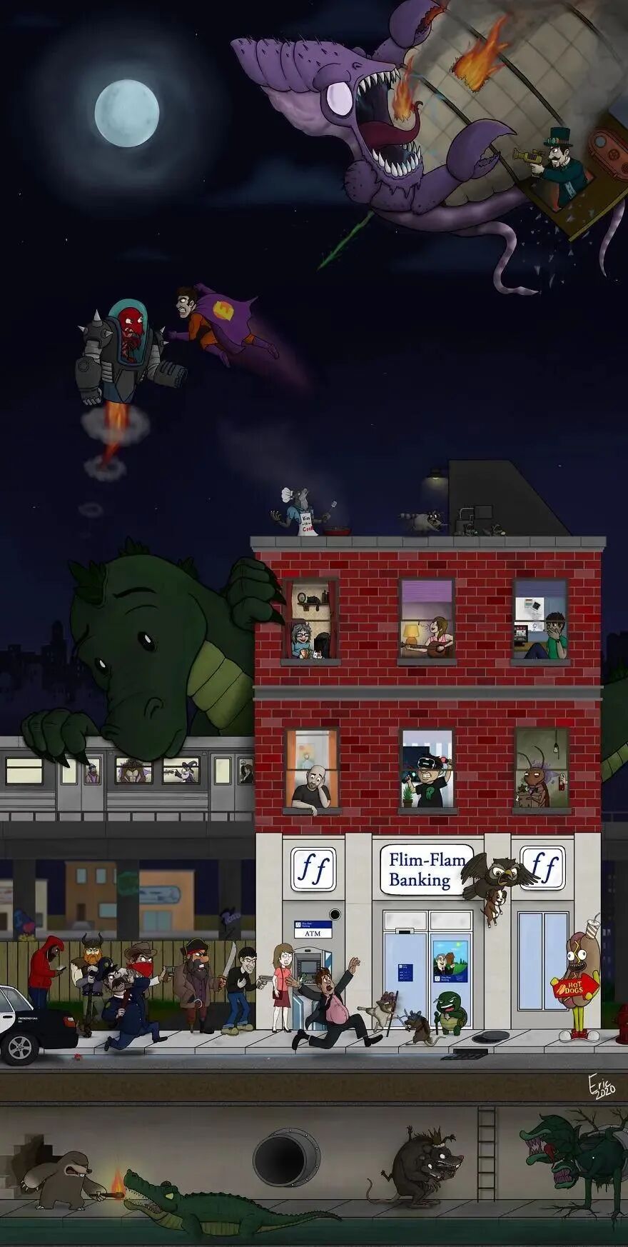 有点连环画的感觉,这对于艺术家来说,是一个训练想象力的过程,对观众来说,则是一个猎奇的过程,随着艺术家一点一点添加画面,故事剧情也一步一步在推进,看完这组作品,就好像看了一部完整的动画片。