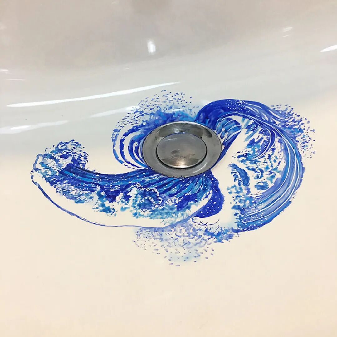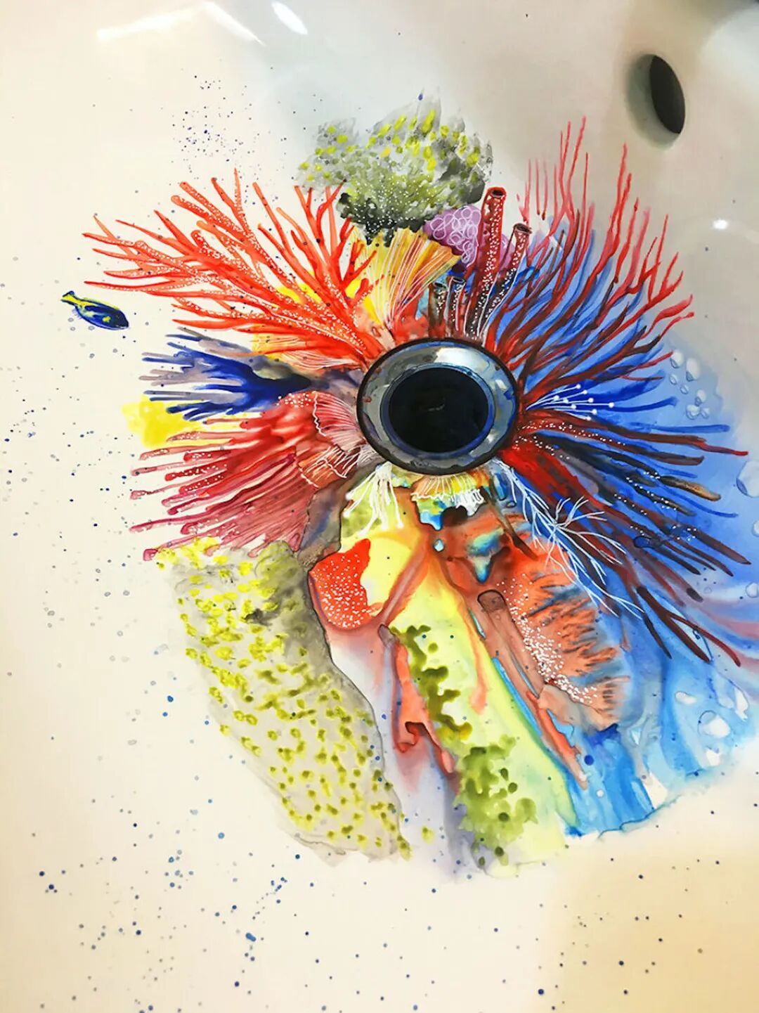 这位名叫玛塔·格罗西的艺术家,在无聊宅家的日子里,创作了一种别样的艺术作品,她用水槽代替画布和画板,画出了一系列脑洞大开,充满创意的绘画作品。只不过,这些水槽中绽放的画作,生命周期十分短暂,只要打开水龙头,它就立刻消失了。