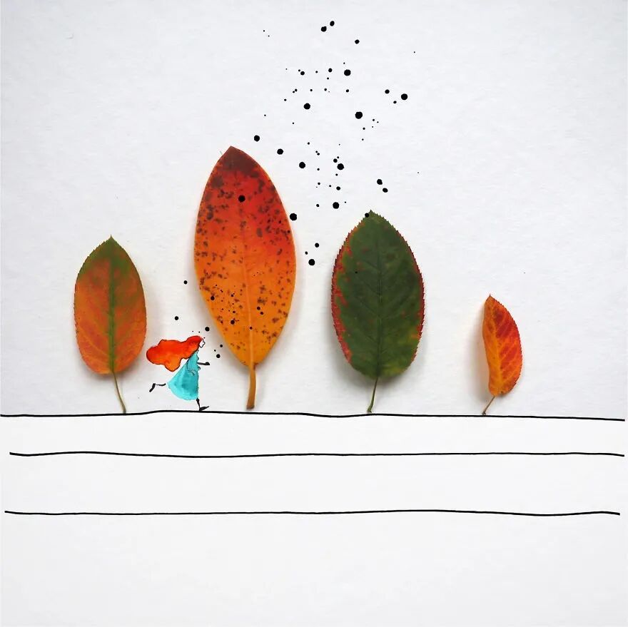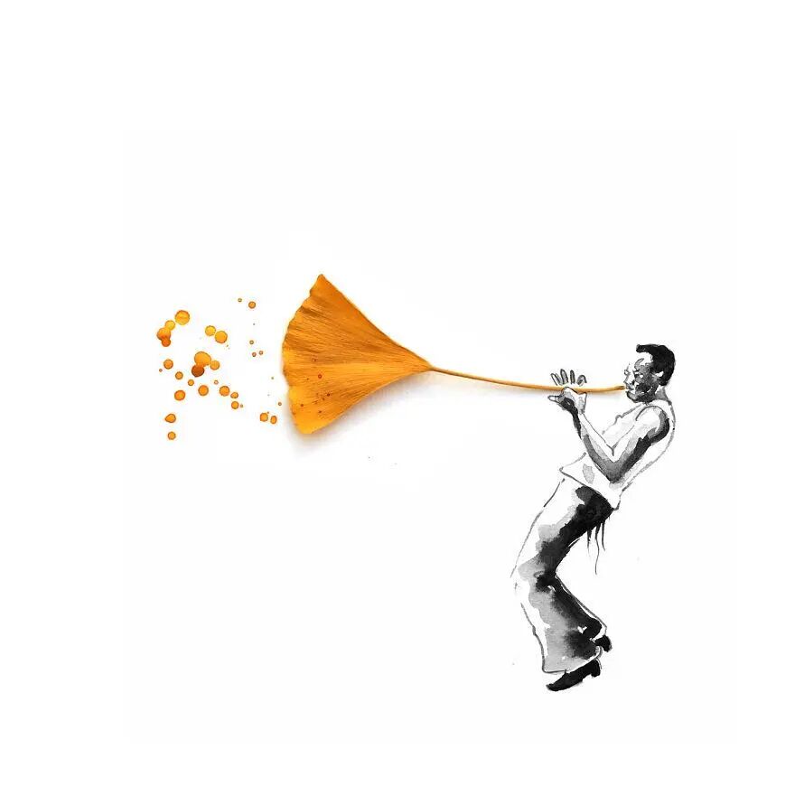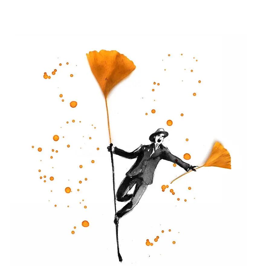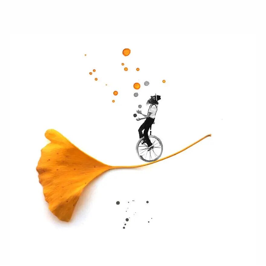 最后一步,这位艺术家会用数字技术将水彩与树叶组合在一起,形成有趣的场景,创意与趣味性满分。据小绛了解,这位艺术家每年都会做一系列关于秋天的插图,因此,受到今年当季的启发,他决定收集银杏叶,拍摄它们,然后添加水彩插图来致敬秋天。