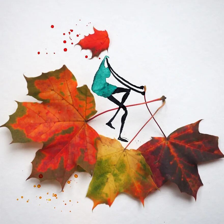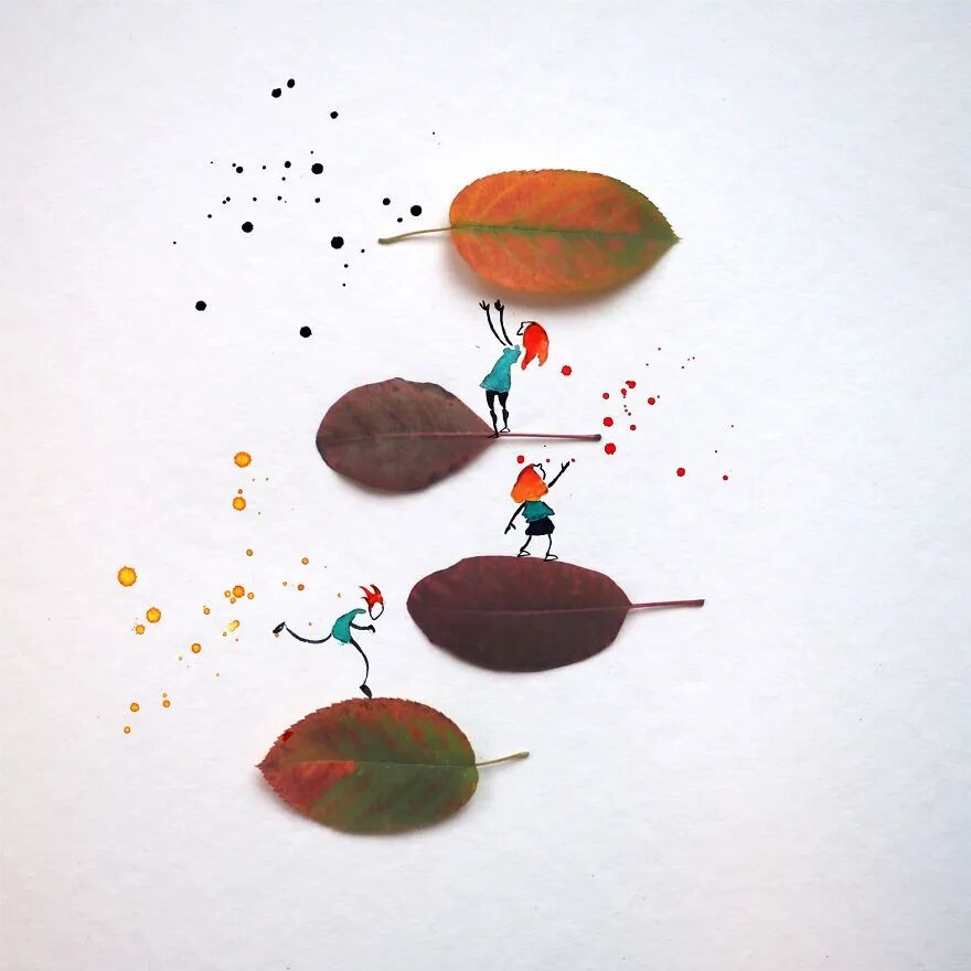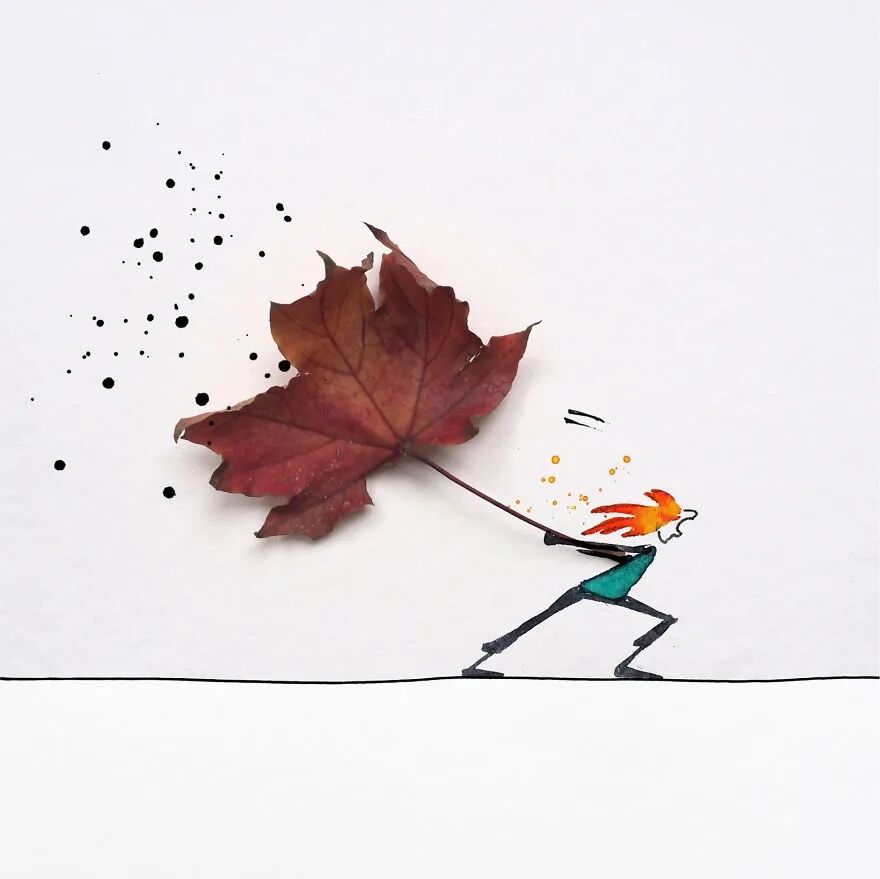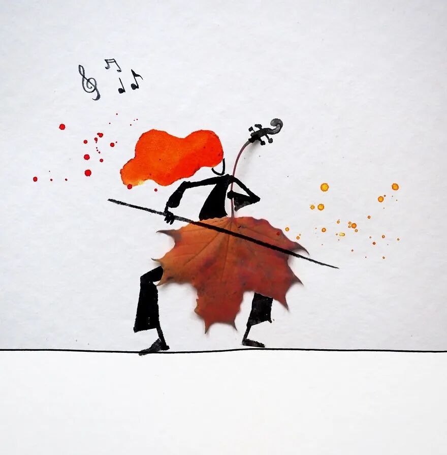 最后一步,这位艺术家会用数字技术将水彩与树叶组合在一起,形成有趣的场景,创意与趣味性满分。据小绛了解,这位艺术家每年都会做一系列关于秋天的插图,因此,受到今年当季的启发,他决定收集银杏叶,拍摄它们,然后添加水彩插图来致敬秋天。