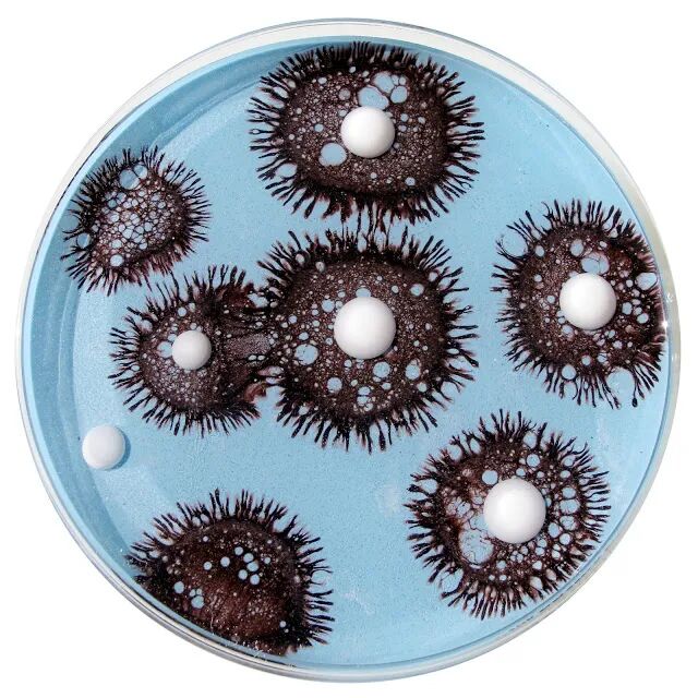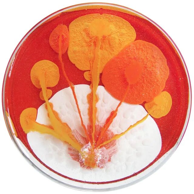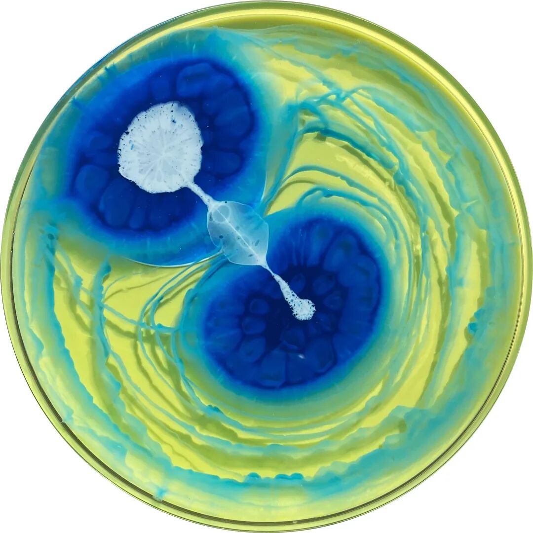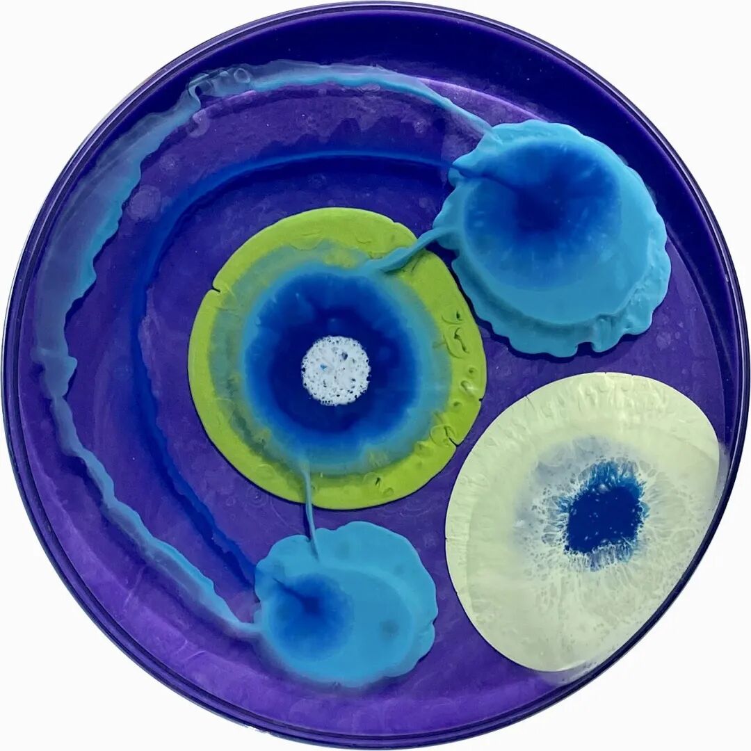 为了更好的仿照细菌的模样,克拉丽·赖斯在培养皿中绘画的时候,需要使用多种颜料,利用它们不相融的特点进行创作,每一幅细菌画都非常精彩,接下来就让我们一起来欣赏一下吧。