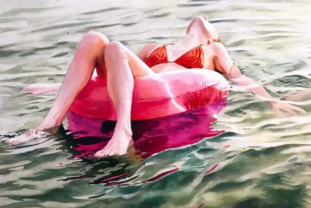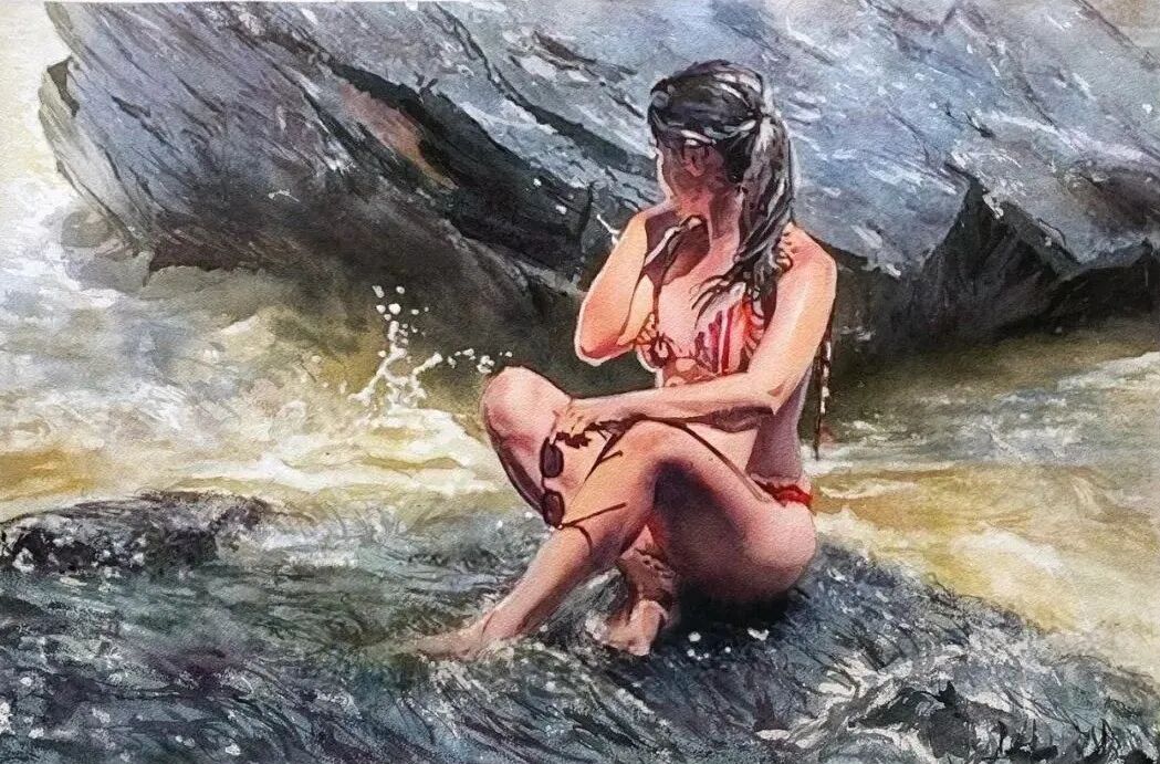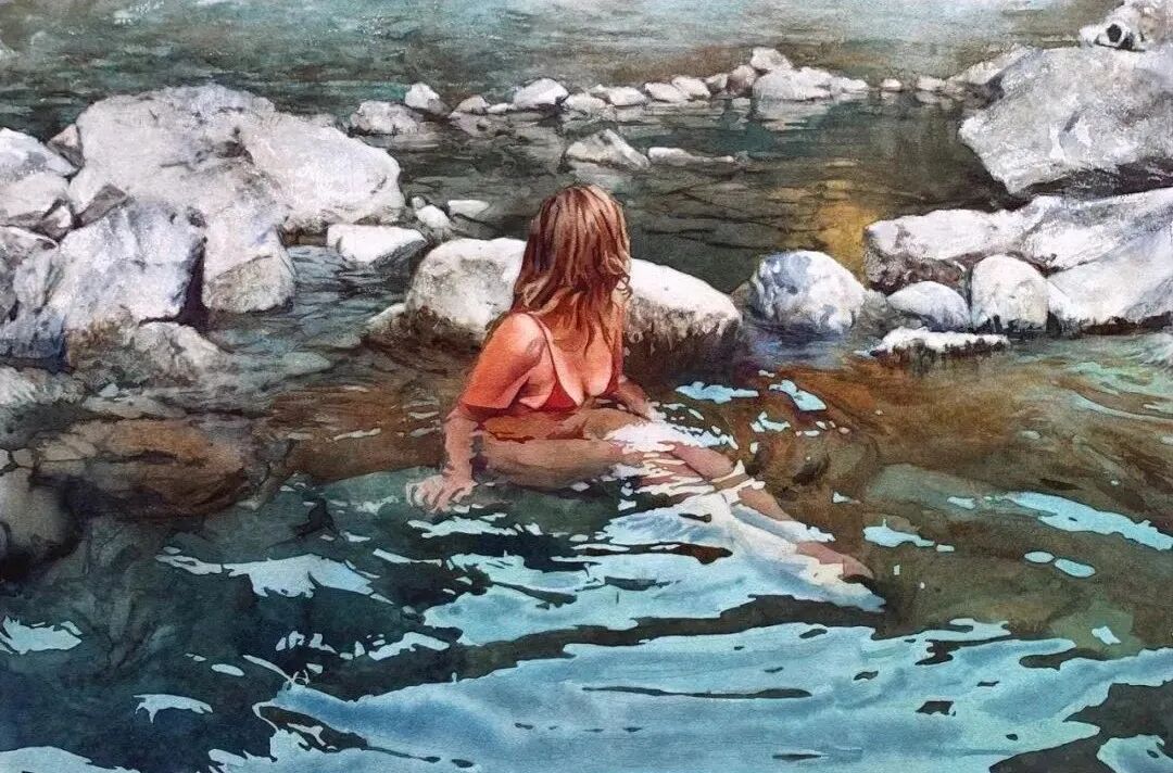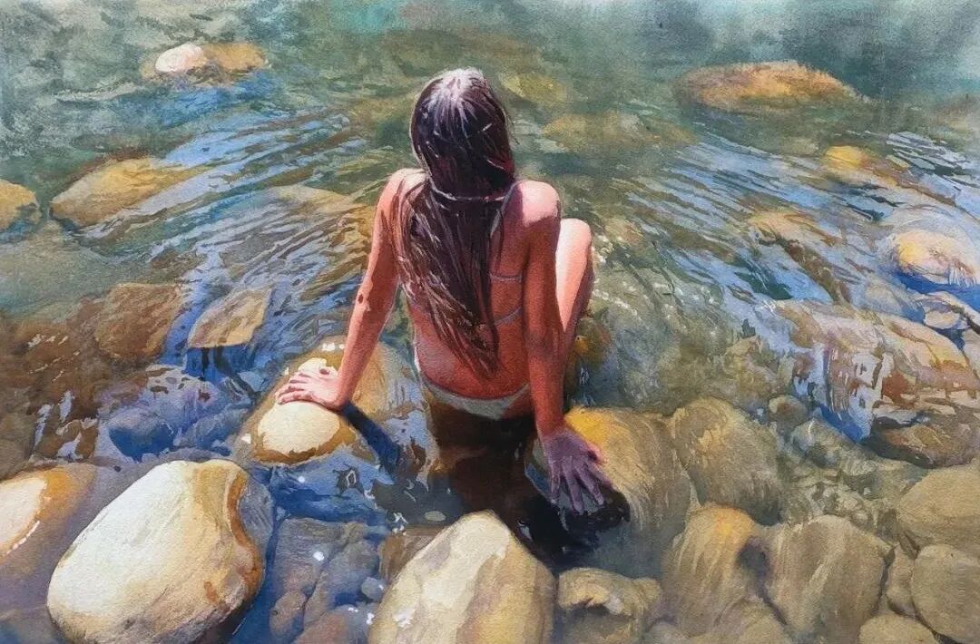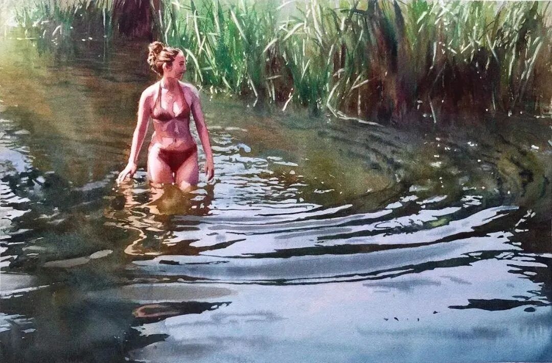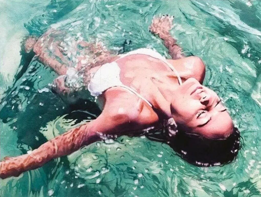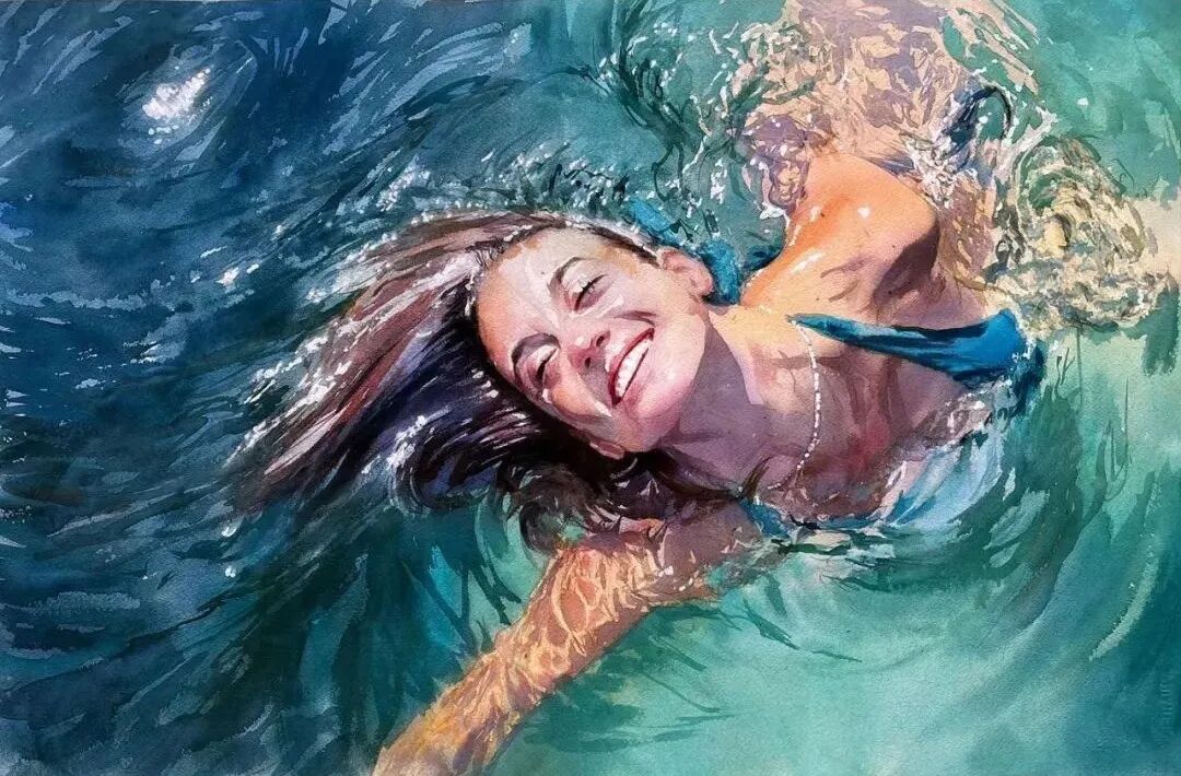 哲学和平面设计,看似和水彩没有关联,却被这位水彩画家都应用到了自己的绘画作品中,有了这两点作为支撑,他的作品一定不会差。接下来,就让我们一起来欣赏一下这位会设计的哲学家,用水彩描绘的水中美女画作吧。