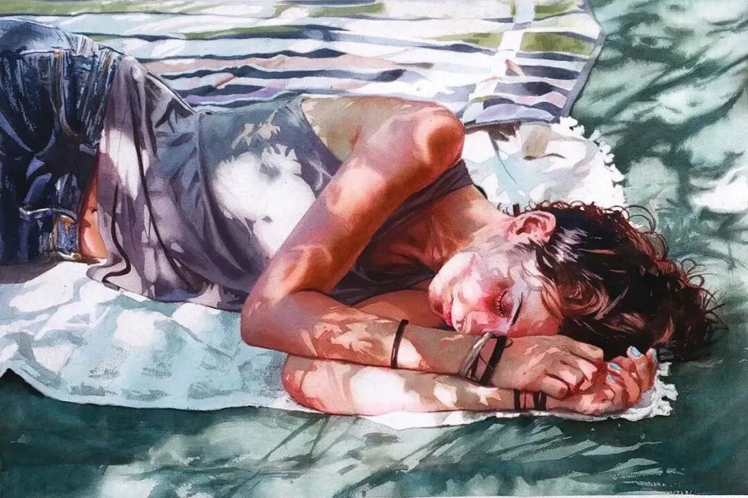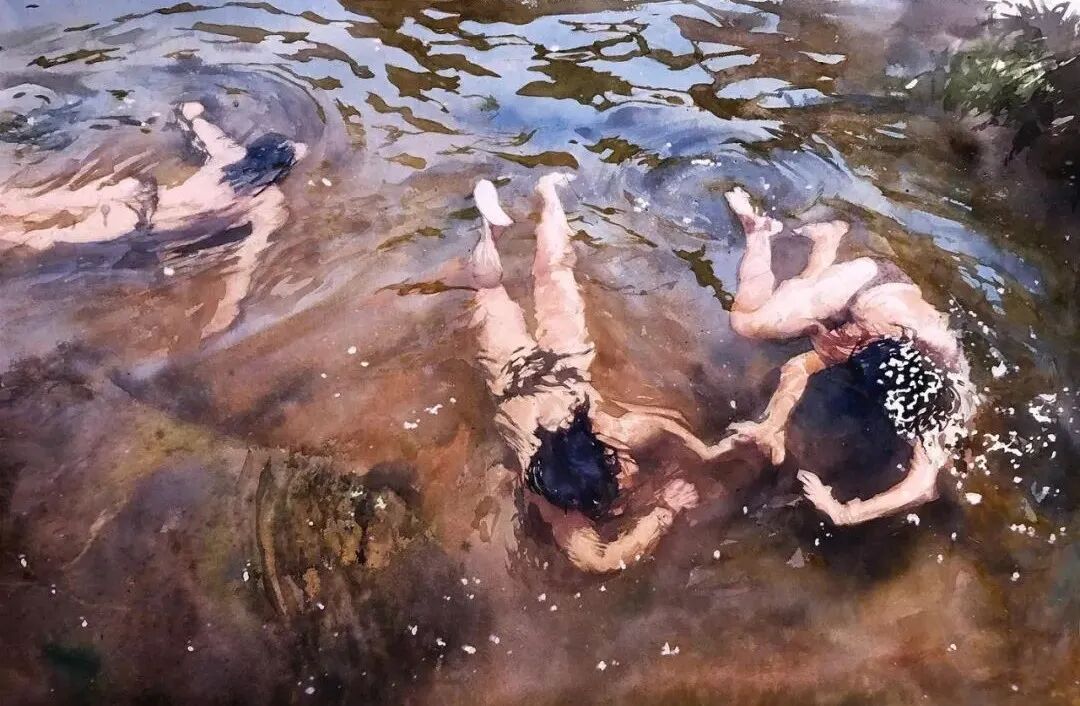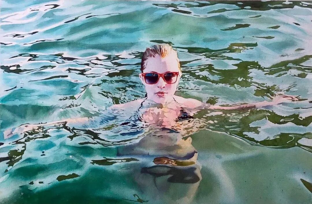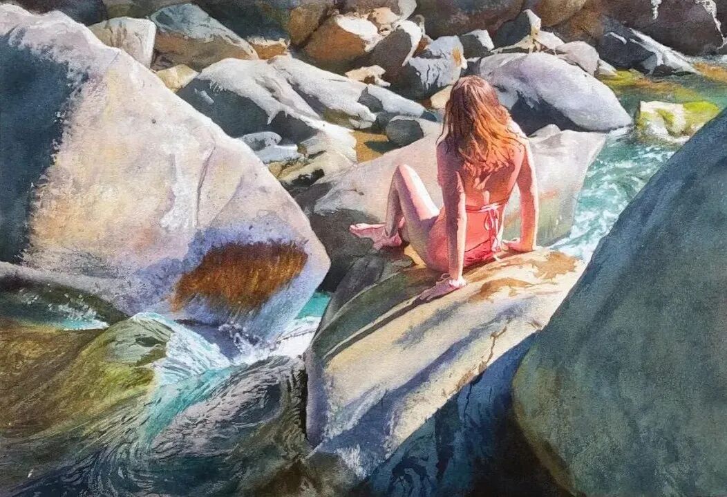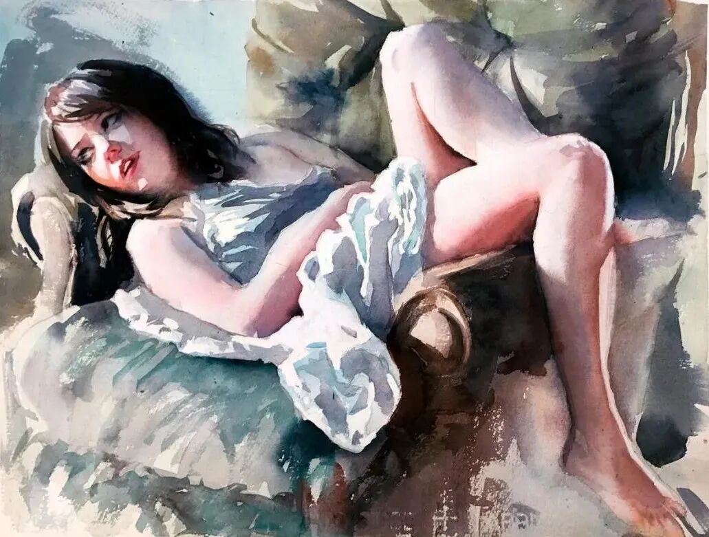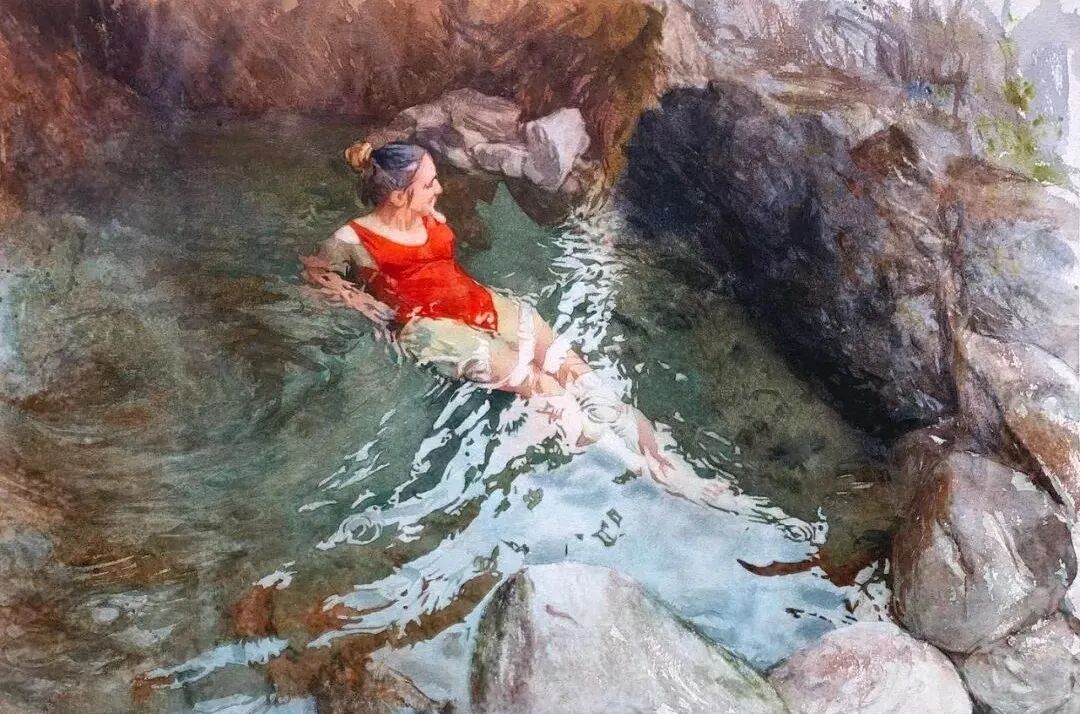 哲学和平面设计,看似和水彩没有关联,却被这位水彩画家都应用到了自己的绘画作品中,有了这两点作为支撑,他的作品一定不会差。接下来,就让我们一起来欣赏一下这位会设计的哲学家,用水彩描绘的水中美女画作吧。