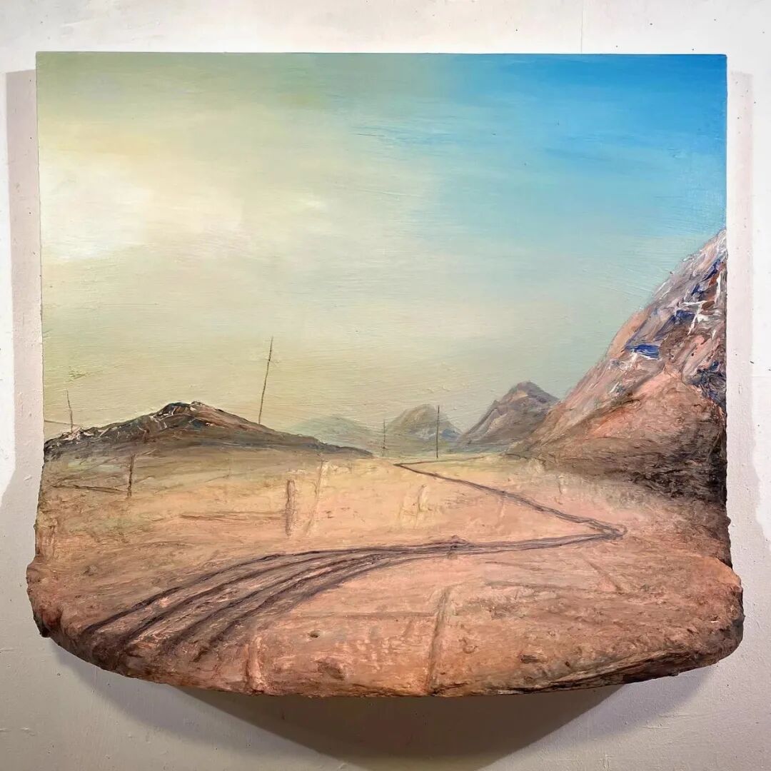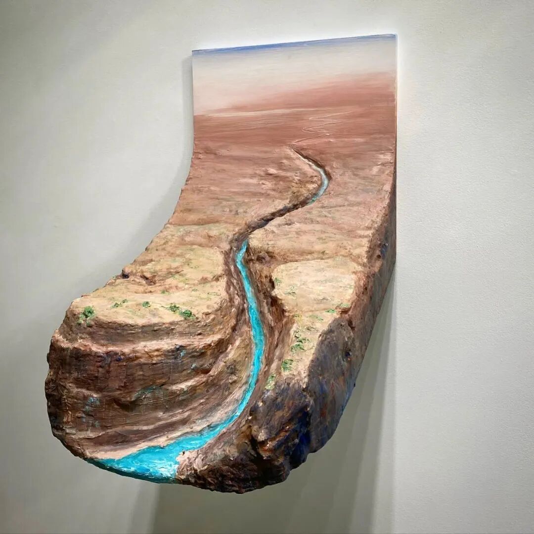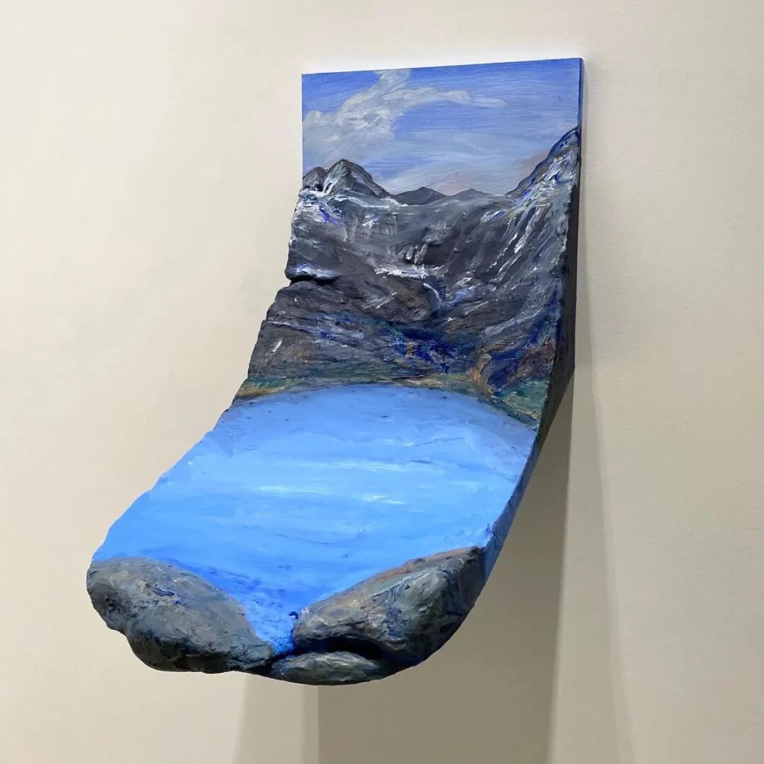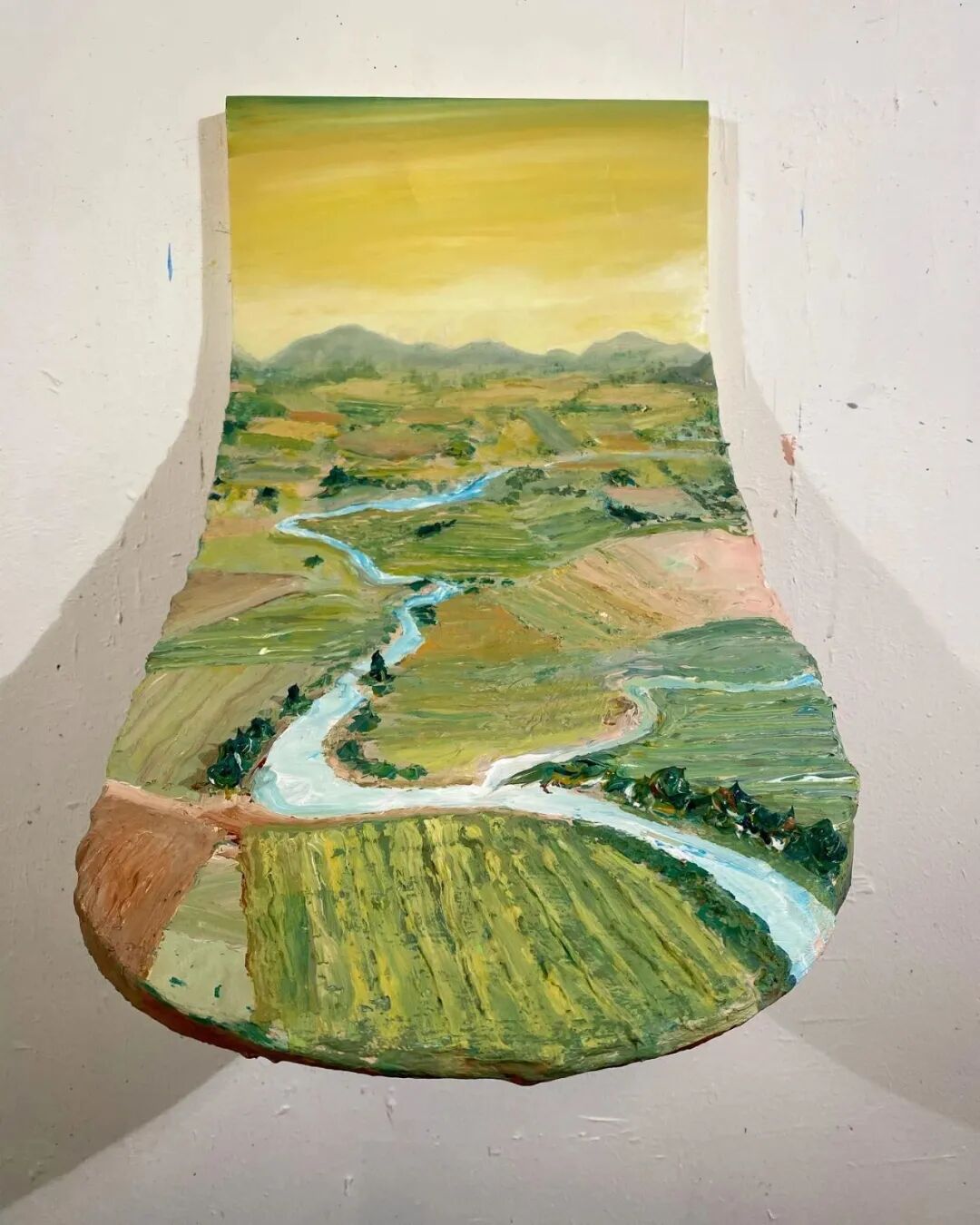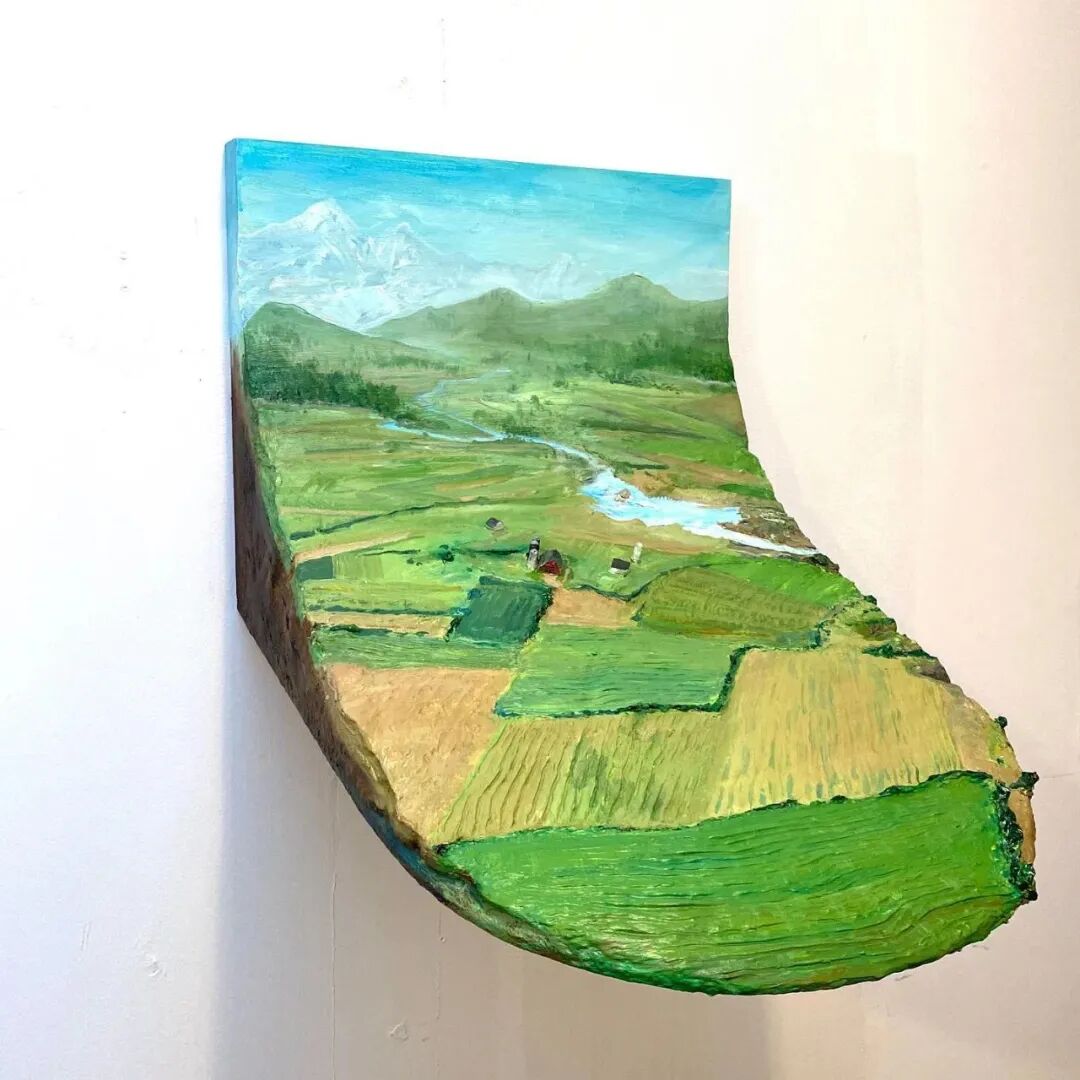 从巴里·哈扎德画作最中心的位置去欣赏这些风景画作,我们看不出太多异常的地方,如果我们换一个角度去欣赏这些作品,它就会给我们带来一个大大的惊喜,层峦叠嶂的山峰和一望无际的草原,从画框中跳了出来,让我们可以真实地触摸到它们。