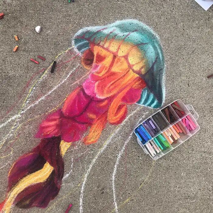 她们的作品有着惊人的立体感和真实感,在特定的角度看上去,就像真实的一样,为了使这些彩色粉笔作品更加栩栩如生,简·里金斯首先会画出草图,并用黑色的底漆进行填充,接下来的步骤,就是与女儿一起绘制色彩部分。她们会在一个作品上花费好几个小时的之间,不断地修改、调整,直到她们对结果绝对满意的程度。