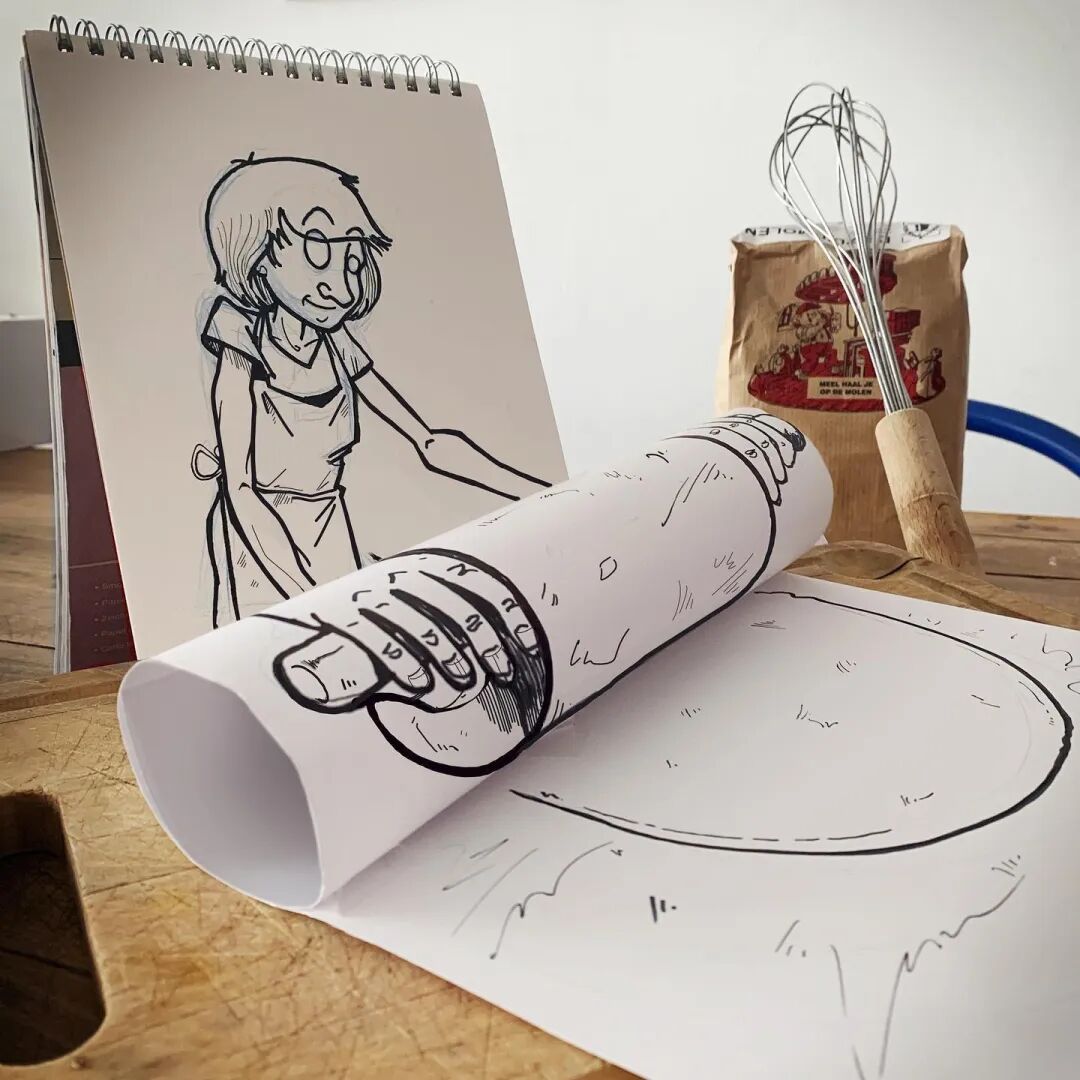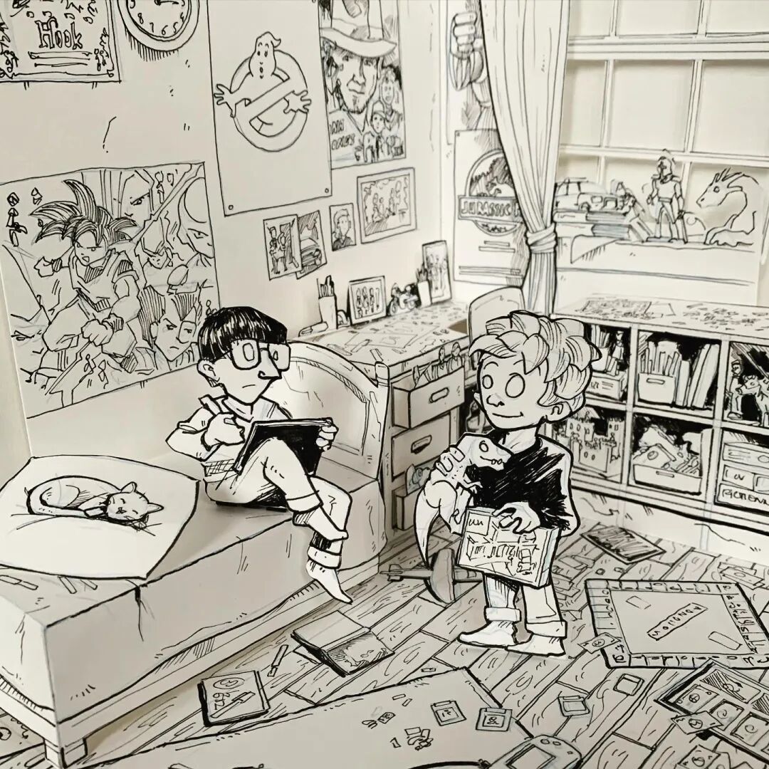 大卫·特罗奎尔的创作灵感,大都是在对生活的细微观察中得到的,有时候在路上走着,看到街边的某个物品,脑子里突然出现一个有意思的画面,他就恨不得赶紧跑回家,如果手里恰好有纸笔,他也会蹲在马路上,将它描绘出来。及时抓住这个灵感,对于后面的“搭建”3D场景是非常重要的。