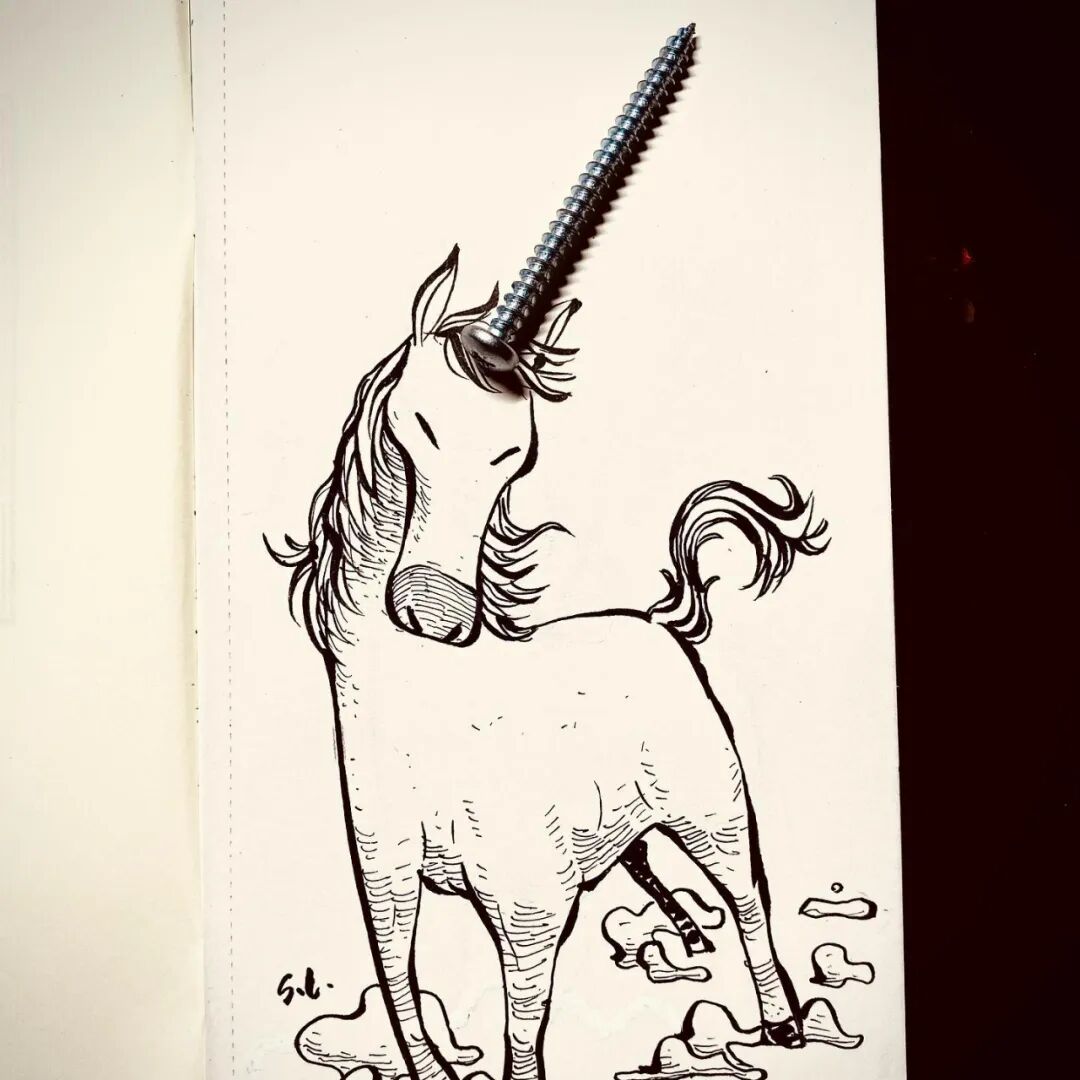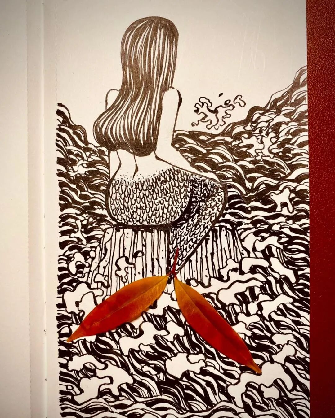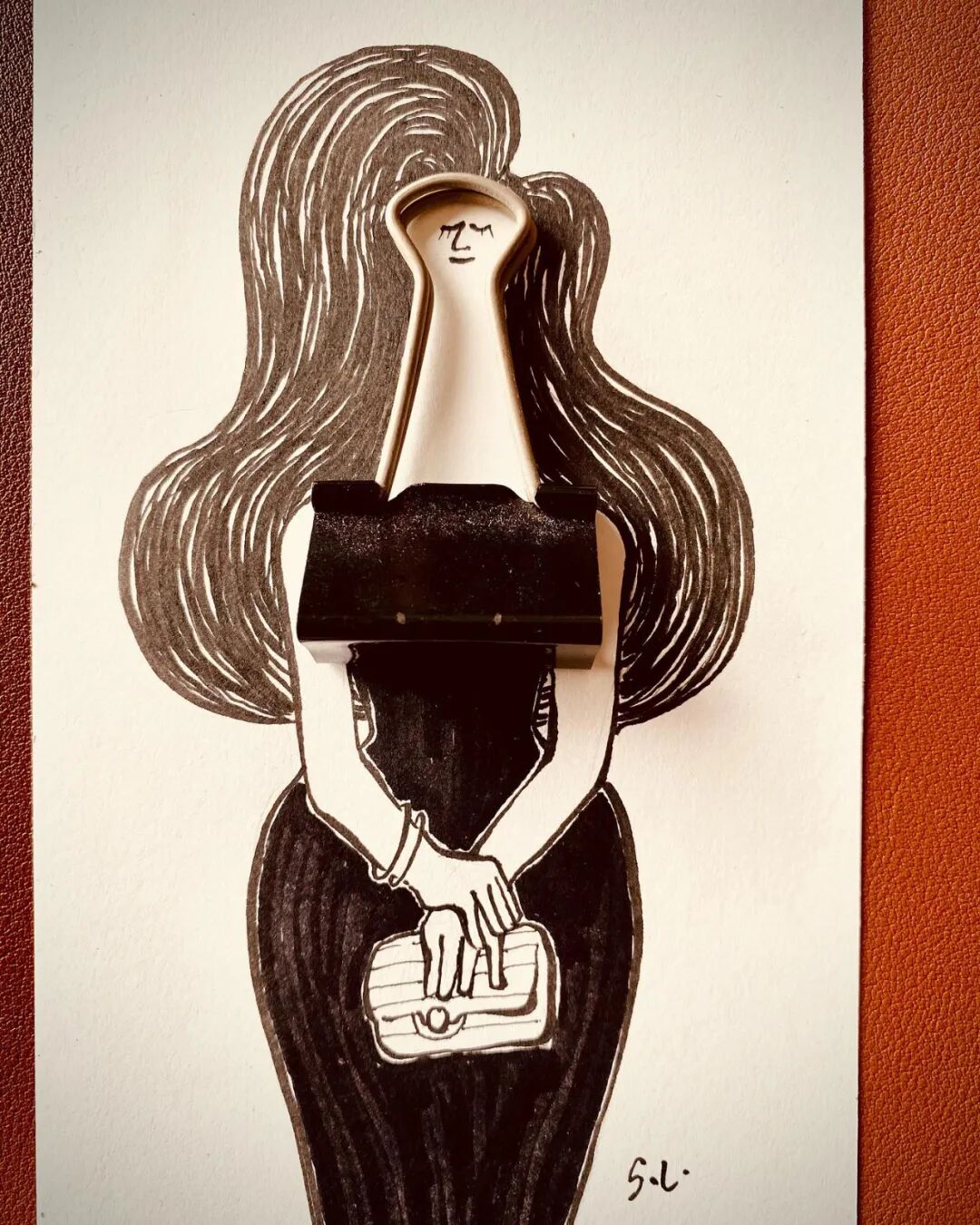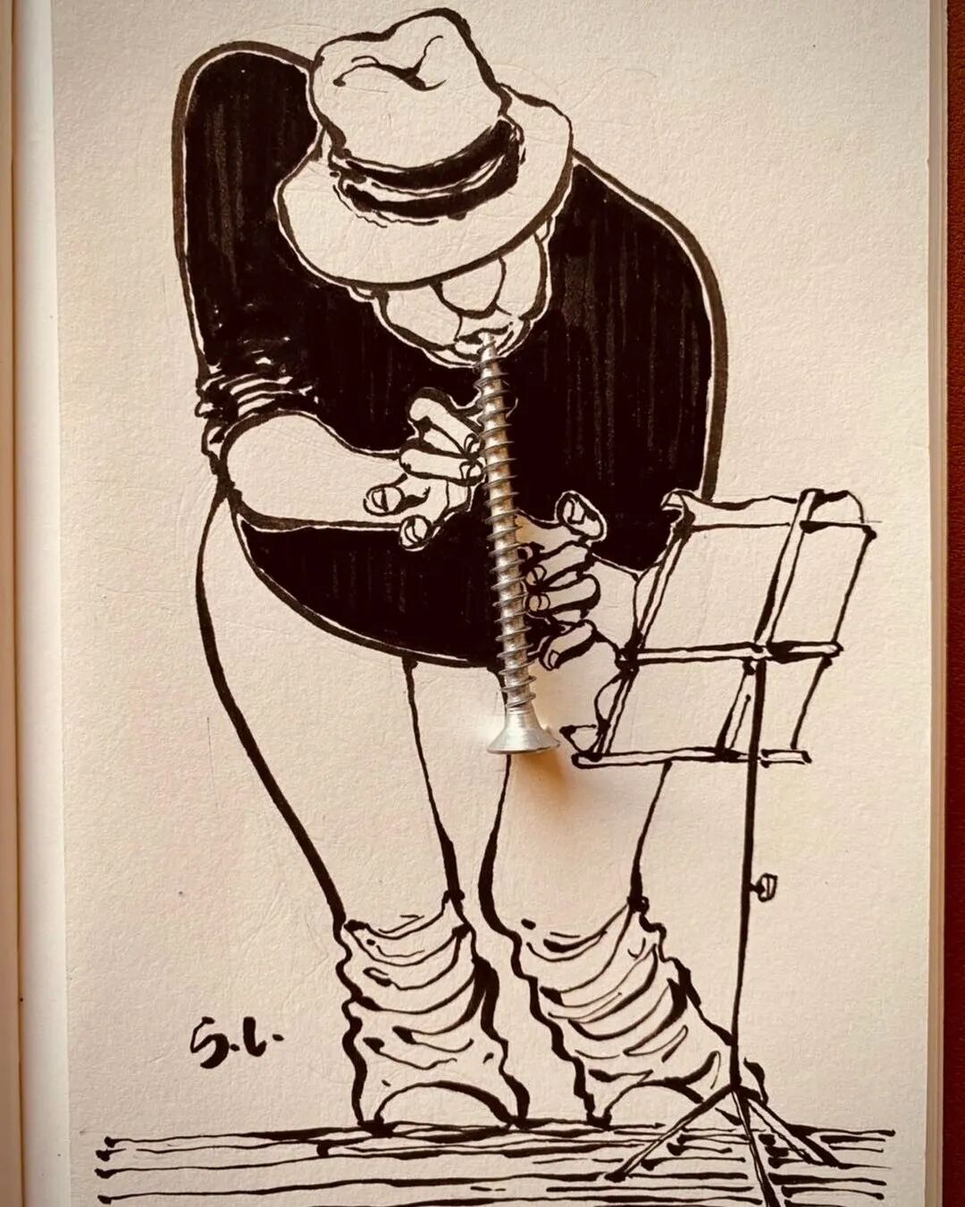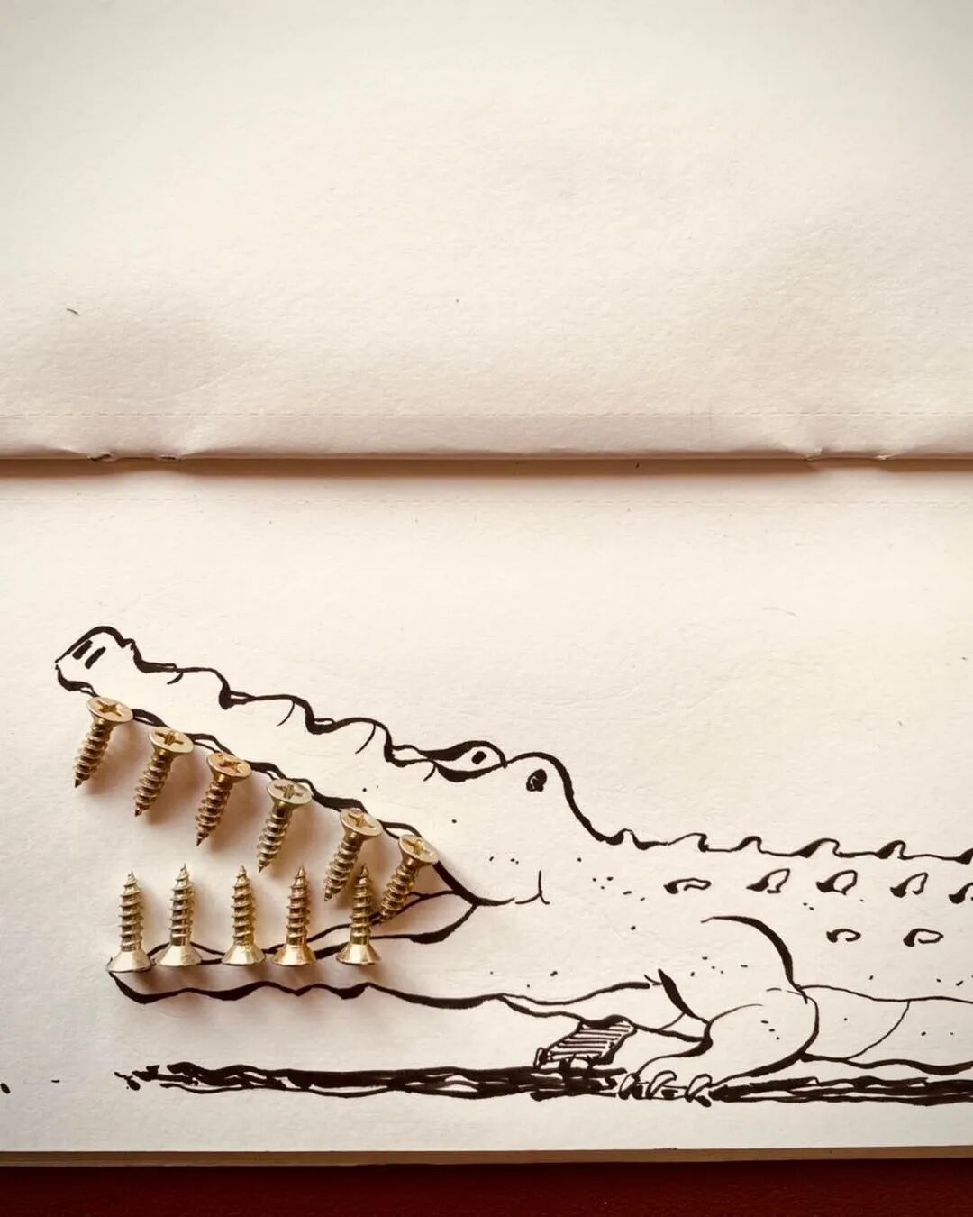 起初,山姆·莱只是在纸上画二维的趣味涂鸦,但是画着画着,就感觉这种方式缺乏创意,甚至还有一点无聊,他开始尝试在画作中加入一点东西,增加一点趣味性。于是,他的涂鸦画作变成了二维与三维的结合,生活中的一切平凡物品都可以被他融入其中,比如牛角包、树叶、螺丝钉等等,这些真实的物品充当画面中的一部分,比如,耳机变成牛角,硬币变成哑铃,螺丝钉变成鳄鱼牙齿......
