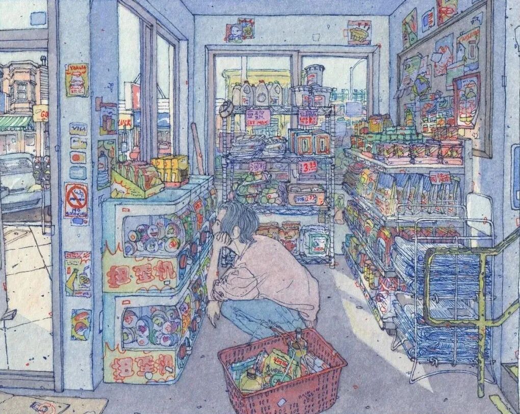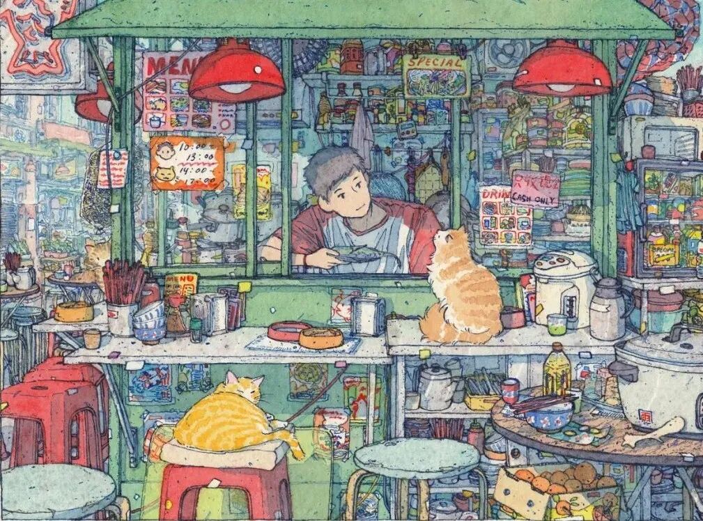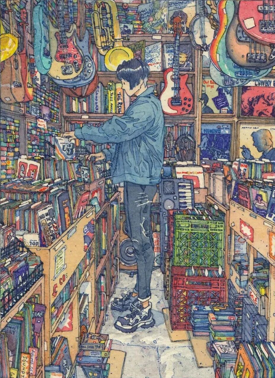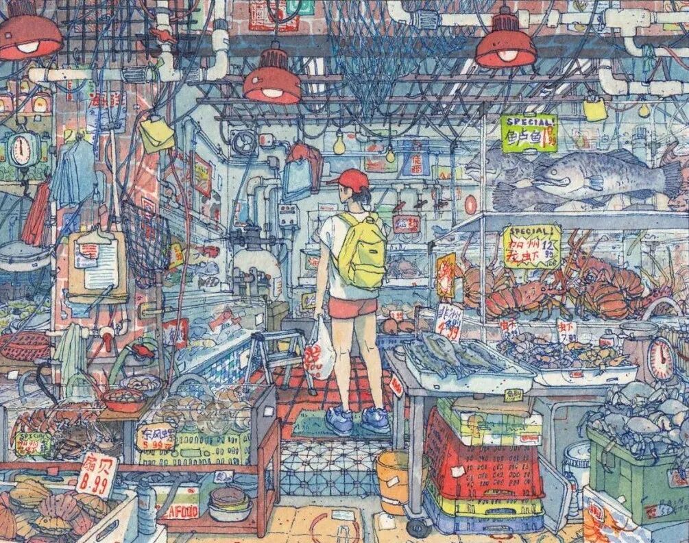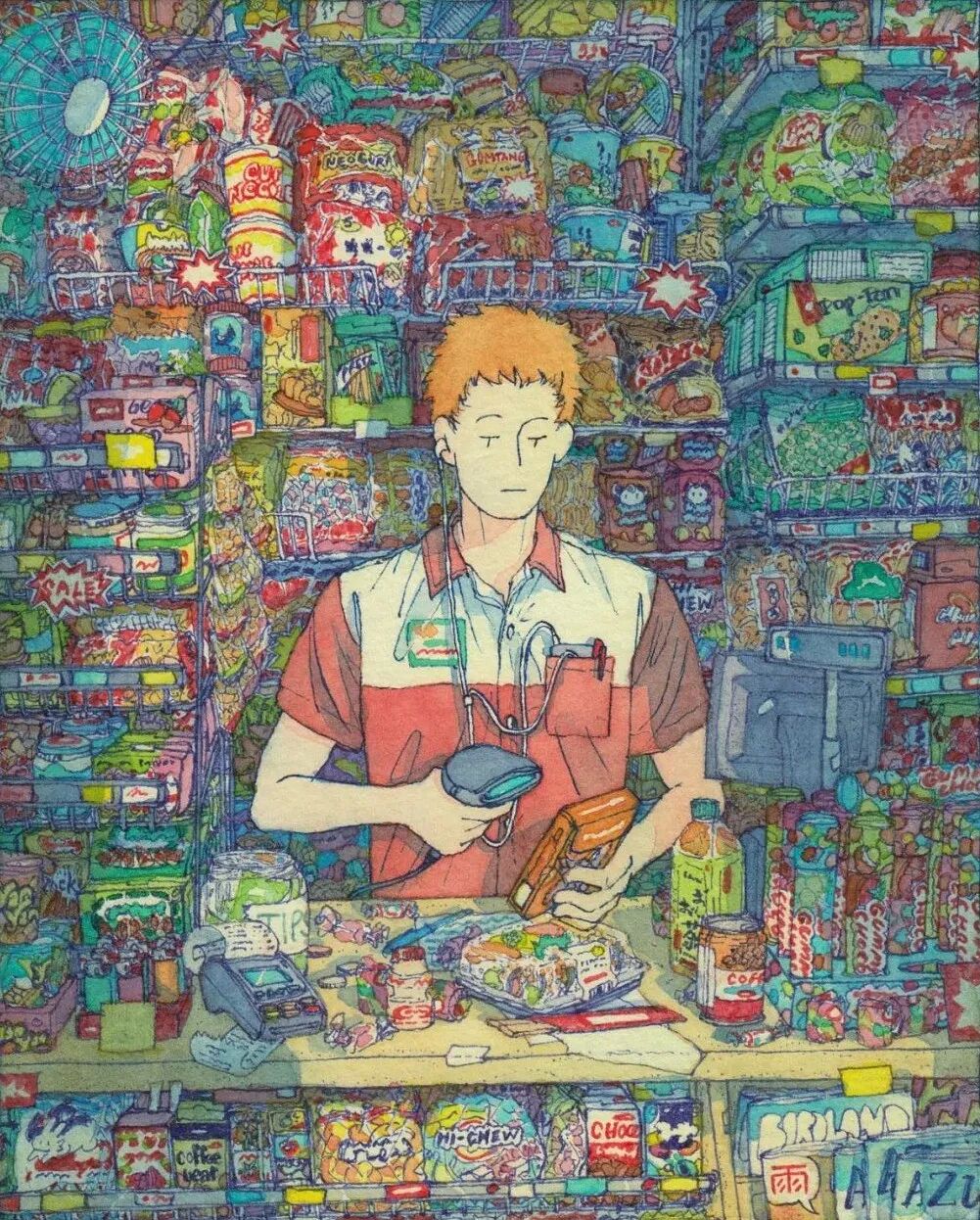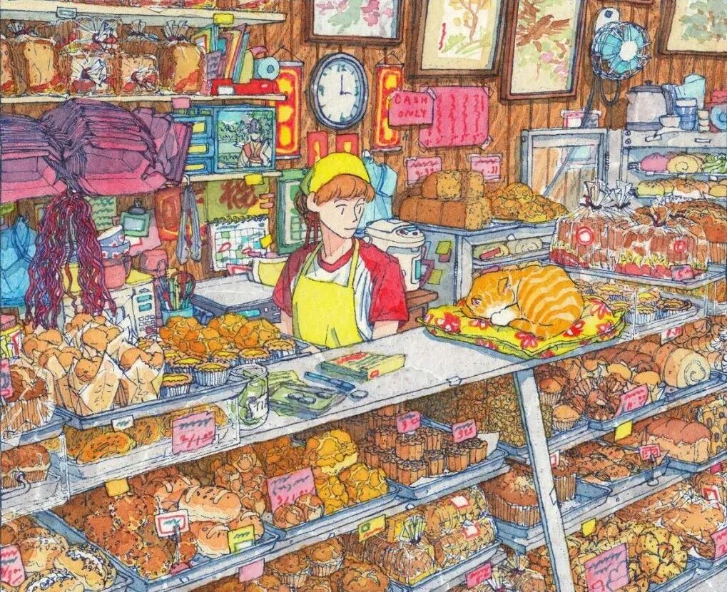在司徒雨的绘画作品中,我们可以看到大量且复杂的场景,这些场景是成堆的书籍、零食和玩具,以描绘商店和居住的家中为主,在复杂的画面中,却给人带来一种莫名的稳定和秩序感,并不会让人感到混乱,复杂的画面更能吸引我们的目光一点点地去观察与欣赏这些插画作品。