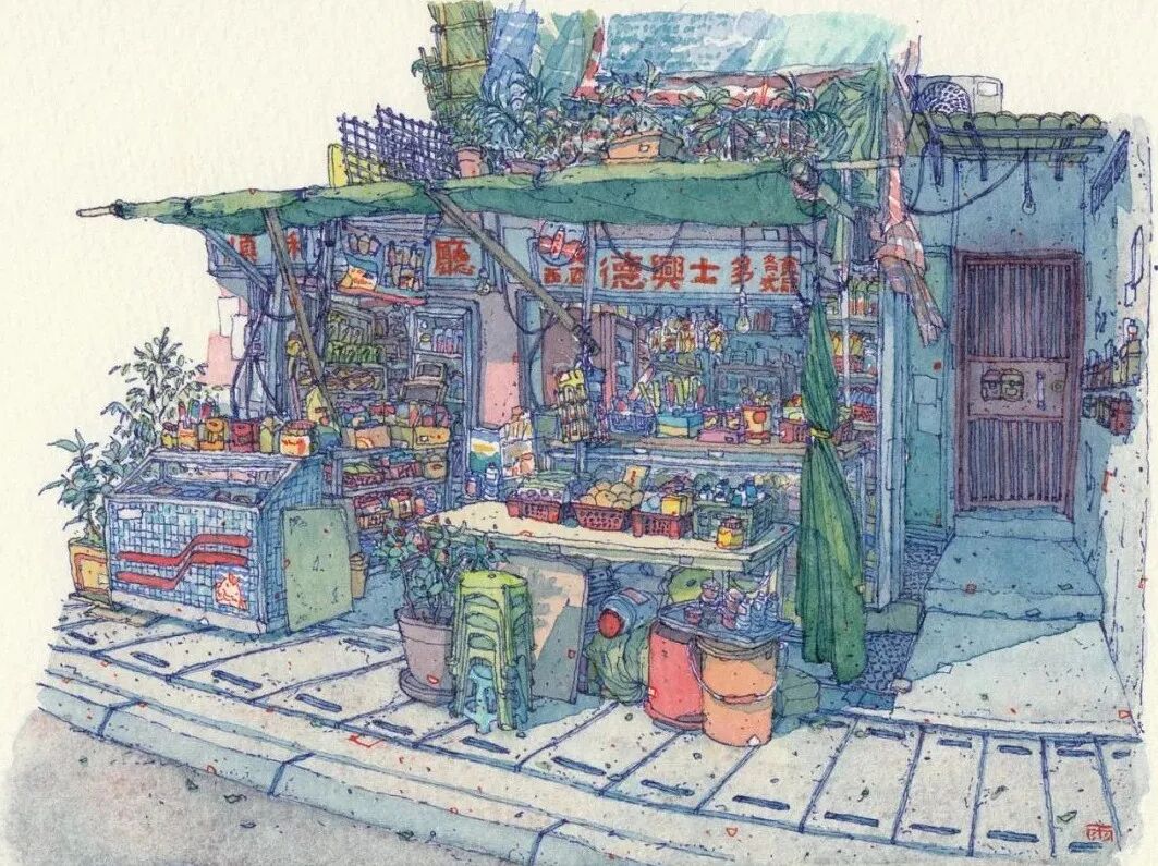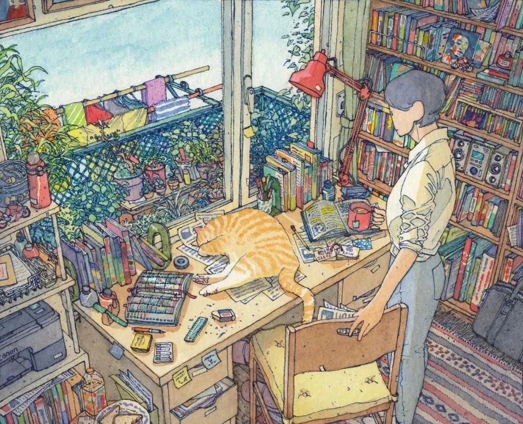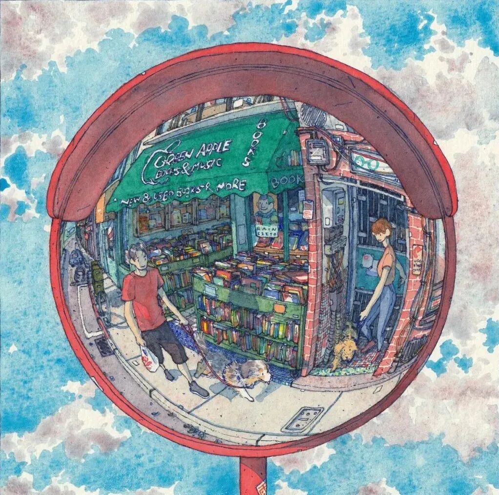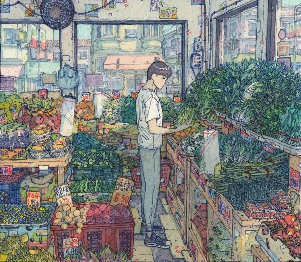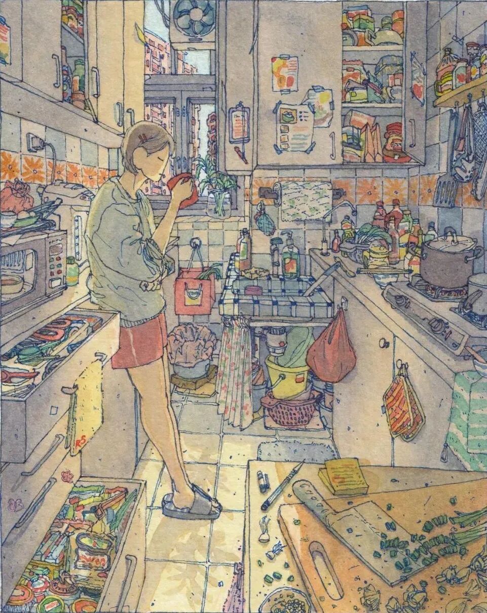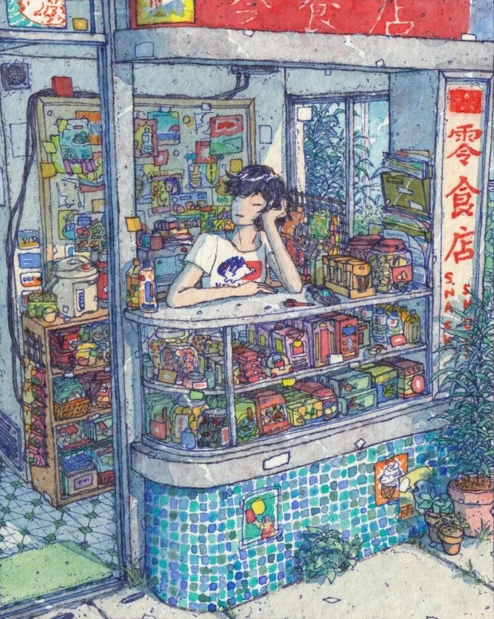 在司徒雨的绘画作品中,我们可以看到大量且复杂的场景,这些场景是成堆的书籍、零食和玩具,以描绘商店和居住的家中为主,在复杂的画面中,却给人带来一种莫名的稳定和秩序感,并不会让人感到混乱,复杂的画面更能吸引我们的目光一点点地去观察与欣赏这些插画作品。