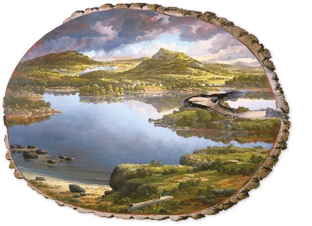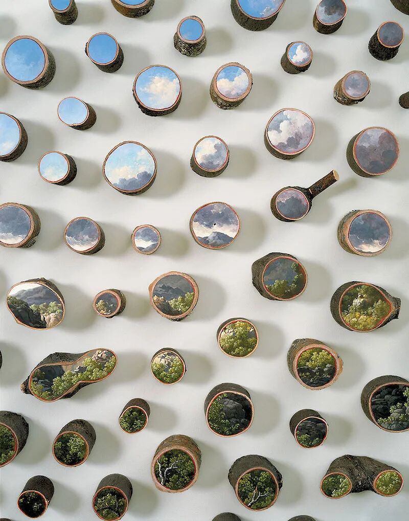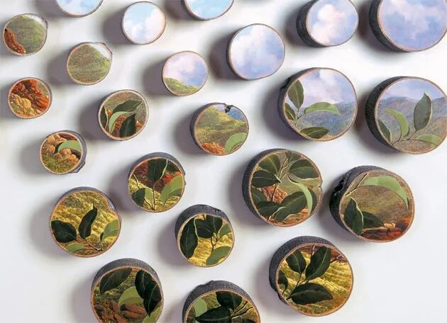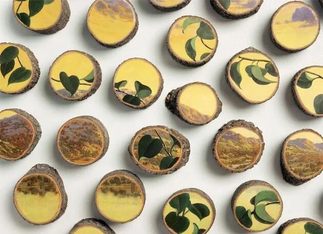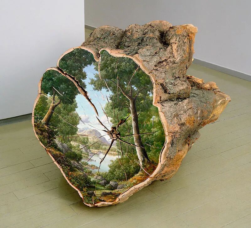 在树木的横截面上,画和树木相关的风景画作,让人有一种非常奇特的视觉体验,事实上,直接在切开的树木上绘画作品和木板画作相差无几,不过,原木更多的保留了树木原本的特征,凹凸不平的树木,仿佛就像是画作的边框一样,让人的实现集中到这些漂亮的风景画作上,而树皮有给我们带来一股大自然的感觉。