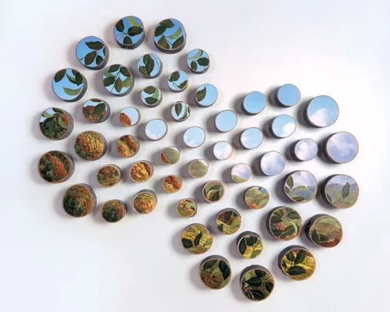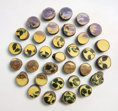 艾莉森·莫里苏古的树木画作主要分为两种,一种是单独的风景画作,需要较大的树木横截面或者是树根的位置,另一种则是组合形式的画作,需要大量的树枝组成,每一个树枝的横截面上都有描绘一幅画作的部分图案,这些十余个,几十个的小树枝组成一幅大型的风景画作。
