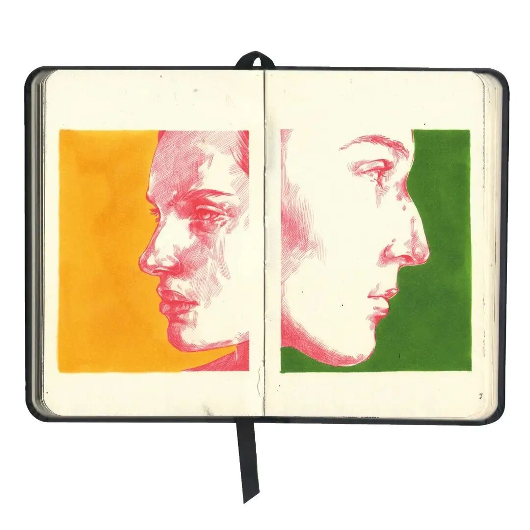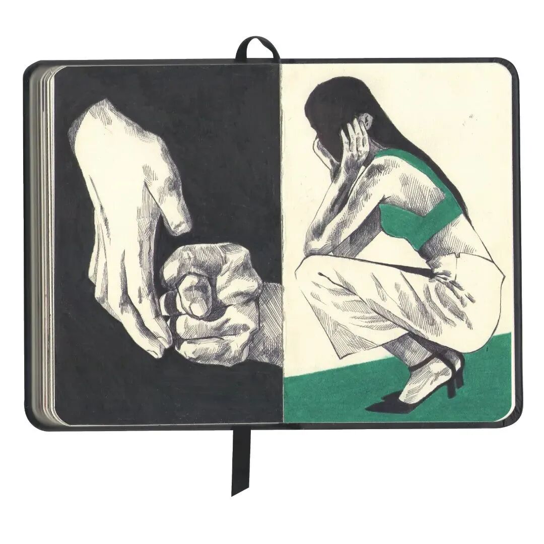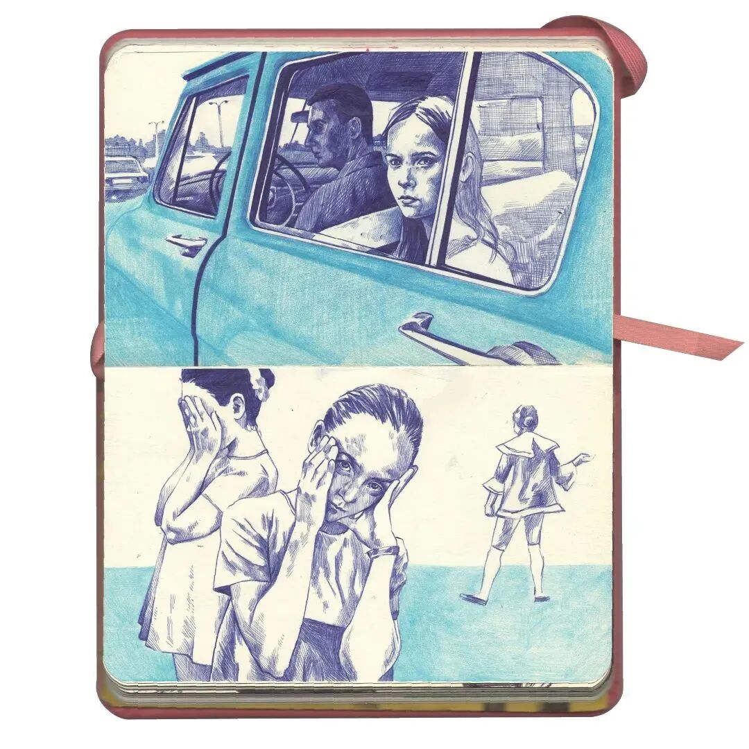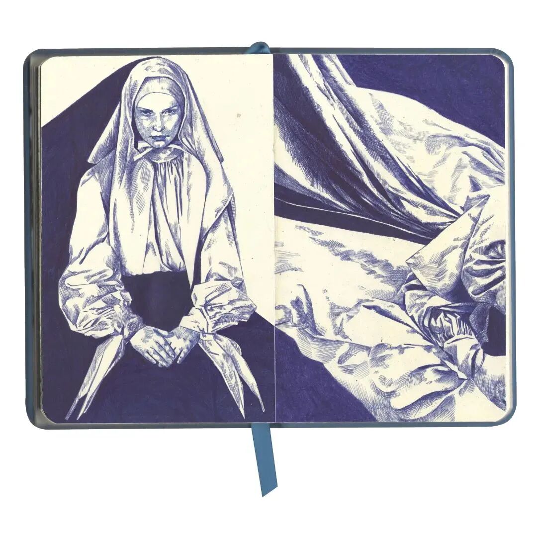 这位在素描本上绘画的艺术家叫凯瑟琳·阿克穆伦,以钢笔画和素描画作闻名,作为一位不善于表达的艺术家,她喜欢在画作中描述故事,通过画作去表达自己的感受,因此,我们可以在凯瑟琳·阿克穆伦的素描画作中,看到许多双联画,这些画作充满了故事性。