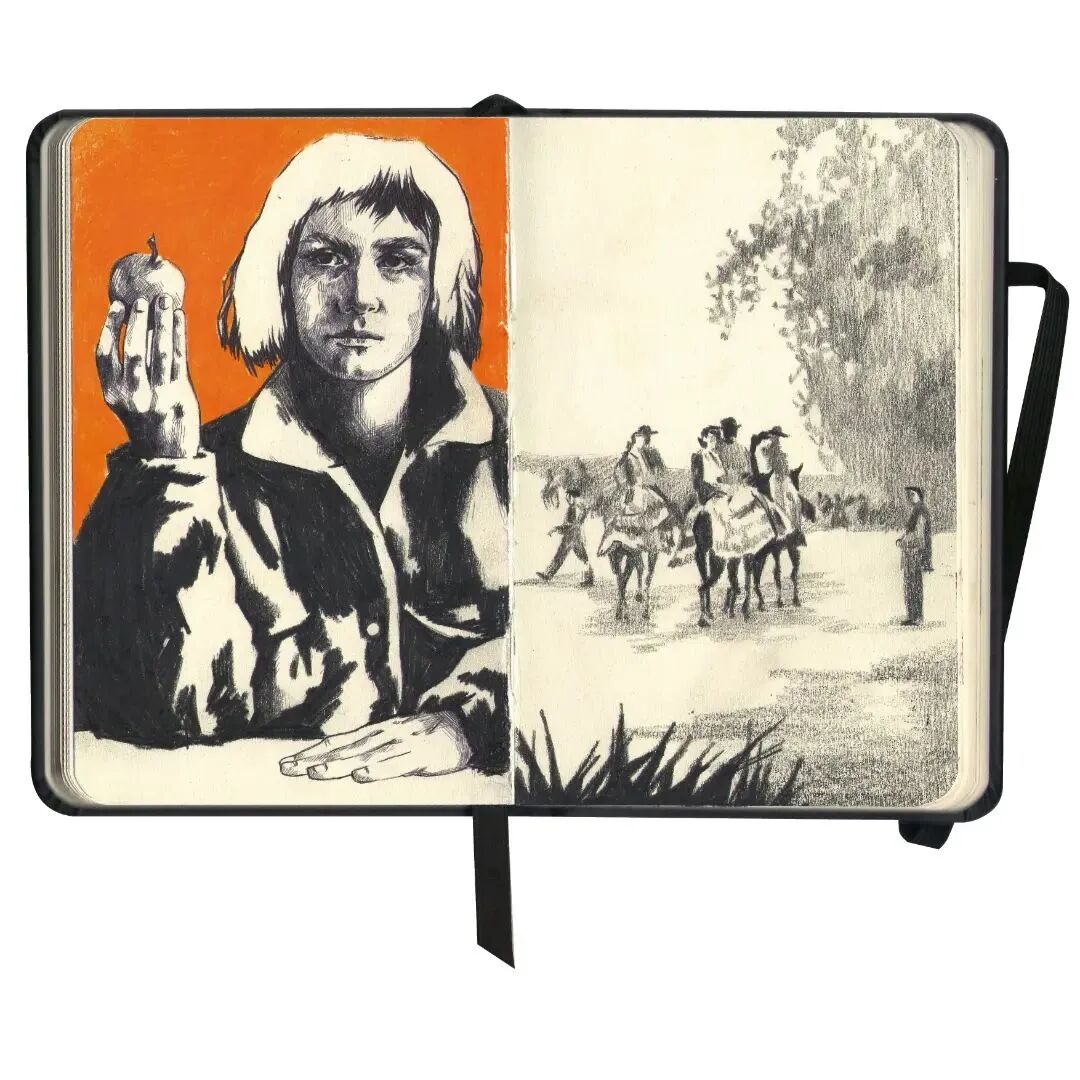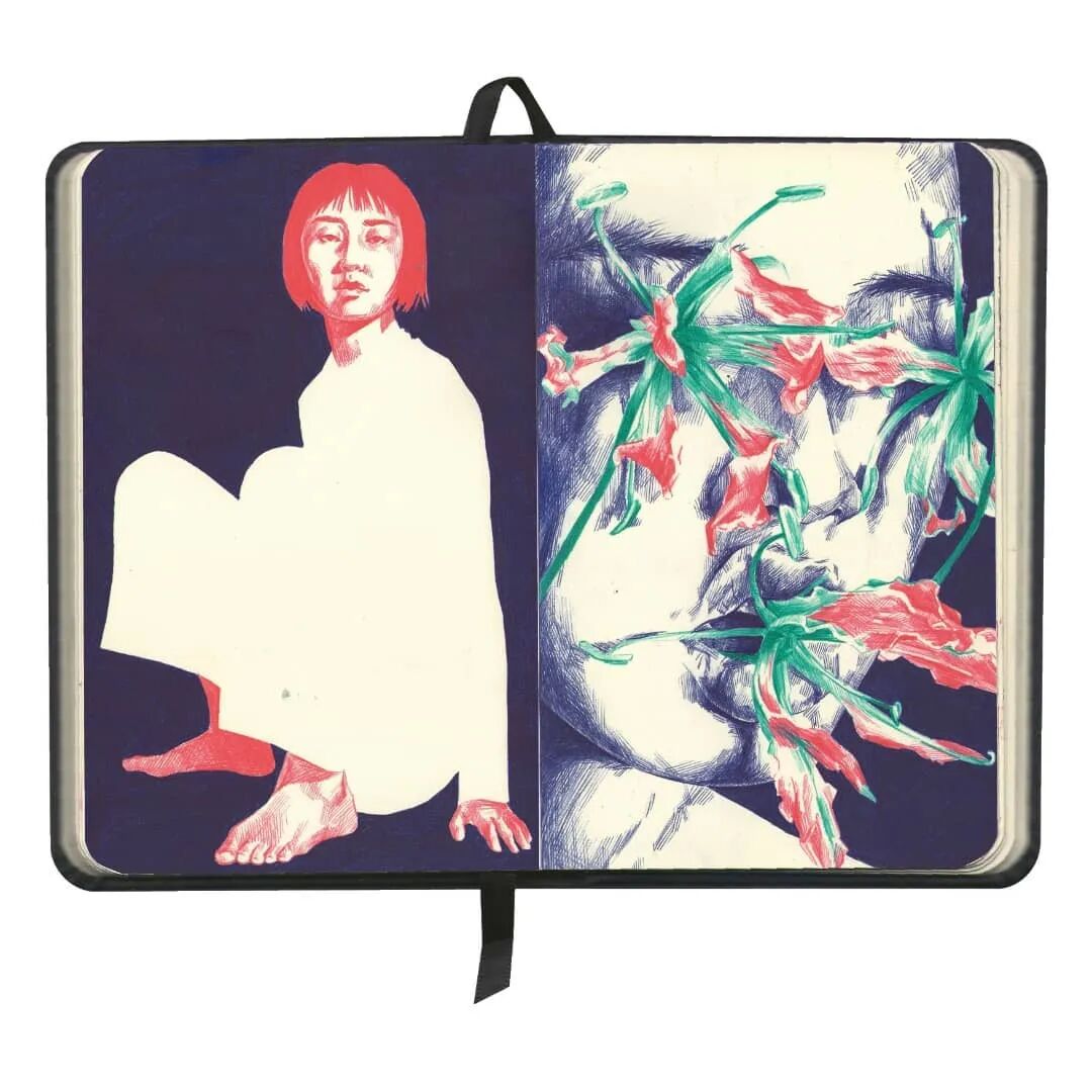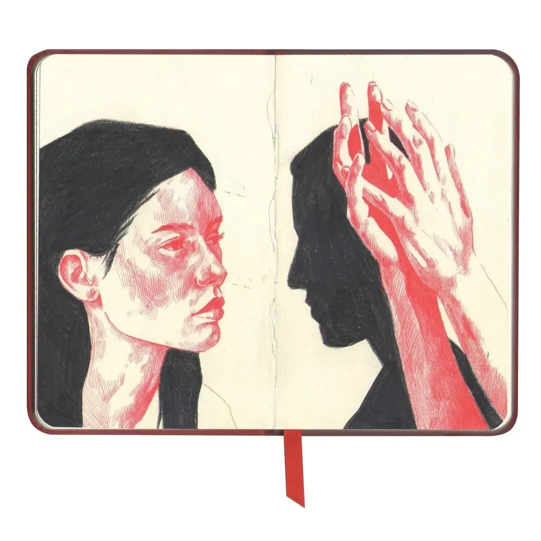 这位在素描本上绘画的艺术家叫凯瑟琳·阿克穆伦,以钢笔画和素描画作闻名,作为一位不善于表达的艺术家,她喜欢在画作中描述故事,通过画作去表达自己的感受,因此,我们可以在凯瑟琳·阿克穆伦的素描画作中,看到许多双联画,这些画作充满了故事性。