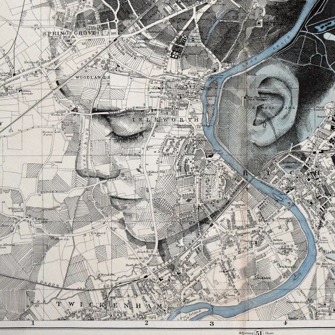 对于埃德·费尔伯恩来说,在地图上绘制肖像是一种挑战,也是一种乐趣,不过,让他最感兴趣的是,每次画完这些地图后,从远处去观察这幅地图,让人看到的是一幅肖像画作,而当我们离近了去观察时,肖像人物会消失,地图又浮现在我们眼前,这种趣味感,也促使埃德·费尔伯恩不断地创作下去,接下来,就让我们一起来欣赏一下,埃德·费尔伯恩在最近一段时间里,创作的精彩地图肖像画作吧。