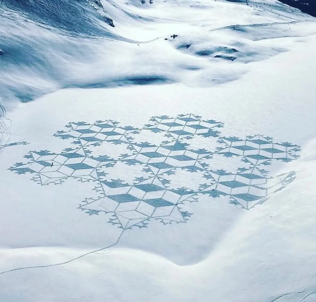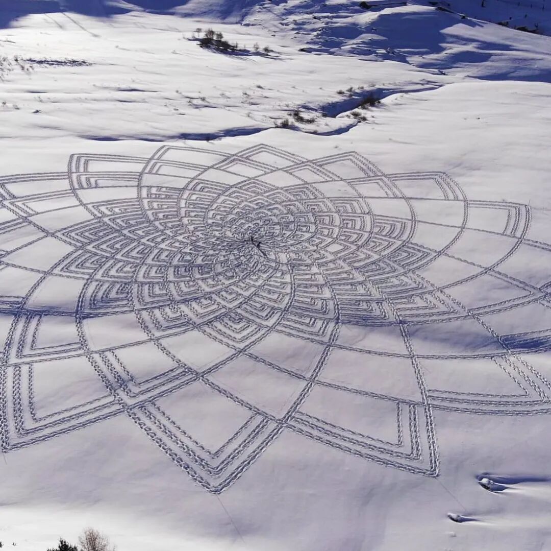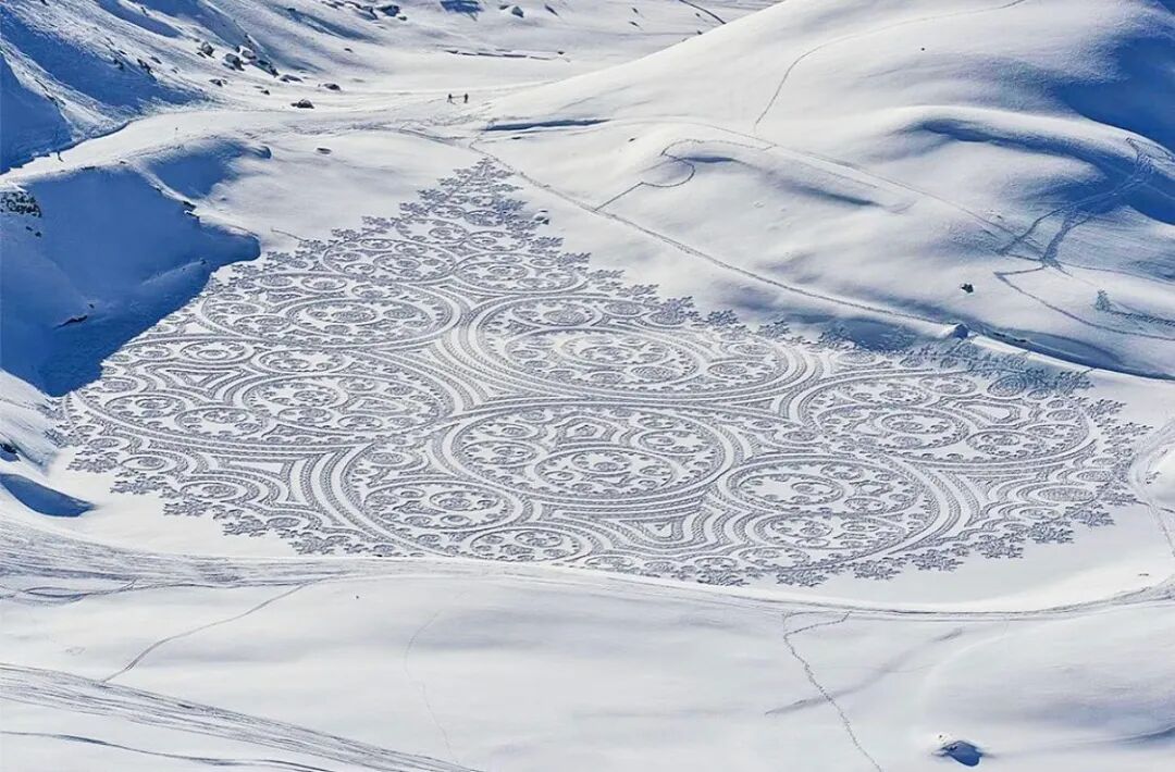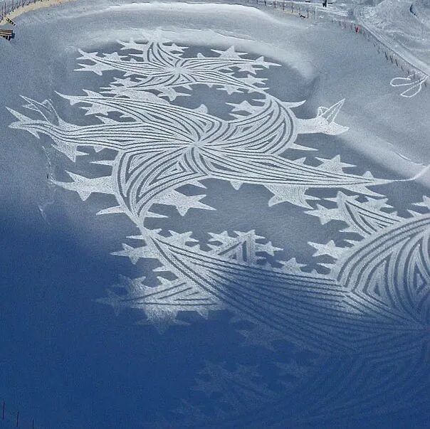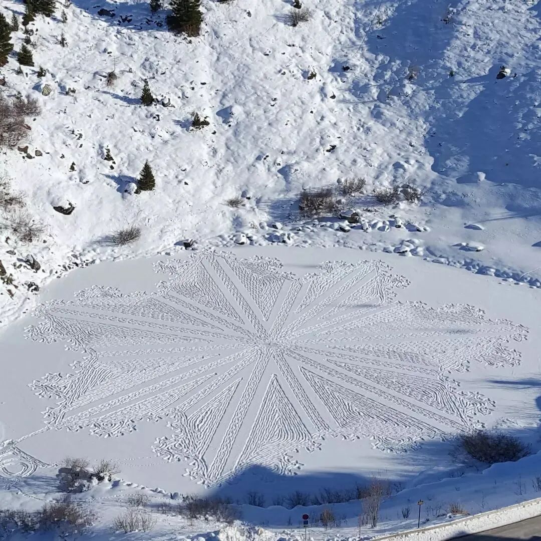 绘制大地雪画并没那么神秘,艺术家在创作的时候,会使用指南针去确定方向,然后再去设计一幅画作中一根线的步数,也就是多少米。因为大多数大地雪画都是几何造型,确定好了方向和每一条线的步数,就可以绘制出一幅精彩的大地雪画了,当然在创作中需要格外小心,这是因为,这种绘画是“一次性”创作,我们无法修改错误的痕迹。