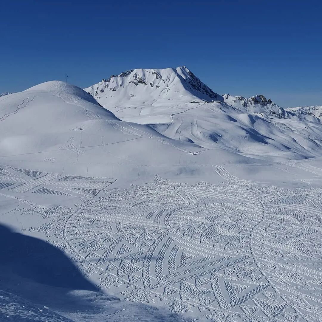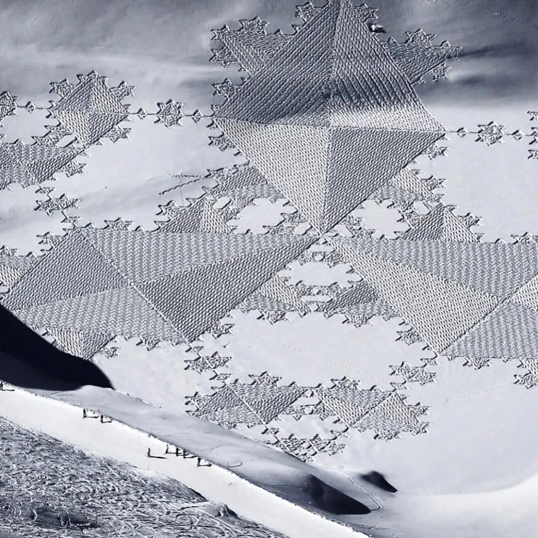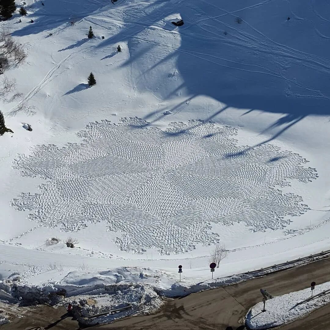 绘制大地雪画并没那么神秘,艺术家在创作的时候,会使用指南针去确定方向,然后再去设计一幅画作中一根线的步数,也就是多少米。因为大多数大地雪画都是几何造型,确定好了方向和每一条线的步数,就可以绘制出一幅精彩的大地雪画了,当然在创作中需要格外小心,这是因为,这种绘画是“一次性”创作,我们无法修改错误的痕迹。