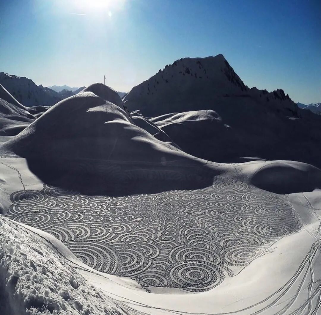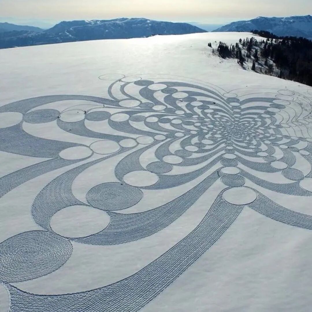 以雪画闻名的西蒙·贝克,就是这样一位不使用纸笔去绘画的艺术家,他把成片的积雪当成画布,将自己的双脚当成画笔,通过在雪地上行走的足迹,去形成一幅幅让人感到震撼的大地雪画。这些雪画的尺寸非常大,一些大型的作品可以达到400、500米长,需要走上几天的时间才能完成。
