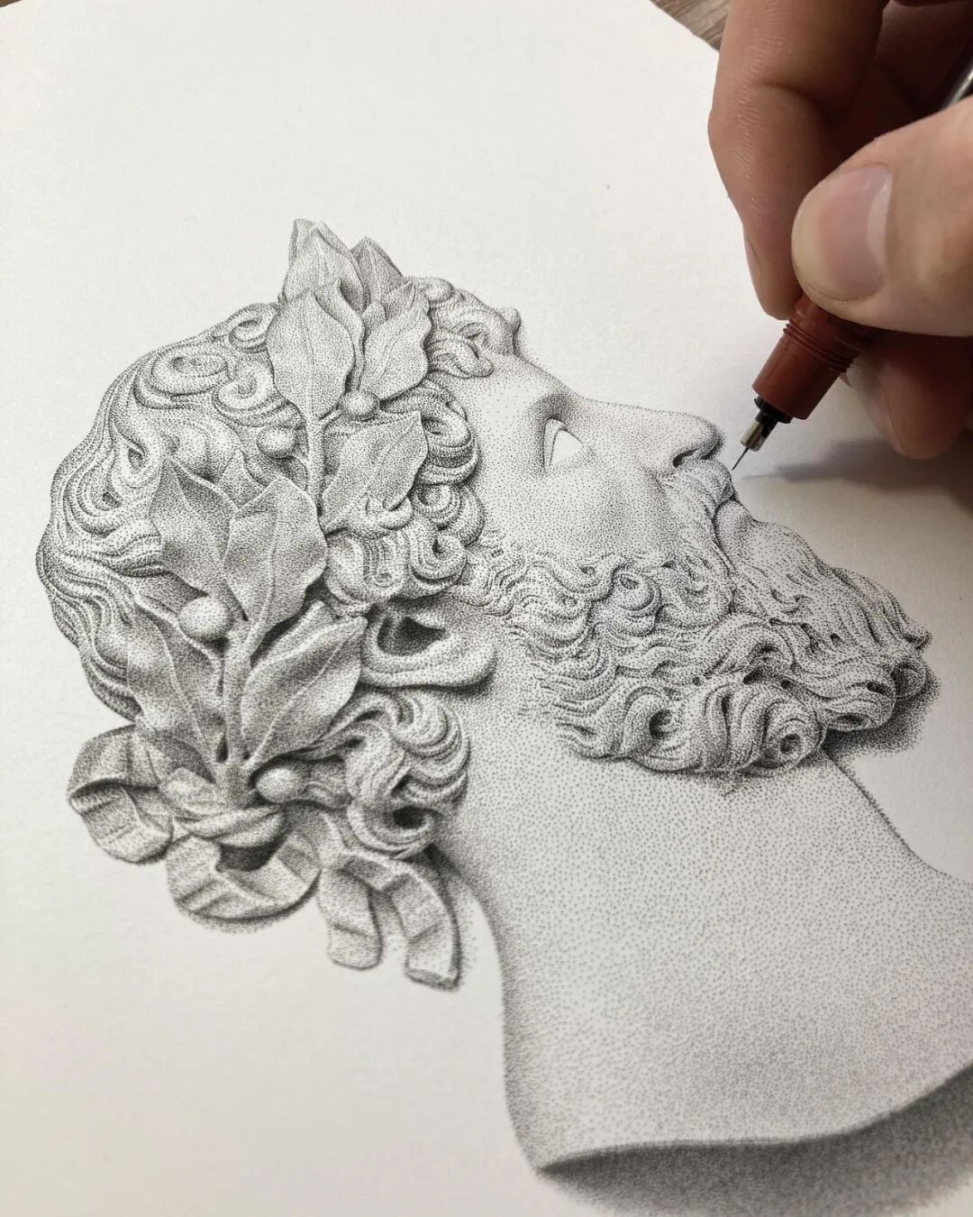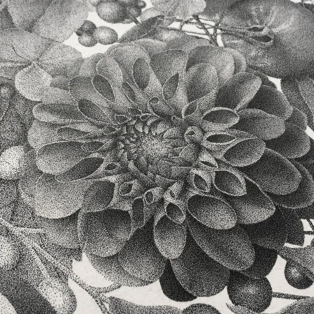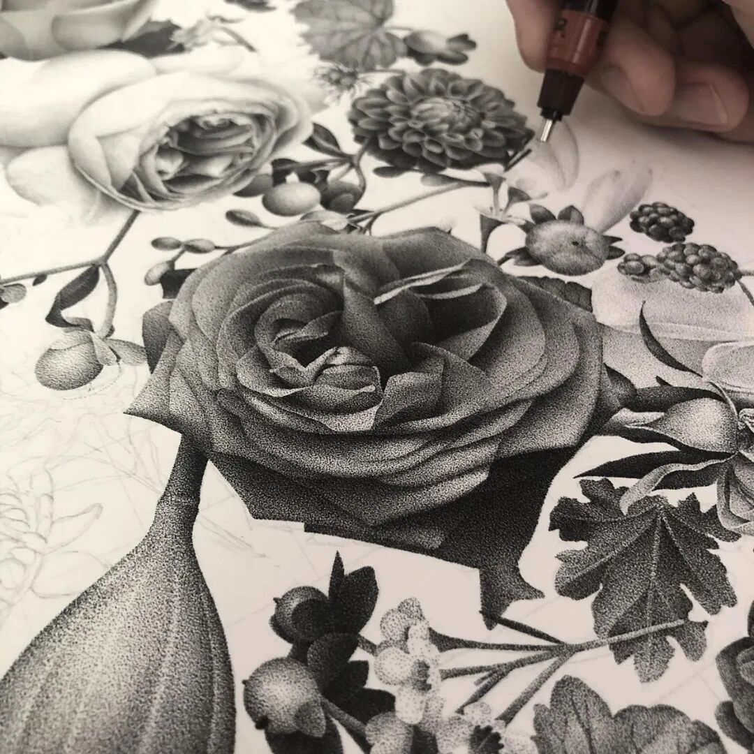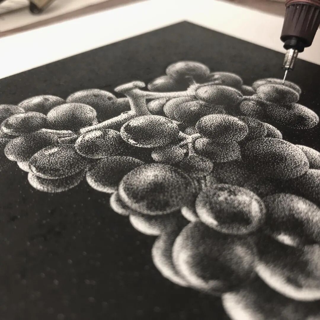 与传统的绘画方法不同,点画是一种相对独特的绘画技法,大家都知道,一般而言,一幅单色绘画的光影感和立体感,是通过大量的线条排列构建出来的,然而点画,则是用数不清的点戳出来的。点画更考验耐心,对画面的整体把控能力要求也非常高。