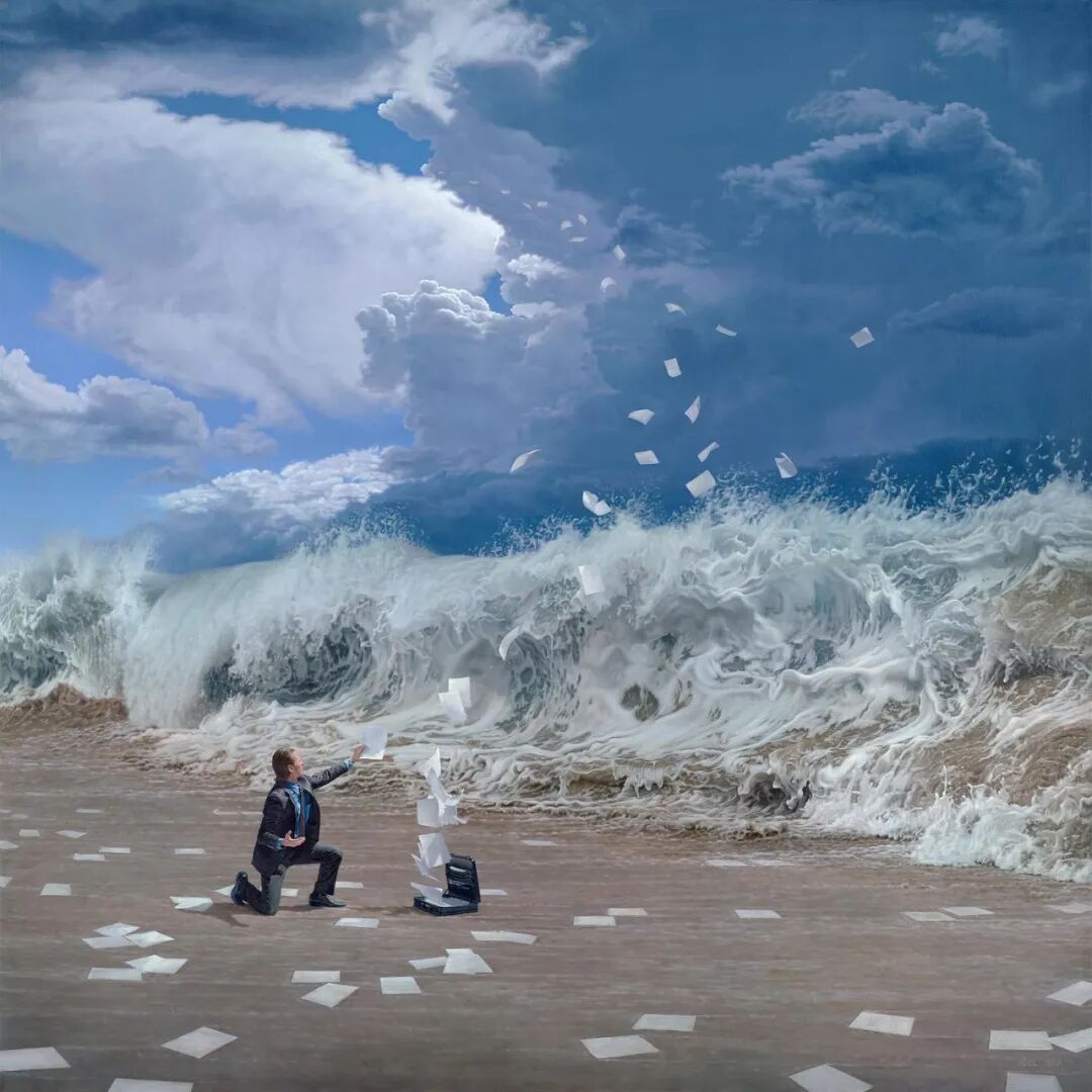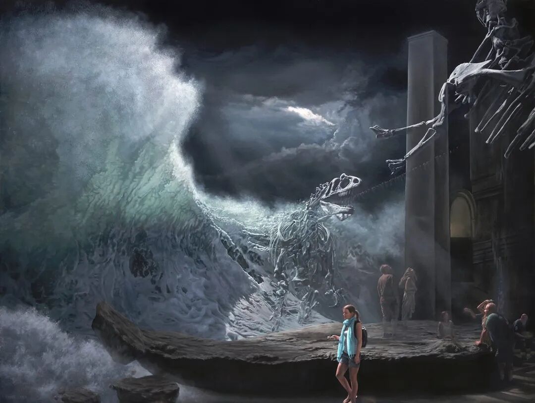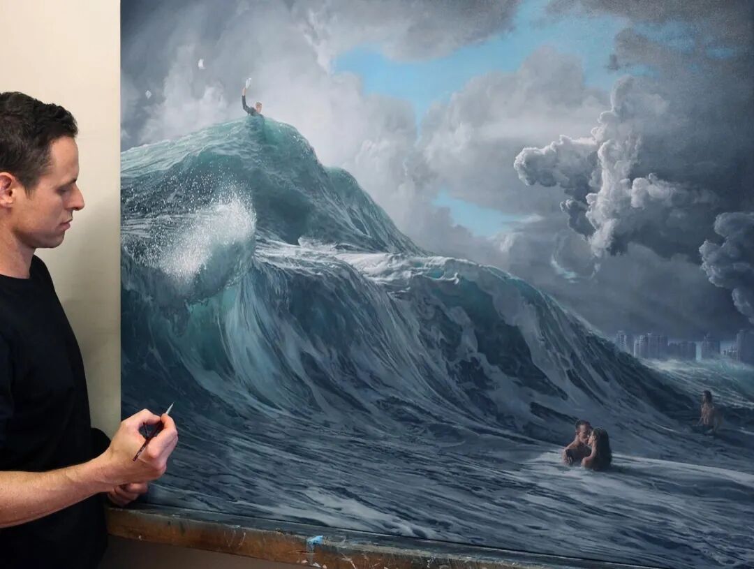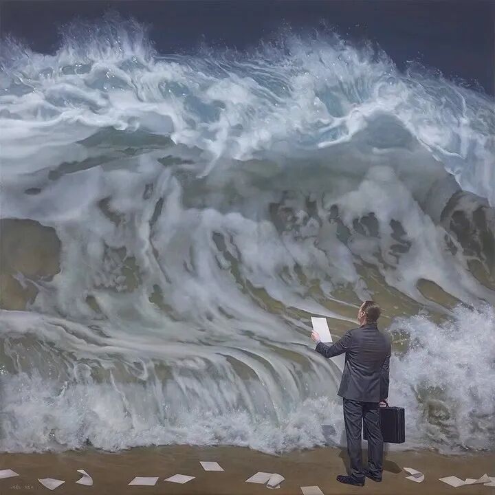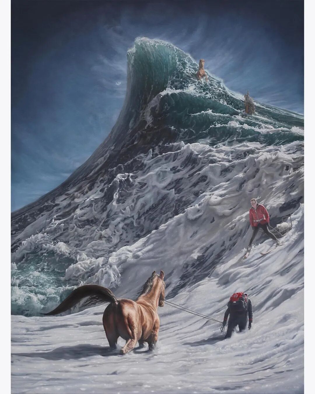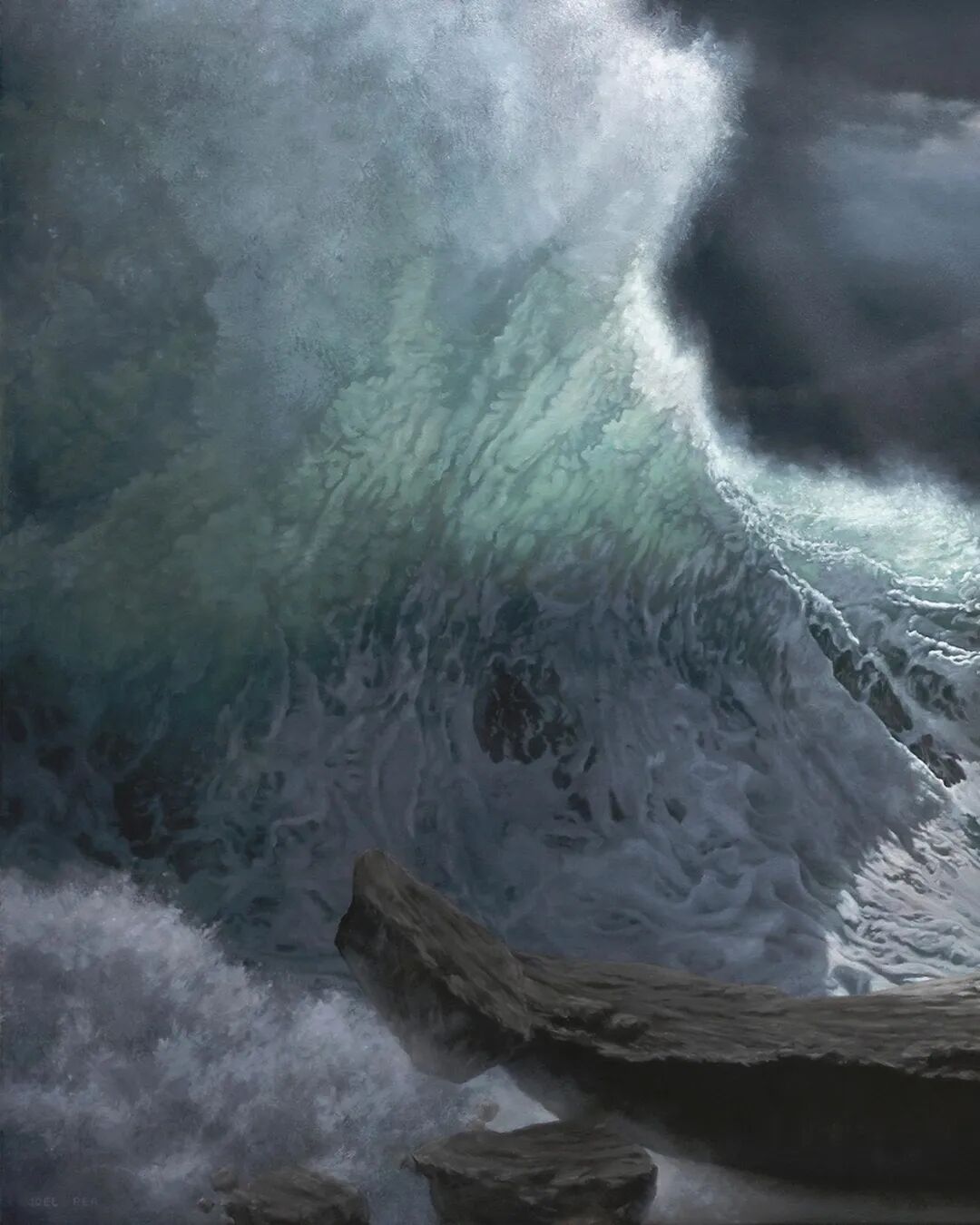 很多人在欣赏乔尔·雷的画作时,常常会陷入自我怀疑,因为,他描绘的画面太逼真了,给人的感觉,就是现实世界的真实场景,然而画面中的某些“不和谐”因素,又会让人困惑,怀疑是不是自己的眼睛出现了问题。最令人印象深刻的是,这位艺术家笔下描绘的波浪十分真实逼人,看上去栩栩如生,非常震撼。