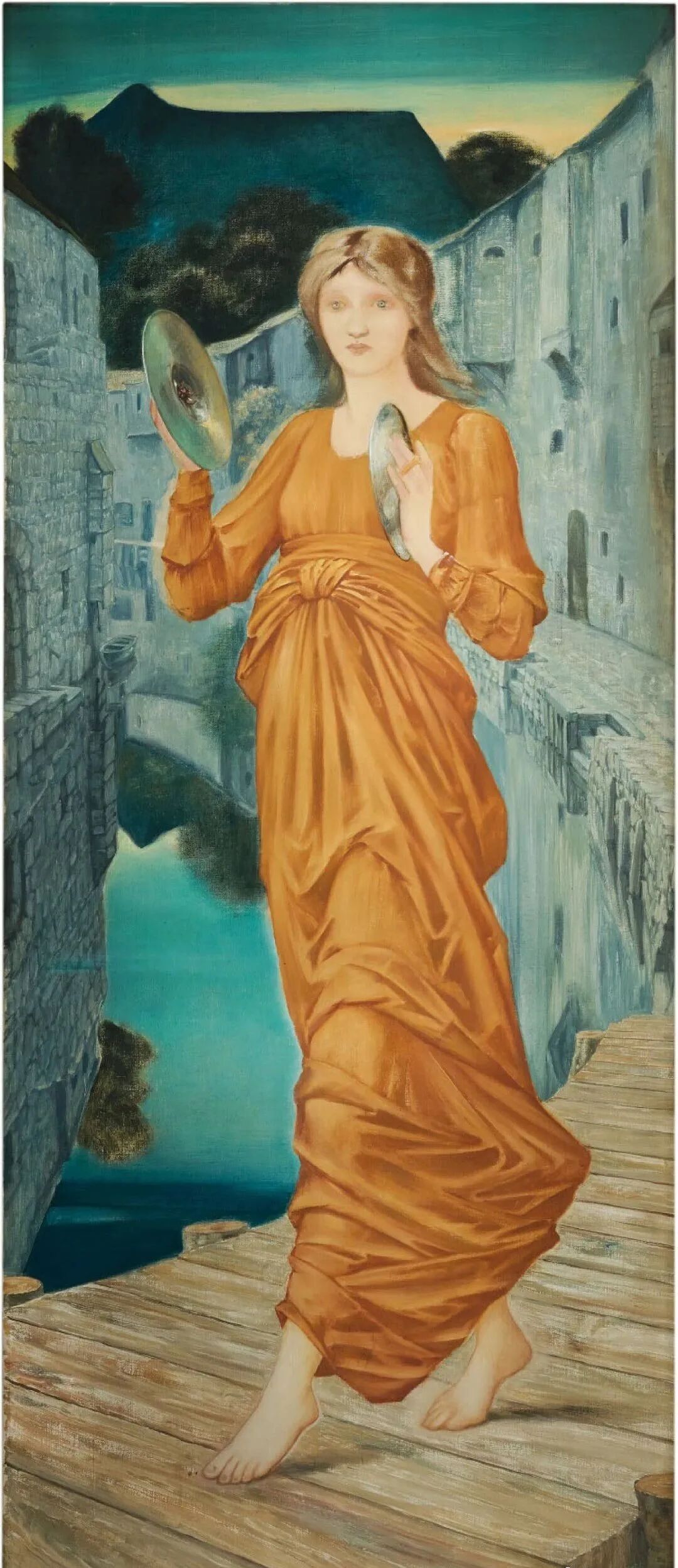 在这幅画中,Edward Burne-Jones于纯粹想象的荒凉景观之中,让维纳斯和少女们凝视着水中的倒影,前景的草坪为人影戴上花冠。画面的氛围和色彩是拉斐尔前派的,人物的美丽和优雅却是文艺复兴的,让人想到波提切利。艺术家舍弃了具体叙事,只通过女孩的表情传达出一种感伤之情。