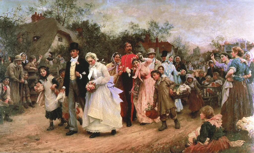 当然,生活不总是黑暗的。Samuel Luke Fildes还画了许多反映英国乡村生活画作。下面这幅《乡村婚礼》画作就充满了欢乐,一扫我心头的阴霾。