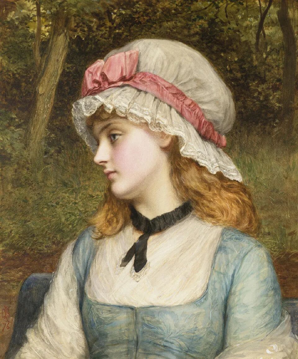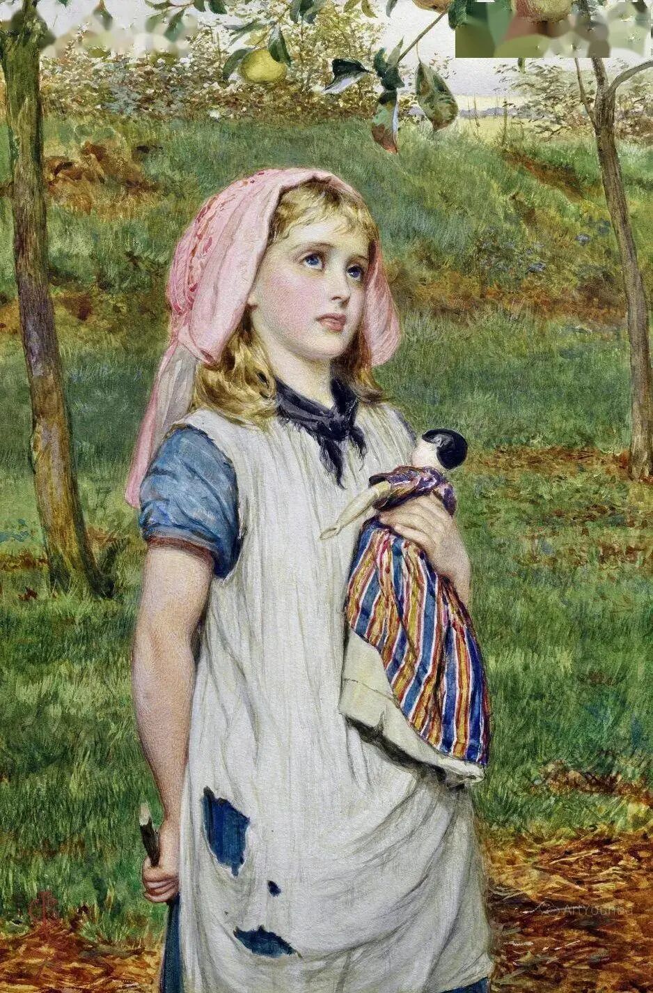 透过Charles Sillem Lidderdale的作品,我们还可以看到维多利亚时代的小女孩的穿着风格。下面这几幅作品,女孩子们都戴着类似的“帽子”,以兜住秀发。这应该是那个年代的流行风尚。我曾在英剧中也见到过类似的服饰。
