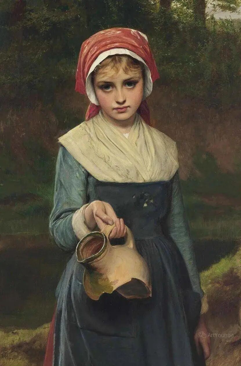 在这幅画中,我们可以看到孩子手中的陶罐破碎了。可怜的女孩既感到无辜,又带有一丝无奈和惊慌。显然,她无法完成打水的任务。回到家,可能会受到父母的责难。让我们也握住她的小手,给她带来一些安慰吧。