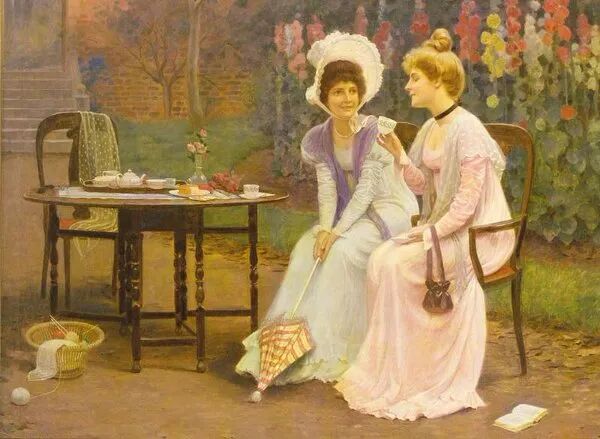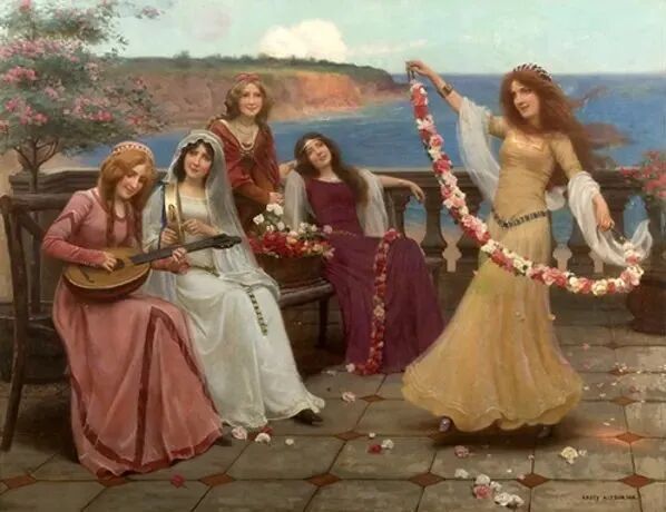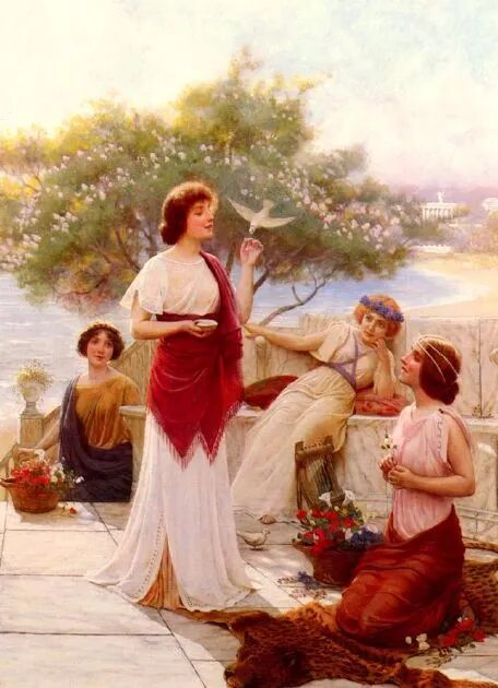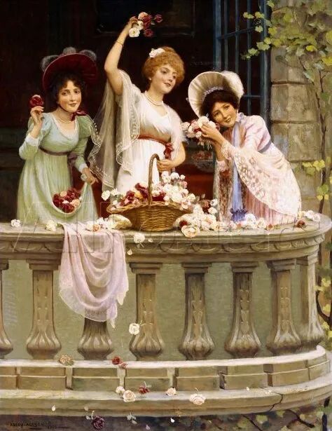 在这幅画作之中,姐妹们相约在风景如画的海滨露台之上,你弹琴,我跳舞,清风徐来,花香四溢,度过一段愉快的时光。这是当时上层社会阶层生活的写照,类似的画作还有下面这些作品。