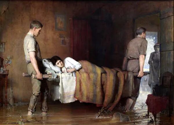 这幅作品是Abbey Alston少见表现现实题材的画作。暴雨过后的道路,贫穷的街区变成水泽之国。水漫入门槛,让一切都湿漉漉的。受寒的女子躺在用木头临时制成的架子上。只见她紧蹙双眉,脸上露出痛苦的表情。唉,豪门欢乐多,寒门捱日过。