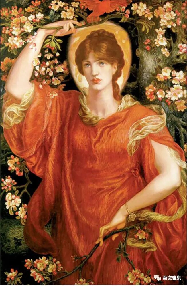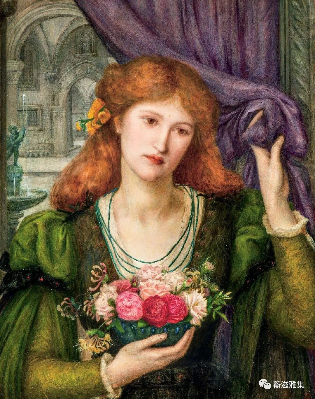这幅《帕丽塔夫人》取材于但丁诗歌中的角色——一个冷若冰霜石头心肠的绿衣女人,右手握着的水晶球,左手里的花枝绽放。在她心里,宗教信仰高于爱情。