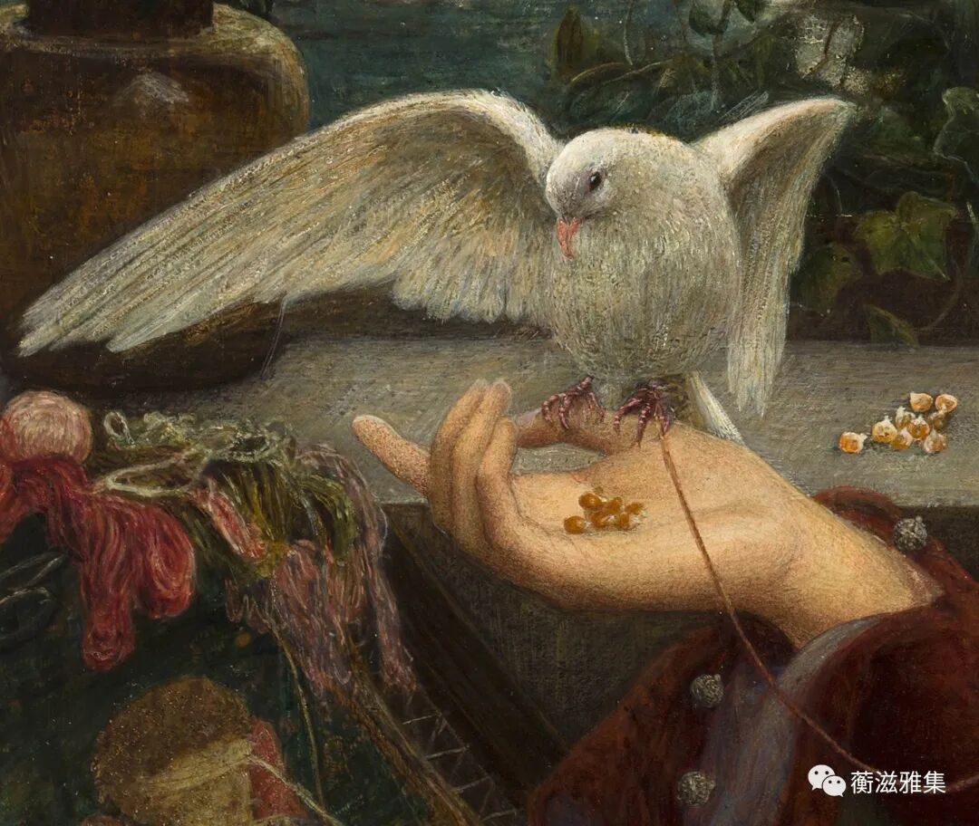 画中的各种元素都带着象征意义:白鸽、窗边青藤、少女胸口的玫瑰象征圣洁与爱情;刺绣上“蒙眼的丘比特”图案象征着爱与美的同时,也预示着爱的不可预测。爱是把双刃剑,既能带来甜蜜与欢乐,也可能造成伤害。