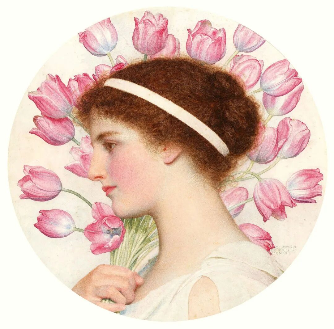 《一个穿着古典服装,手持郁金香的女孩》,1920 年