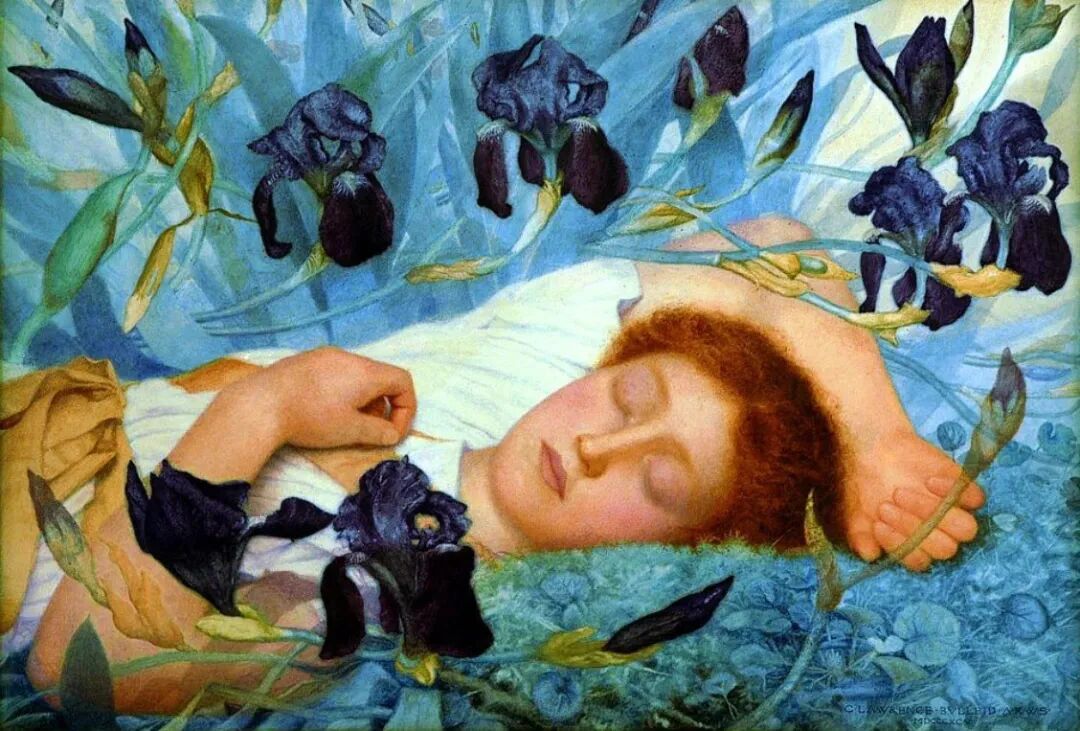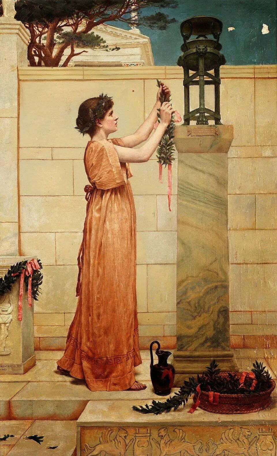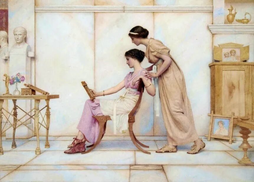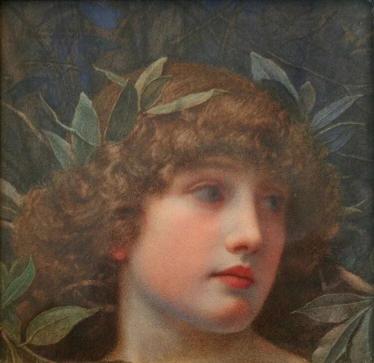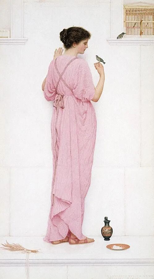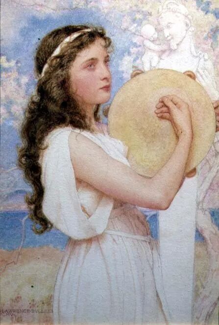 这幅画名为《拨琴的女孩》,是英国维多利亚时代的艺术家George Lawrence Bulleid(乔治·劳伦斯·布勒德,1858–1933),在1905年创作的画作。整幅画作用色淡雅,艺术家以细腻的笔触描绘梦幻般的唯美场景。女孩虽然是侧颜,但可以看出五官精致,气质优雅娴静。这幅画里有很多古典元素,如:女孩头戴的橄榄叶发饰,琴上的古希腊神话装饰,以及白玉墙上的浮雕等。