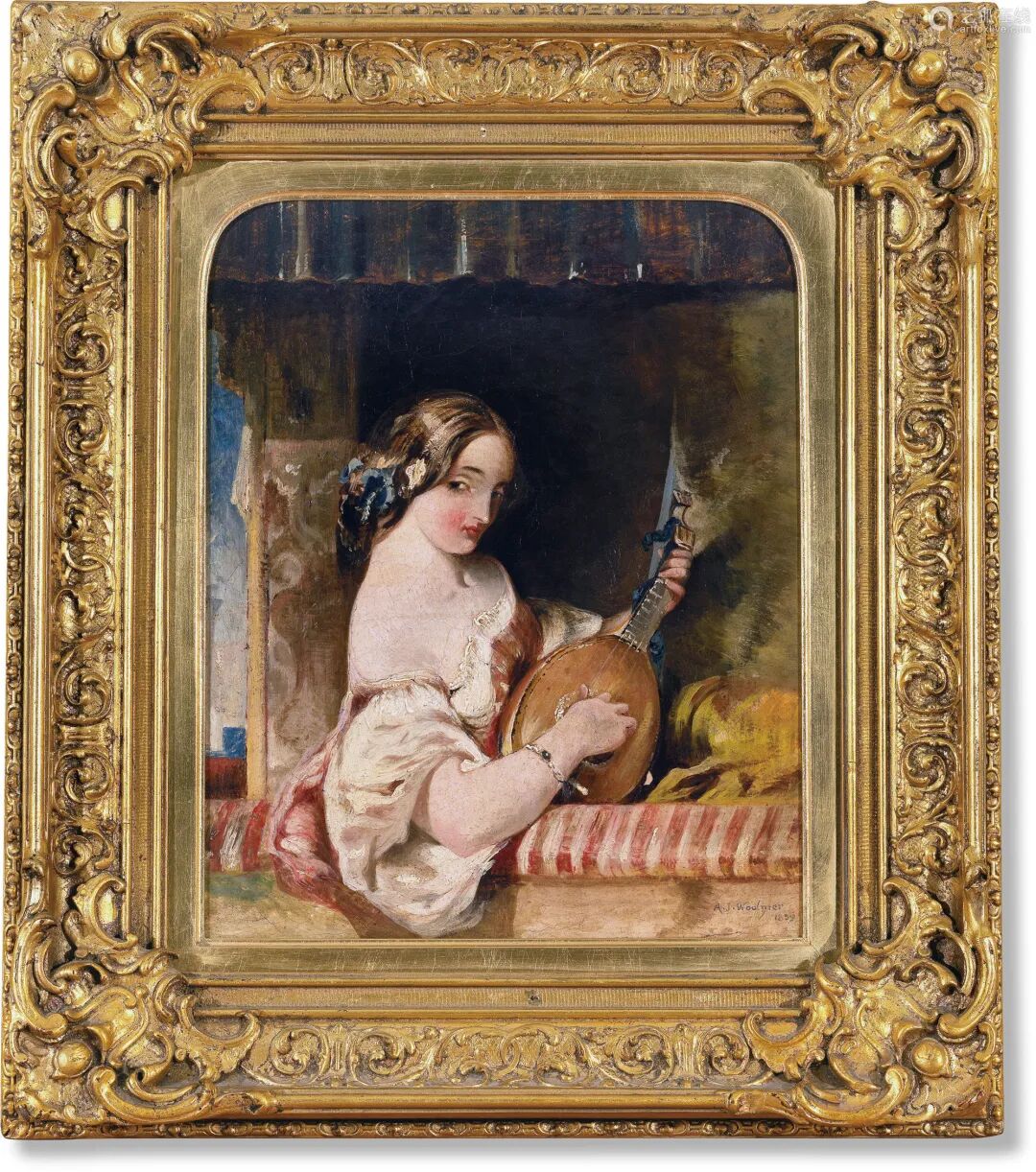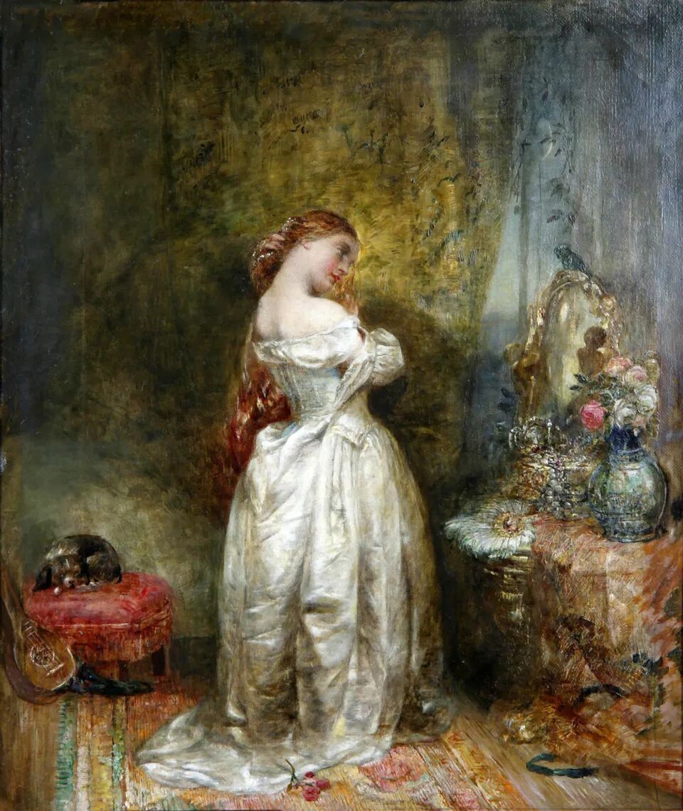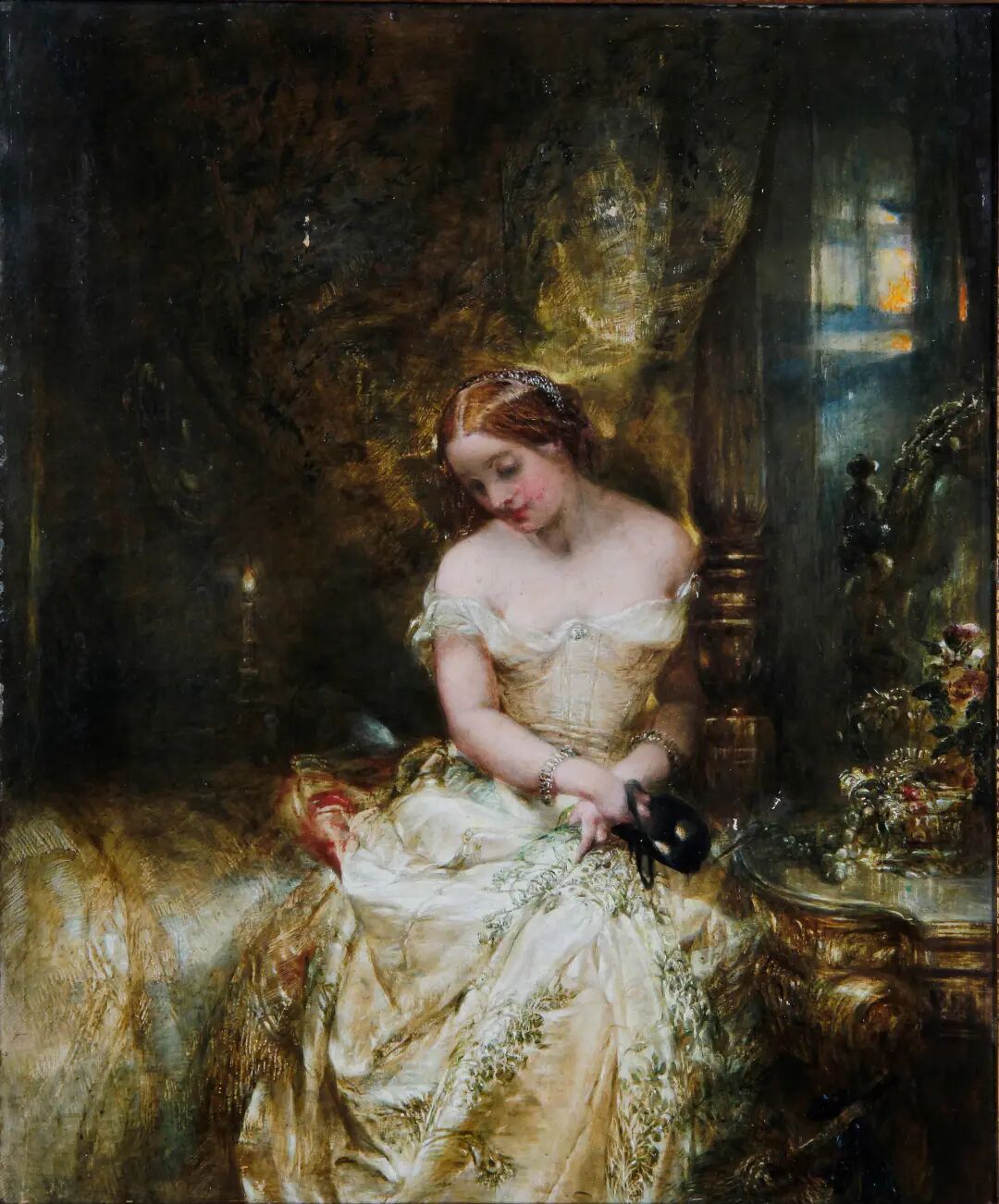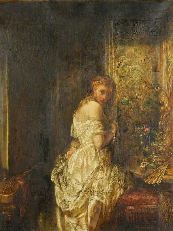 舞会开始之前,身穿华丽服装的女子看上去安静地坐在闺房里的床边。但是她的姿势已经反映出她的内心,此刻正在既欢快又紧张地跳动着。她低头注视着金丝镶花舞裙,心里有一丝得意。她要以靓丽华贵的装扮艳压群芳,力拔头筹,最好能够引起心上人的注视。她一想到爱人那热切的目光,又不免有一丝紧张,担心有哪一处细节没有到位,所以她的双手因为紧张而交叉着,略显僵硬的放在膝盖上。从这里可以看出Alfred Joseph Woolmer的观察力和极其精妙的构思。