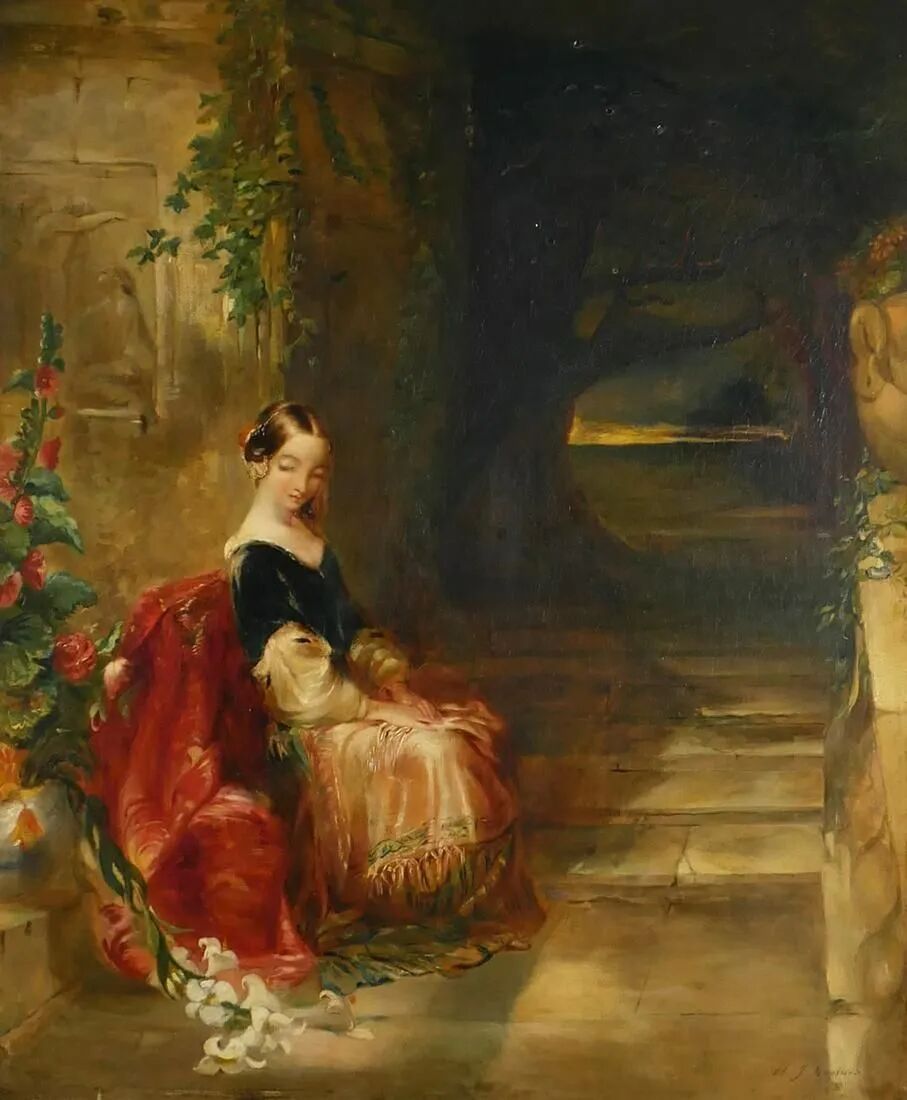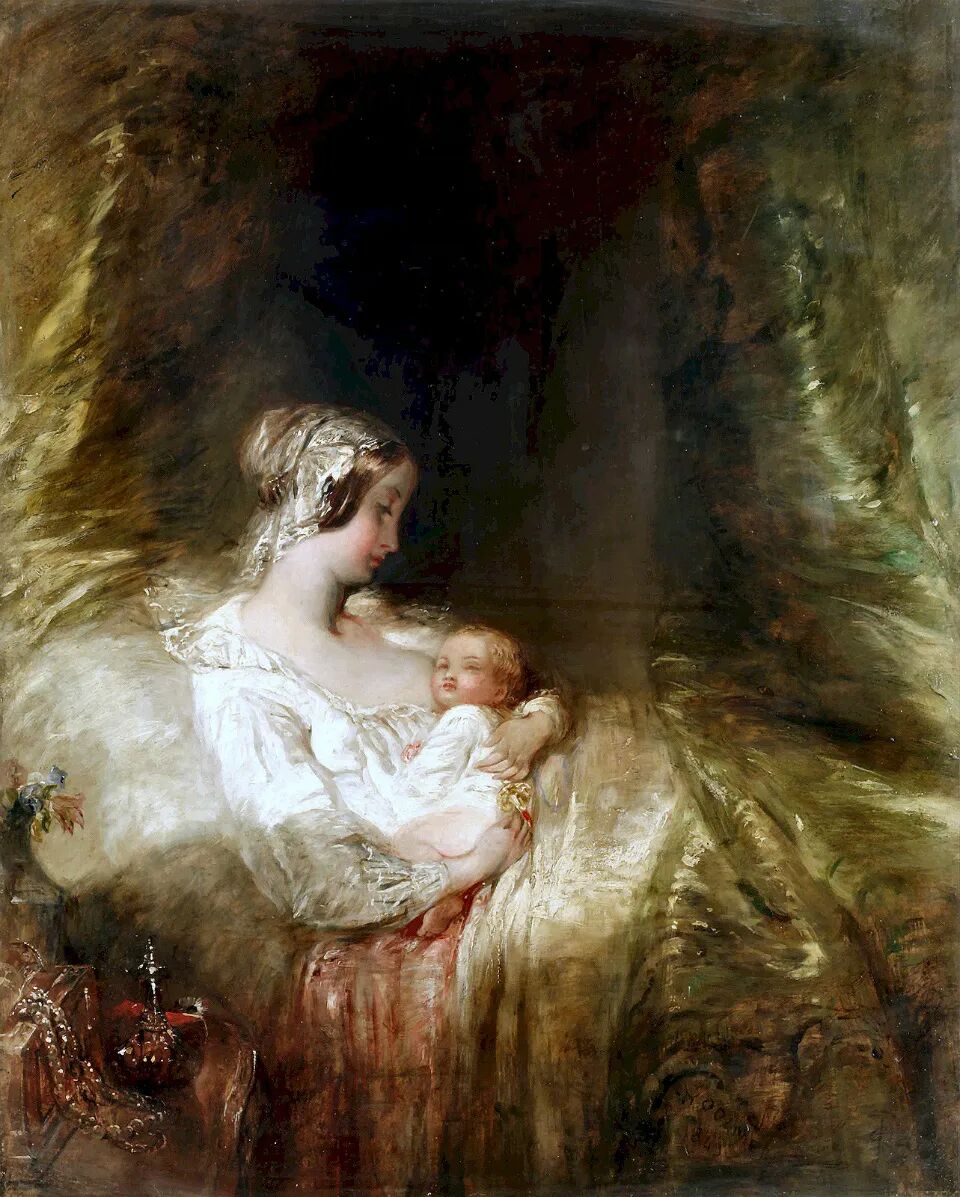 这幅画名为《女王的第一个孩子》,是英国艺术家Alfred Joseph Woolmer(阿尔弗雷德·约瑟夫·沃尔默,1805-1892)的作品。画中的女子是维多利亚女王,她正低头温柔地凝视怀中的小宝贝儿。小baby安详地躺在妈妈的胸口。她能够感受到目前的心跳,也能闻到乳香,她正如天使一般的甜蜜地睡着。