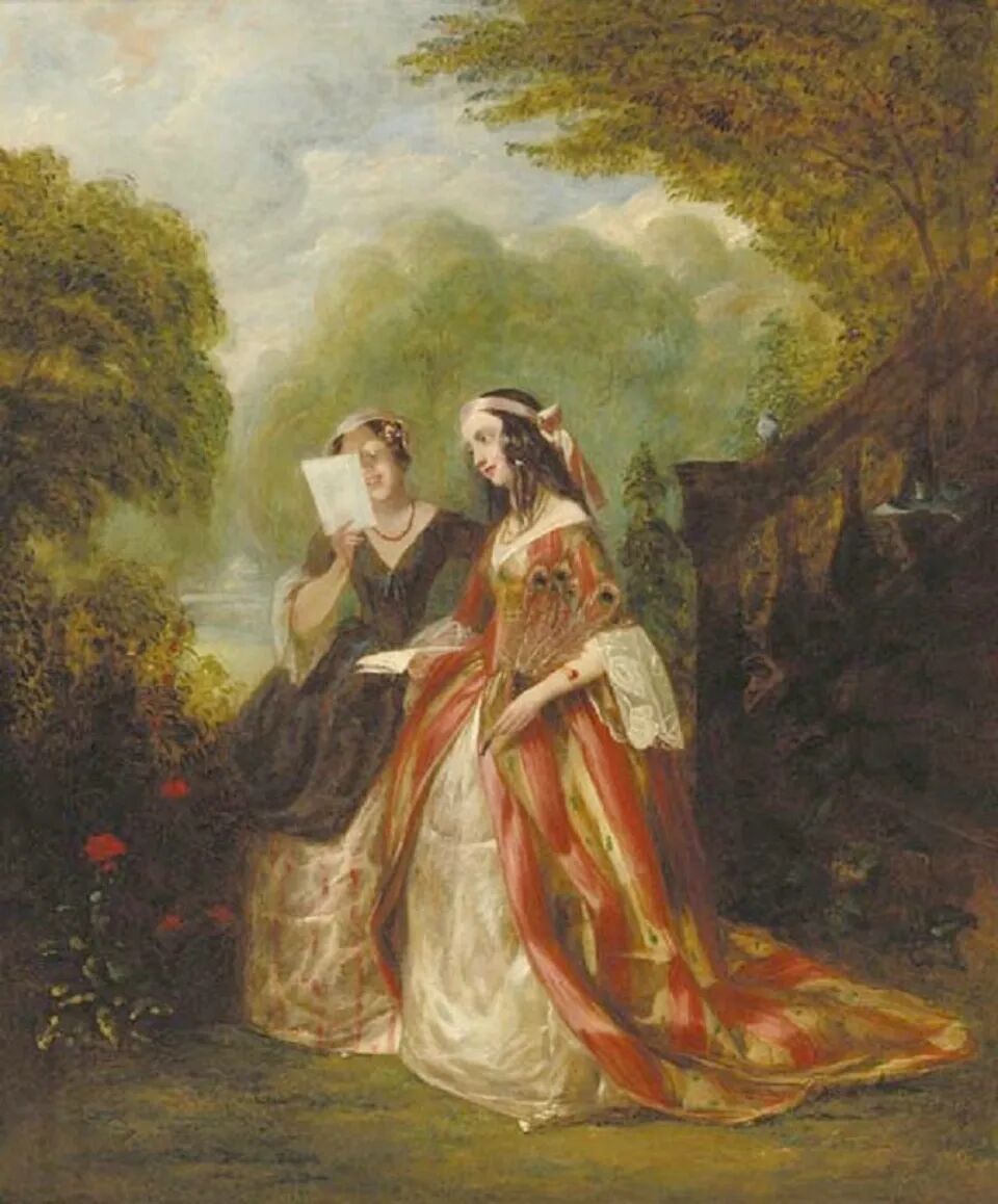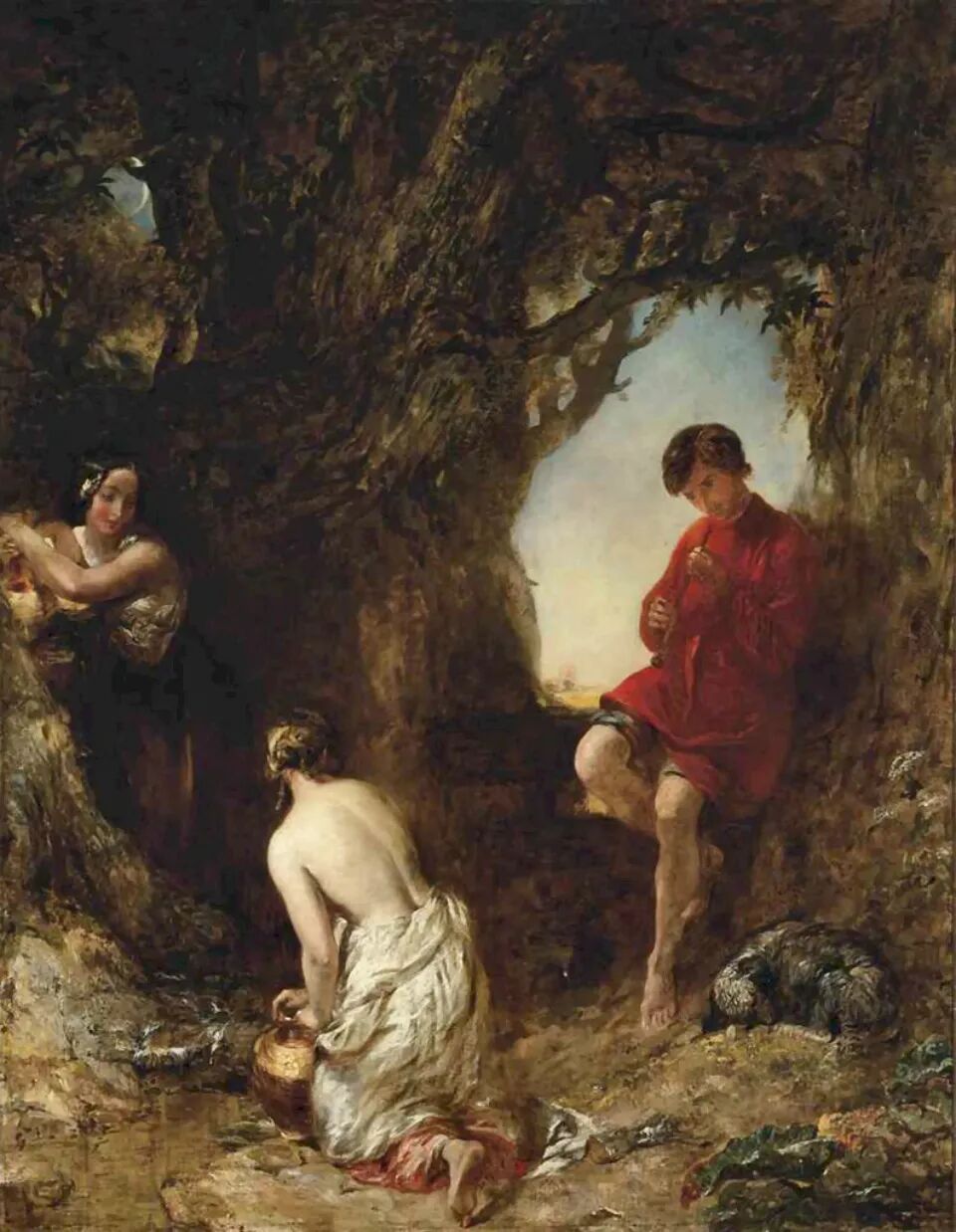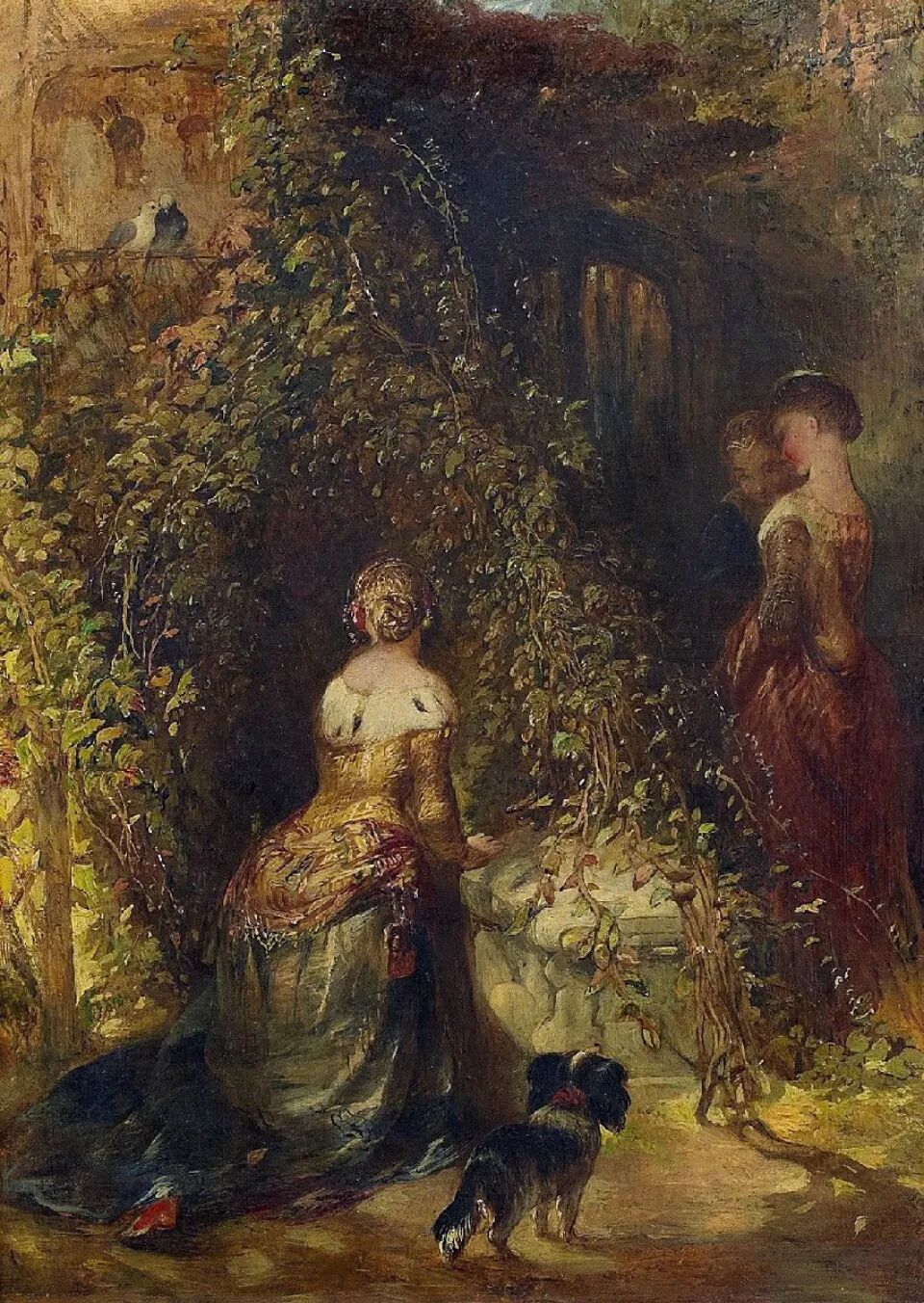 下面这幅《初夏》以对称的构图,在艺术家的画作并不多见。画作中一对情侣正坐在林间的台阶上读书。情侣占据了画面的正中心,但艺术家并没有对他们放大处理。相反,他花了很多笔墨去描绘约会的场景。茂密的枝叶,光线投射今来,一片明晃晃,让人觉得静谧而幽雅,近处一狗一孔雀,象征的爱情的忠贞和绚烂。此外还有花瓶,曼陀林琴点缀其中。这些刻意的物件让人怀疑艺术家是在工作室里摆放出这么一个场景。画作名为《初夏》,“初夏”其实隐含着“爱情正在发芽”。艺术家描绘了一个理想的爱情场景,这也是很多青春男女所期盼的。