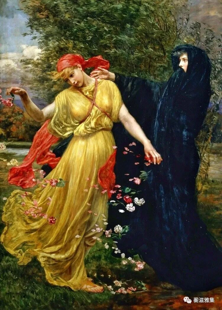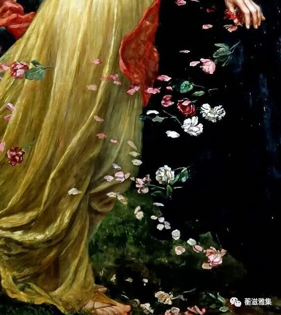看到了,相信大家明白了这幅画作的内在含义了。冬天来了,夏天结束了,消失的不只是夏日的时光,还有那些在夏天里遇到的人和发生的事。在画作中,冬日化作为身穿黑色罩头衣服的男子,他占据画面的右侧,伸手去触摸夏之女神。女神惊恐地想躲避,然而,就在触摸的那一瞬间,她失手落下了花枝,一时落英缤纷,红色的花,白色的花,黄色的花,一时随风而逝。夏天即将结束,而象征着爱情的花也将枯萎。