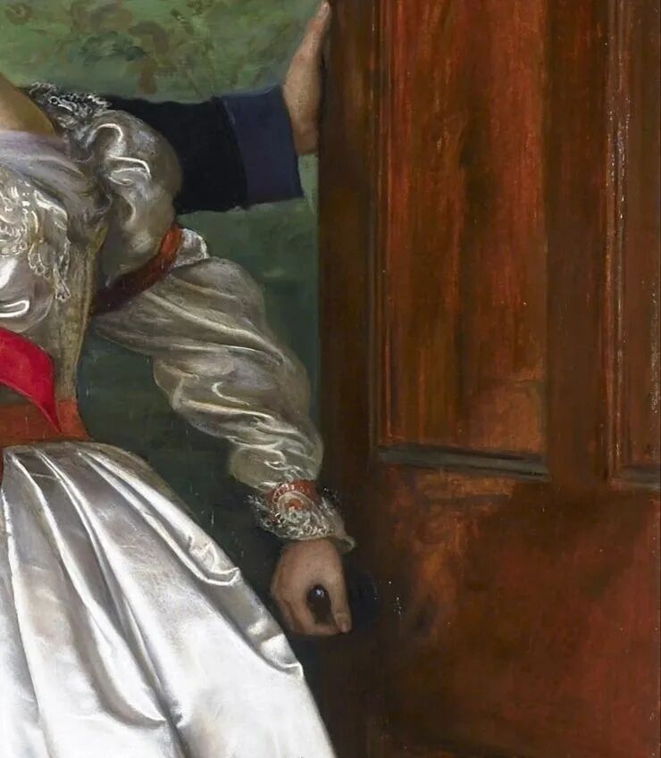 画作中,一对身穿精致华服的小情侣正在依依惜别。年轻的女子面带忧伤的表情,向前倚靠在男子的身上。她的左手则贴在男士的胸前。而她的右手则往后伸出,紧紧握住门把手,不让门打开,她正竭力阻止他的离去。
