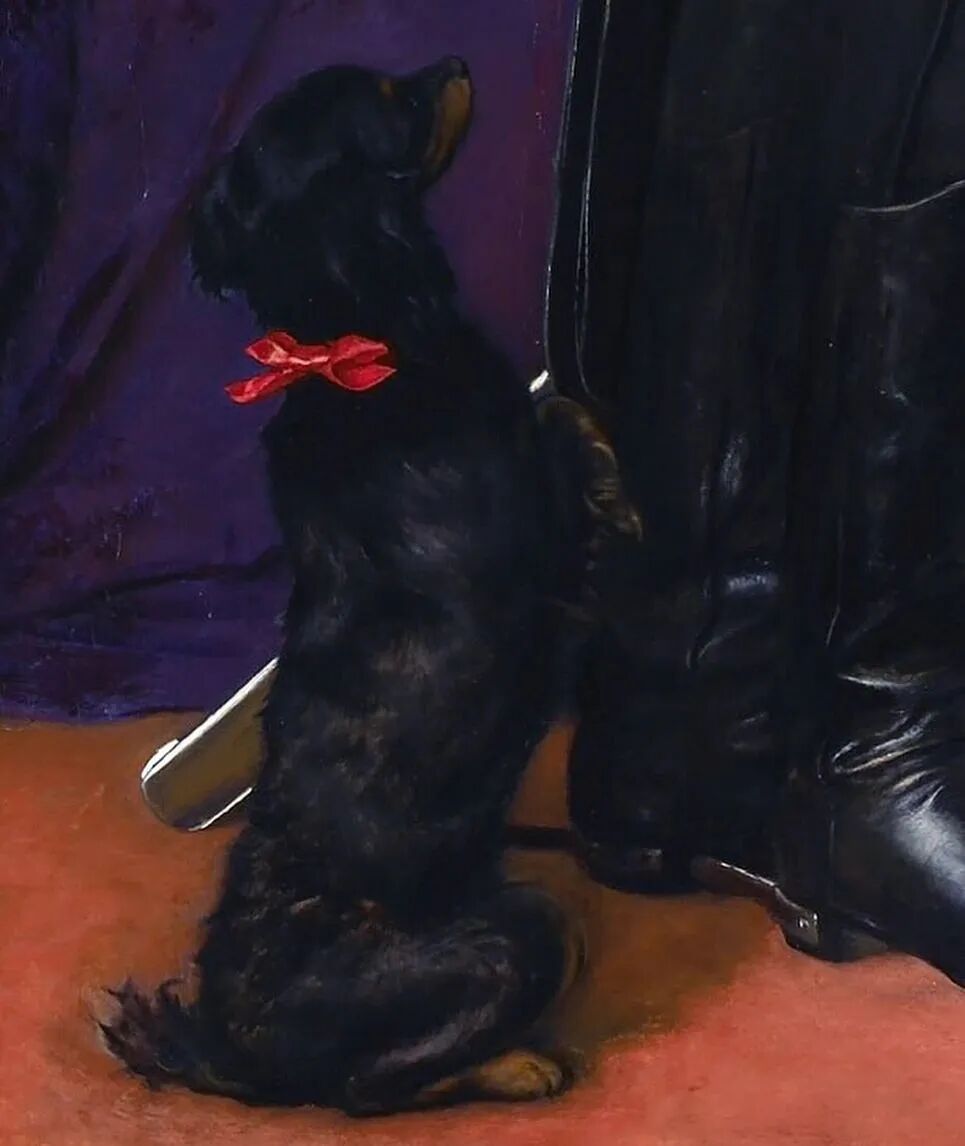 都说女人的第六感是非常敏感的。这位女子一定是意识到了男子此番离开,极有可能命丧黄泉。就连小狗也似乎感觉到了,它前腿抬起,竭力做出的姿势也仿佛在恳求男子不要离去。这条小狗一定是女子饲养的,这一定可以从它戴着的红色围巾看出来。