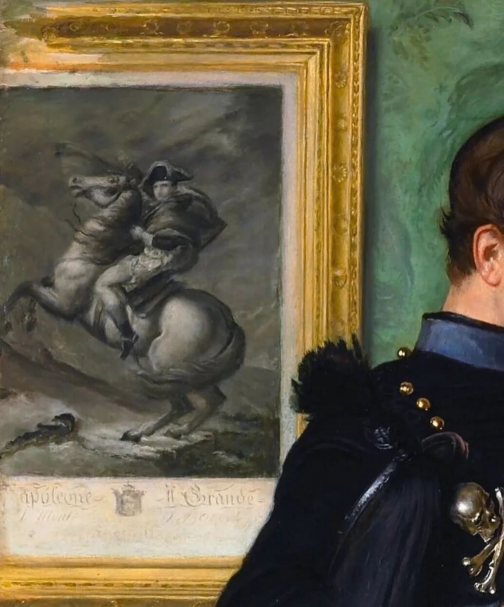 为什么这次离别凶多吉少呢?从墙上挂着的《拿破仑翻越阿尔卑斯山》的画,我们可以得到暗示。这里要提到“Black Brunswickers(黑布伦瑞克军团)”。这个军团是由布伦瑞克的弗雷德里克·威廉公爵(Frederick William Duke of Brunswick)于1809年创建,其成员包括那些对军队忠诚的最优秀的军官。1815年,军团在滑铁卢的夸特布拉斯(Quatre Bras)战役中遭遇惨败,损失惨重。另外,男子手中的骷髅帽也在传递某种不祥的信号。