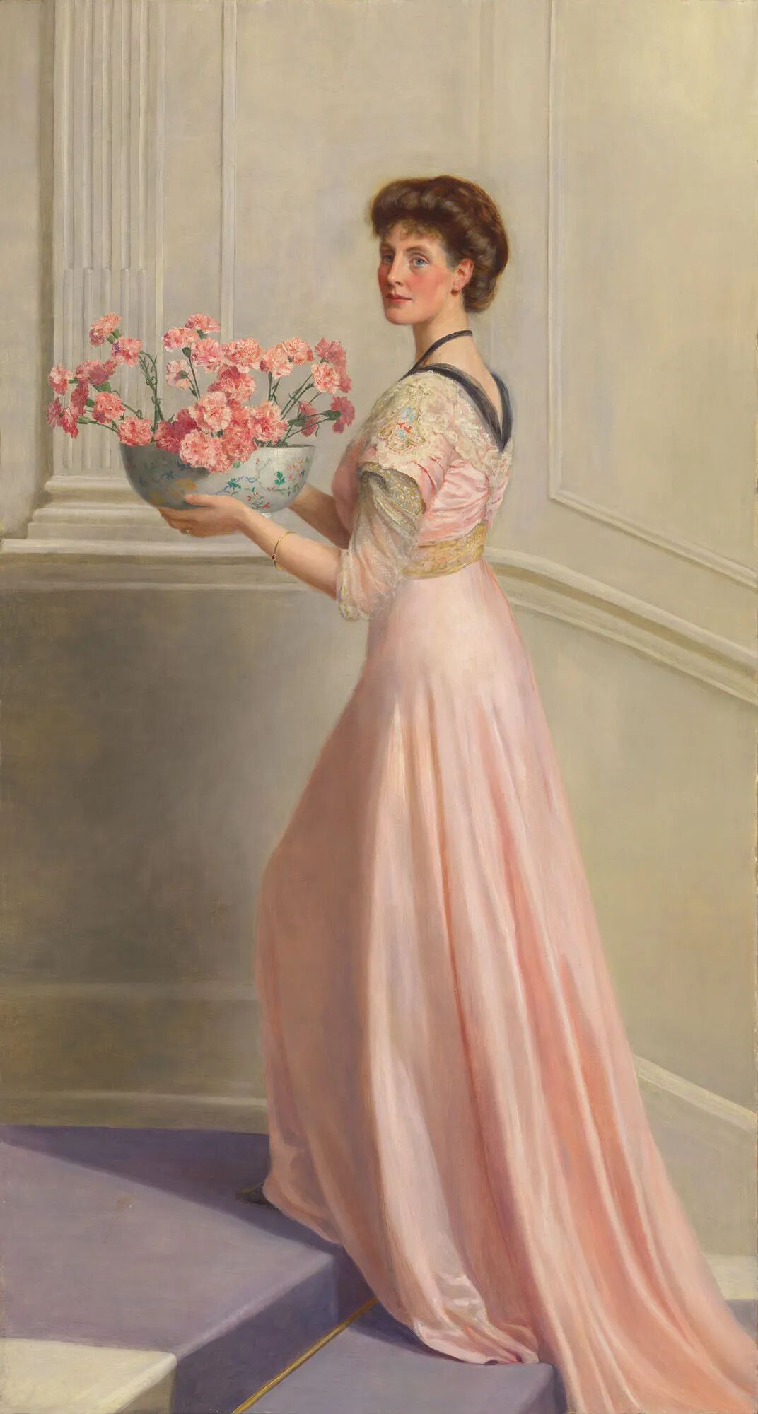 《Portrait of a lady in pink carrying a bowl of pink carnations》