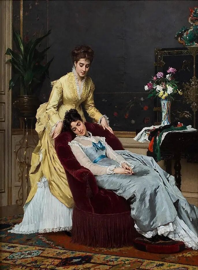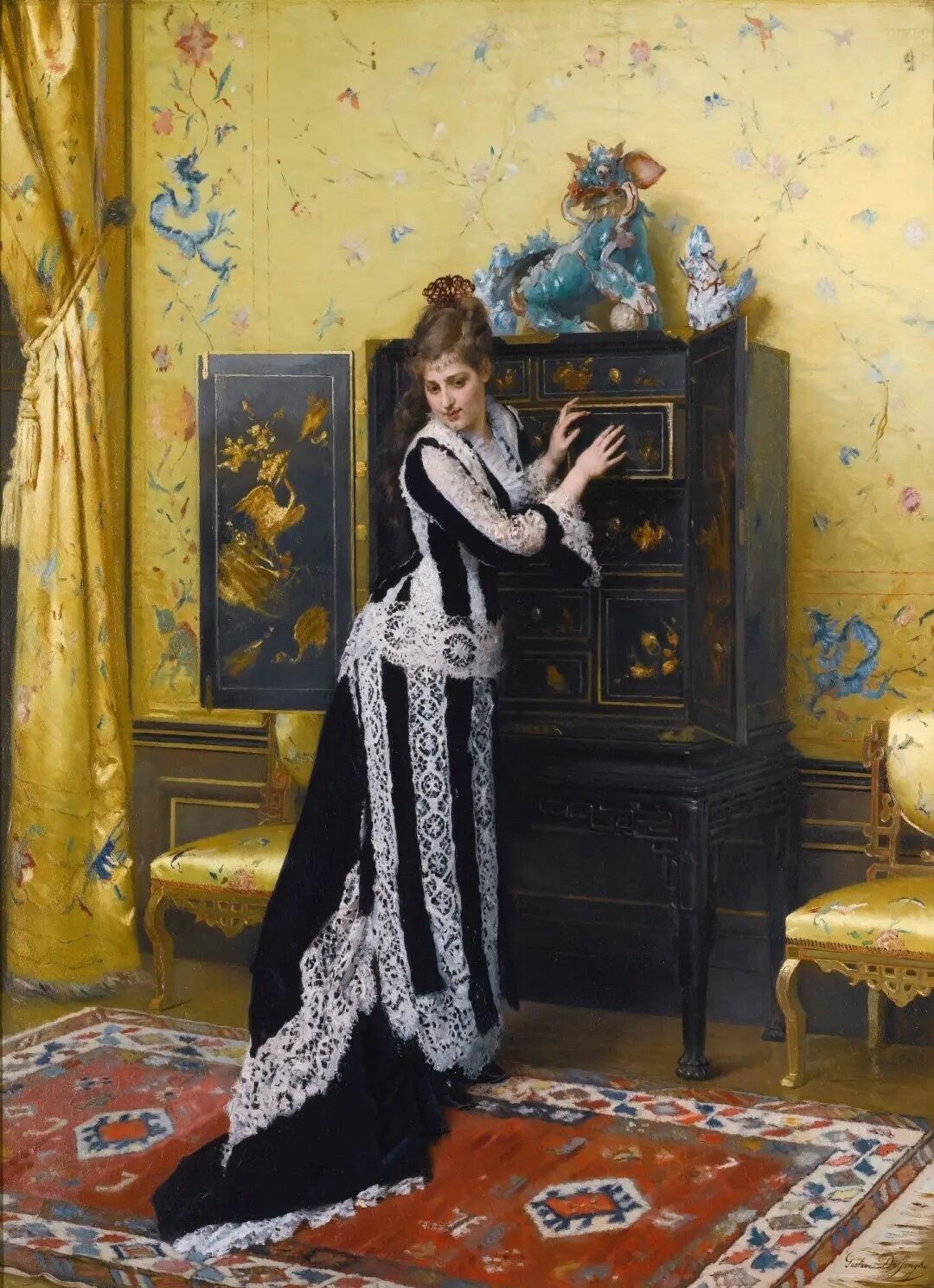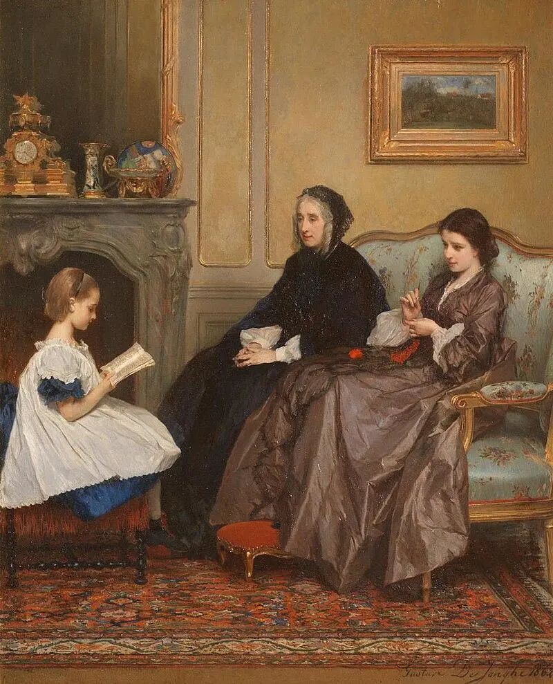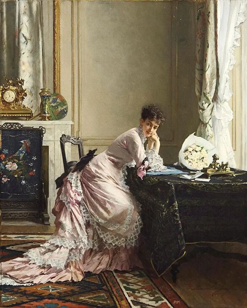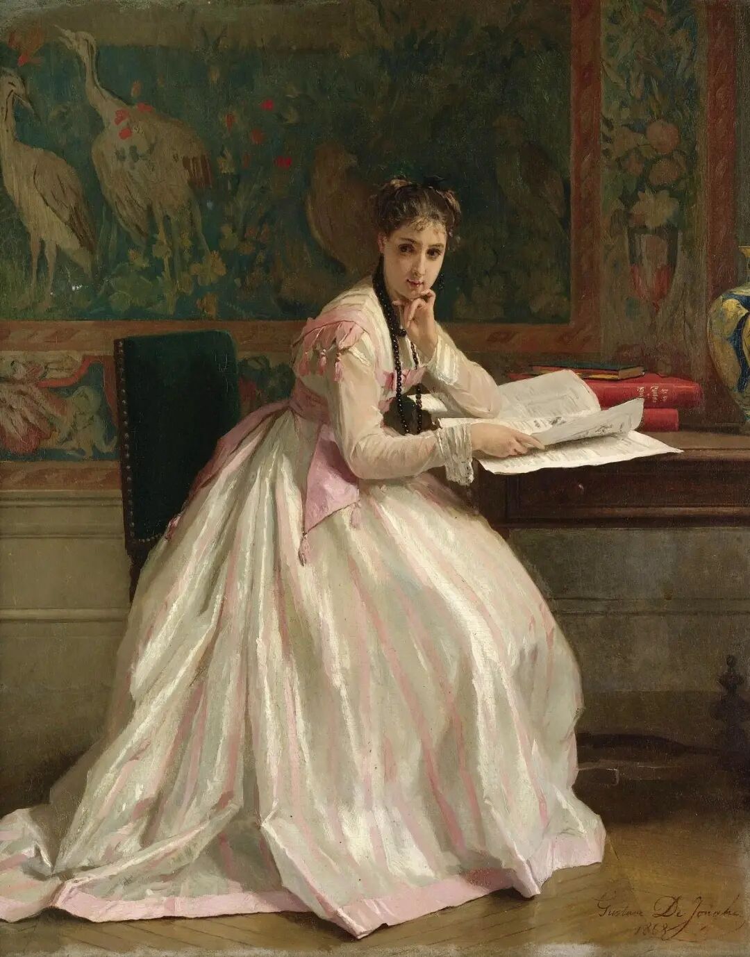Gustave Leonard de Jonghe(古斯塔夫·伦纳德·德·荣格,1829-1893),19世纪比利时画家。他的肖像油画描绘了当代城市居民时尚的生活方式。在1860年代后期在巴黎沙龙这类描绘奢华室内,年轻富有时尚魅力女性的作品开始流行。