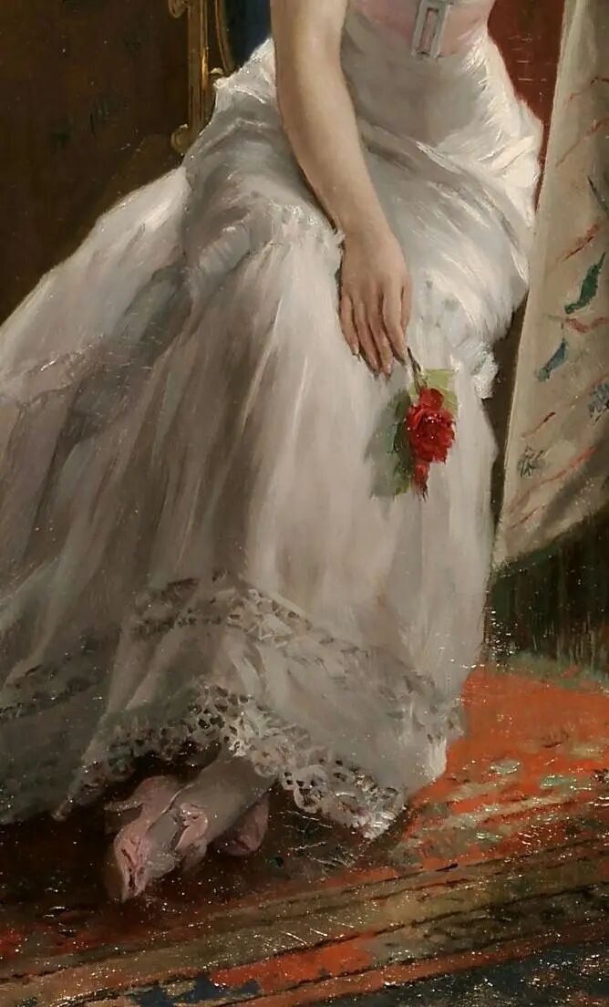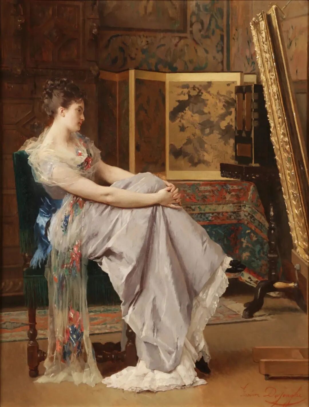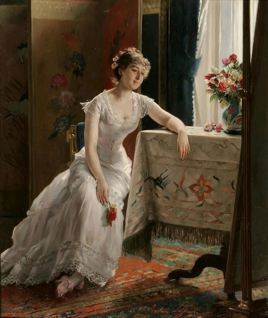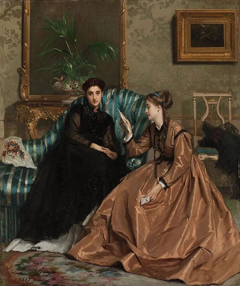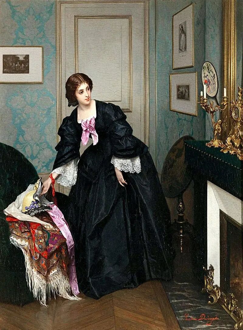 Gustave Leonard de Jonghe(古斯塔夫·伦纳德·德·荣格,1829-1893),19世纪比利时画家。他的肖像油画描绘了当代城市居民时尚的生活方式。在1860年代后期在巴黎沙龙这类描绘奢华室内,年轻富有时尚魅力女性的作品开始流行。