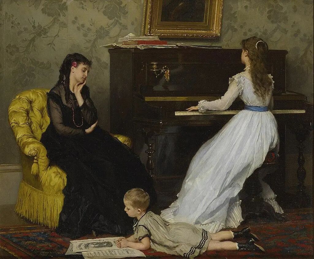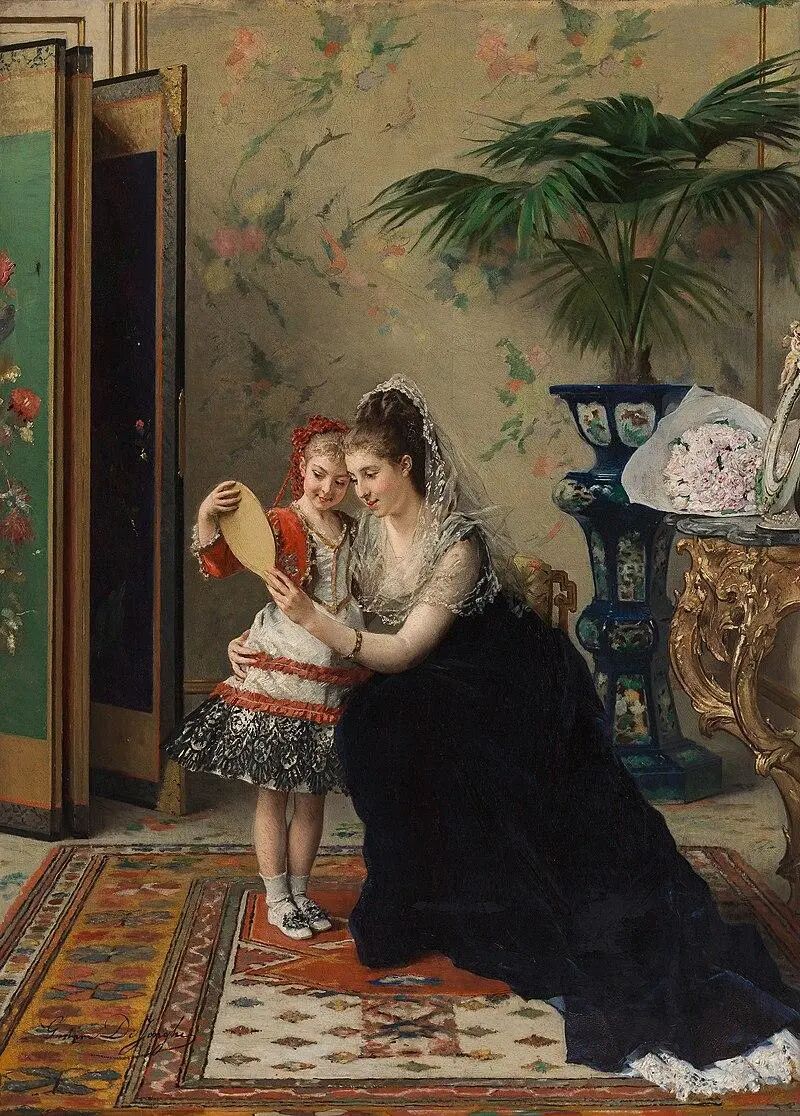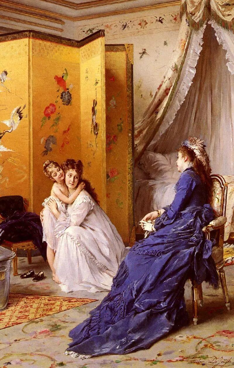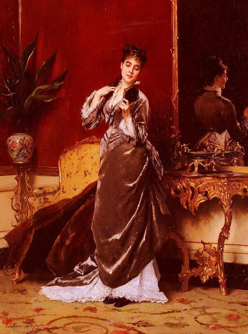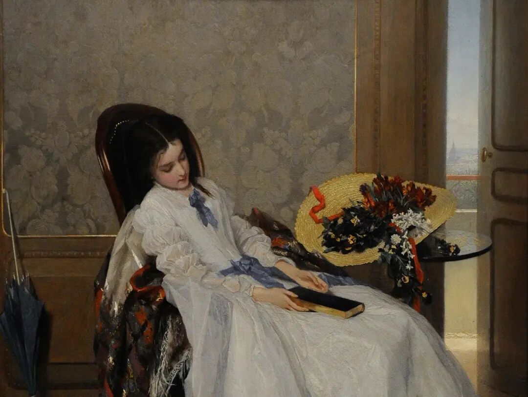 Gustave Leonard de Jonghe(古斯塔夫·伦纳德·德·荣格,1829-1893),19世纪比利时画家。他的肖像油画描绘了当代城市居民时尚的生活方式。在1860年代后期在巴黎沙龙这类描绘奢华室内,年轻富有时尚魅力女性的作品开始流行。