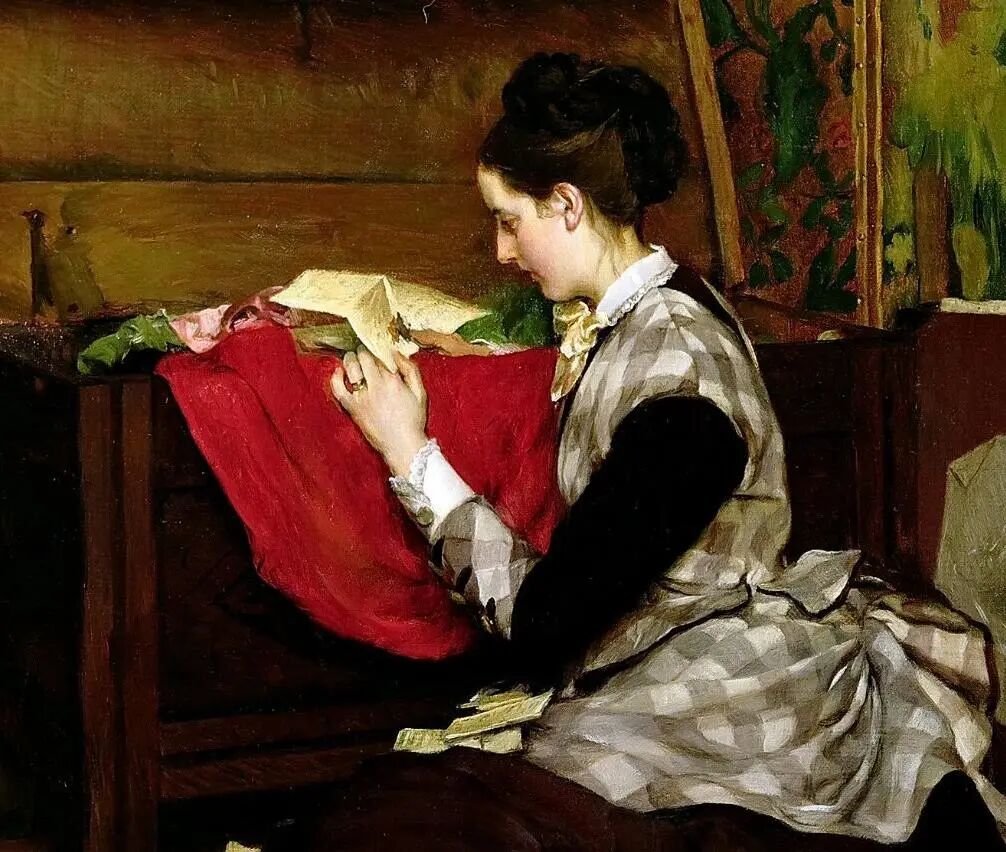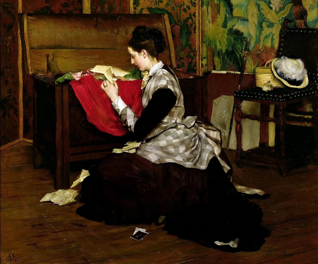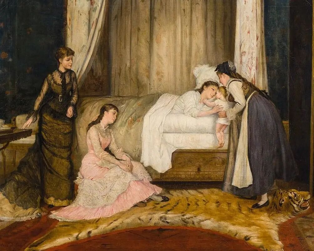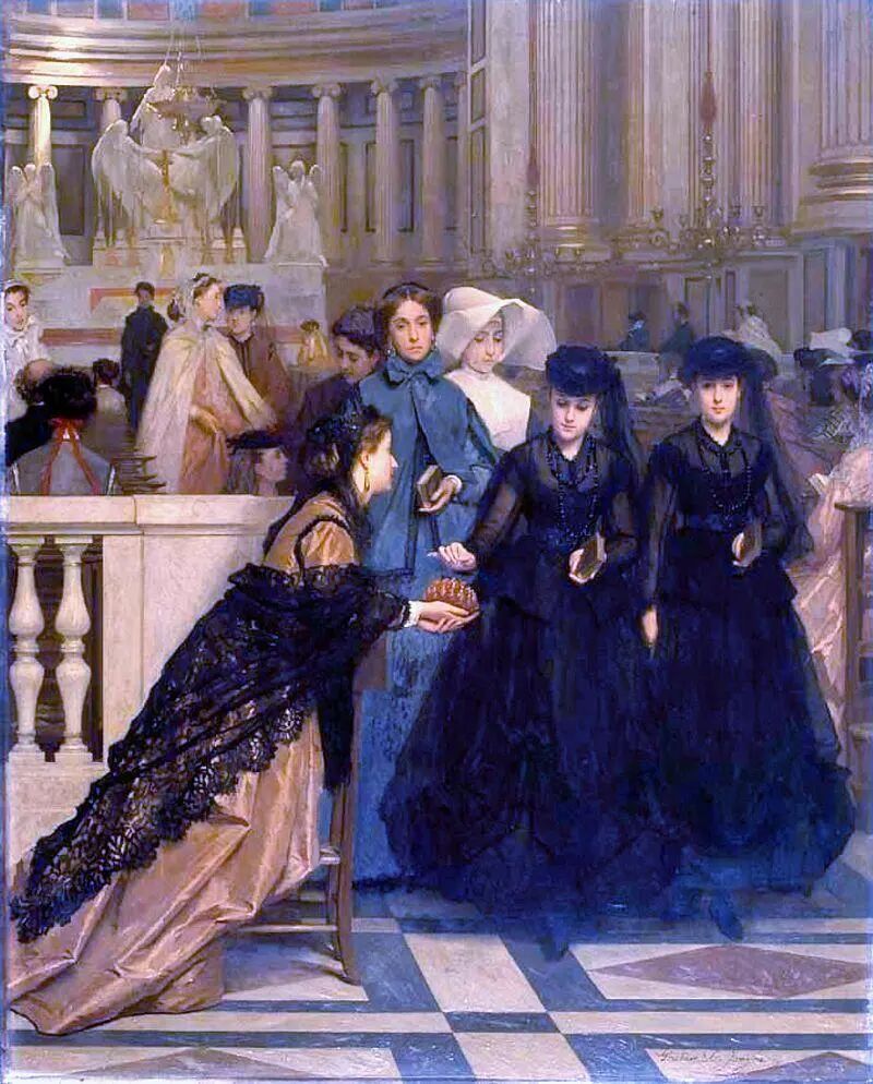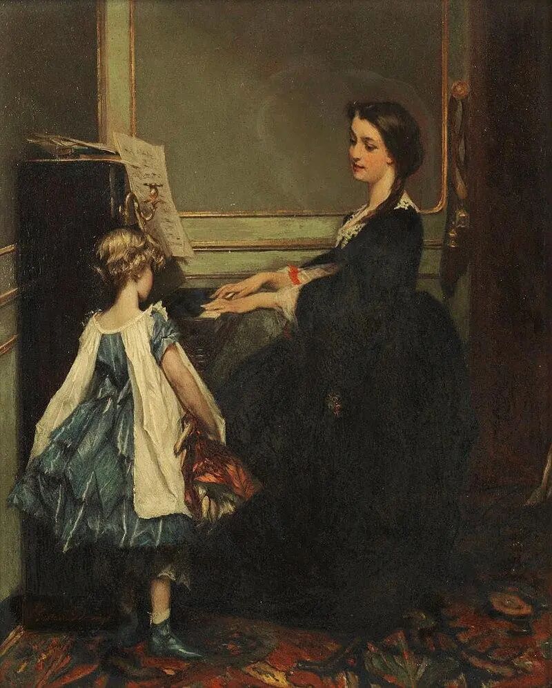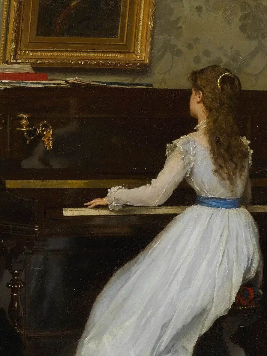 Gustave Leonard de Jonghe(古斯塔夫·伦纳德·德·荣格,1829-1893),19世纪比利时画家。他的肖像油画描绘了当代城市居民时尚的生活方式。在1860年代后期在巴黎沙龙这类描绘奢华室内,年轻富有时尚魅力女性的作品开始流行。
