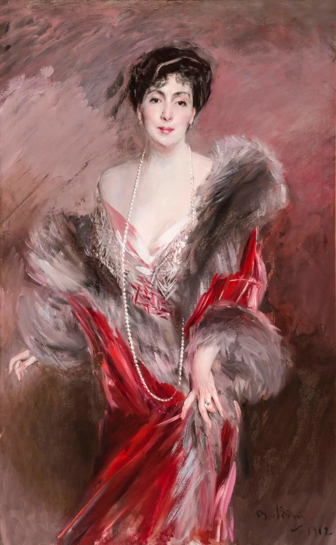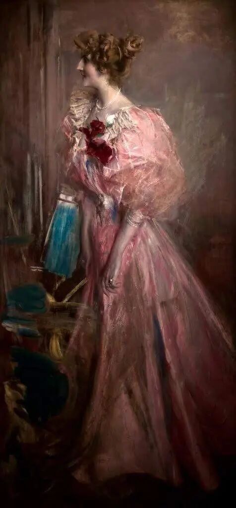 在19世纪末,Giovanni Boldini逐步成为巴黎最有名的人像画家之一,其声势与美国肖像画家萨金特(John Singer Sargent)齐名。尽管当时的肖像画家受到了照相技术的冲击,但博尔迪尼依旧颇受欢迎。他习惯选用大尺寸画布,色彩饱满浓烈。在他的肖像画中,他有意淡化了背景,着重刻画人物的肢体语言,动作比较随意灵动。